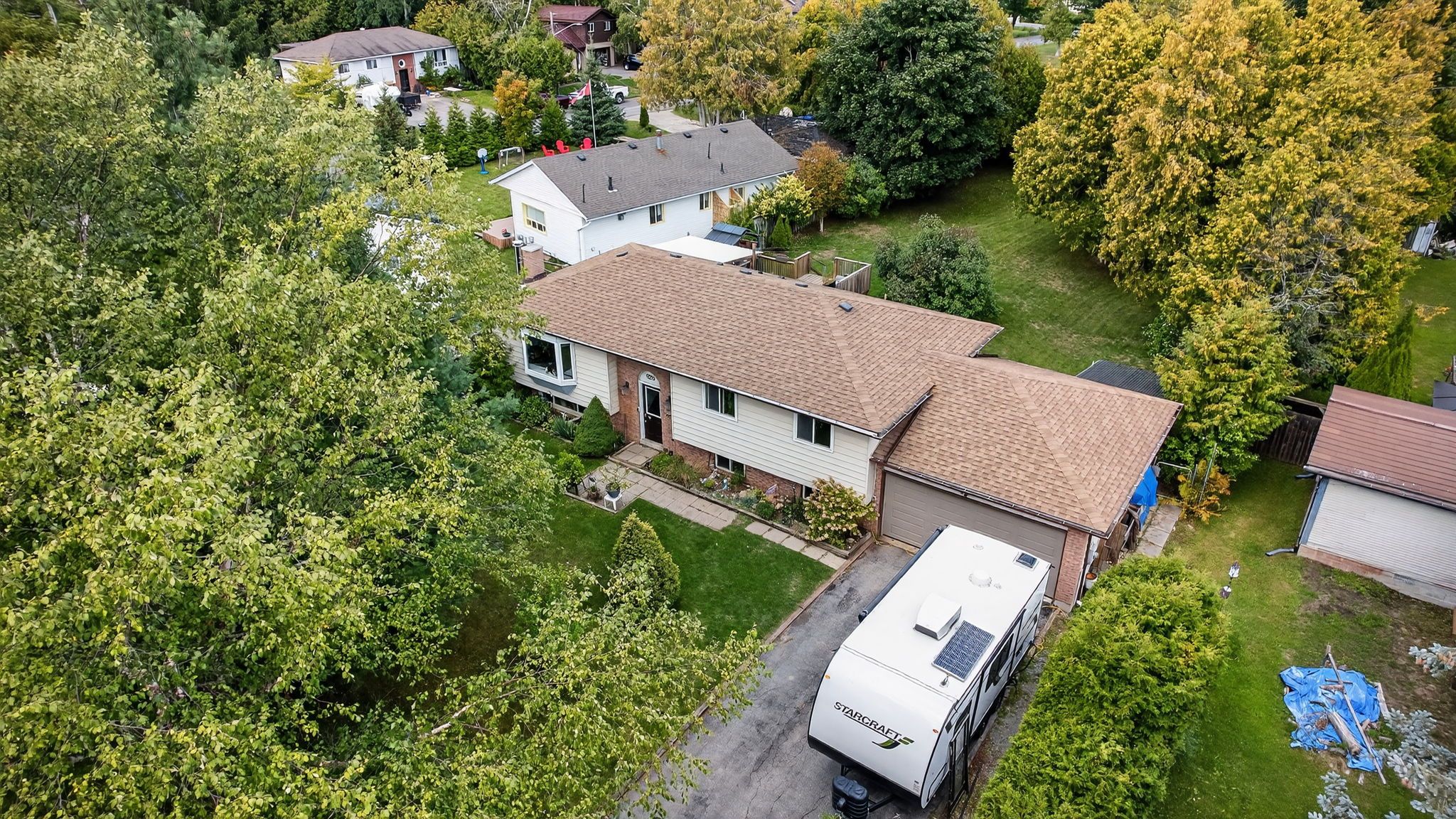 Welcome to this charming and well-maintained home, ideally situated on a beautiful, oversized lot backing directly onto nantyr park. Surrounded by mature trees and lush greenery, this property offers privacy, space, and an unbeatable location just a short walk to the beach and close to all everyday amenities. The main level features three bedrooms and a recently renovated bathroom, along with a bright, updated kitchen complete with a breakfast area and walk-out to a covered porch and expansive deck - perfect for morning coffee or entertaining while overlooking the serene backyard. The partially finished lower level adds excellent flexibility, offering a fourth bedroom, a spacious rec room with potential to be enclosed for an additional bedroom, a 3-piece bathroom combined with a laundry area, and a workshop with large above-grade windows providing plenty of natural light. Cozy up by the gas fireplace in the basement rec room or enjoy the warmth of the wood-burning fireplace in the main floor family room. Additional highlights include a large driveway, double car garage, and a backyard oasis filled with mature trees and plants - a rare find in such a sought-after neighbourhood. As an added bonus, residents have the option to access a private members-only beach for approx. $150/year, offering an incredible lifestyle perk right in the neighbourhood. A wonderful opportunity to enjoy space, nature, and lakeside living in the heart of innisfil.