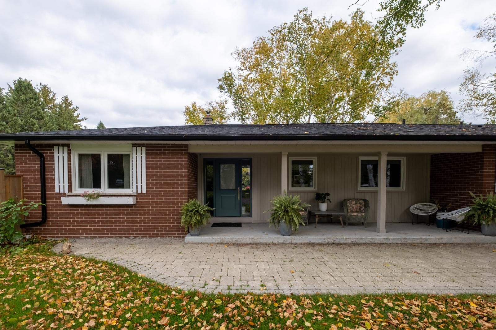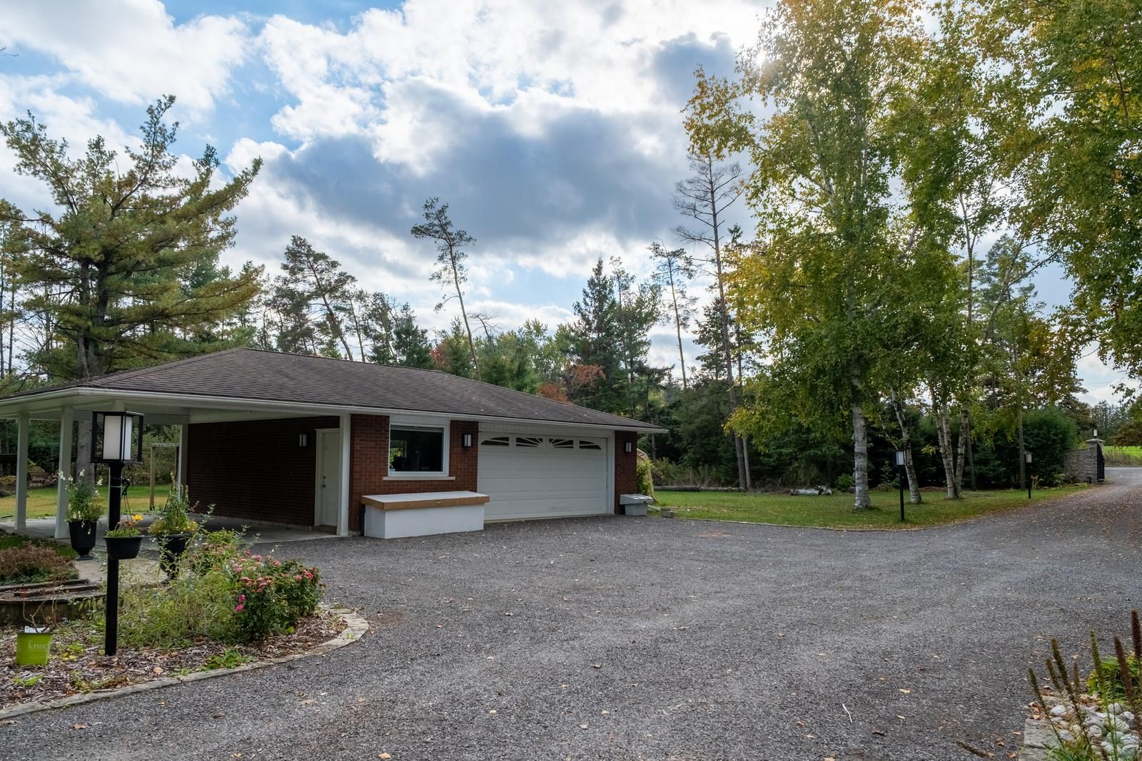 • Large circular driveway with ample parking, two-car garage, and carport.