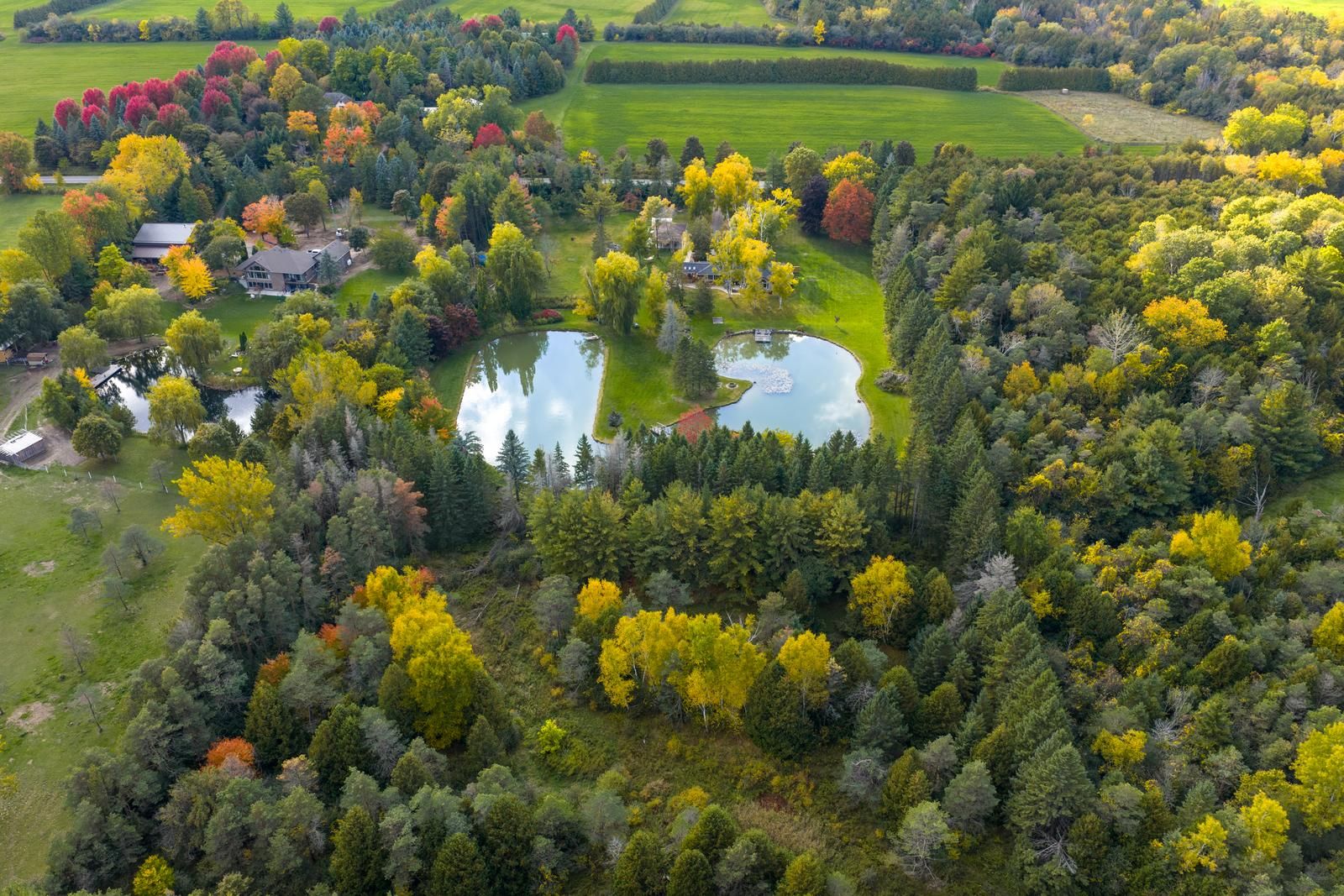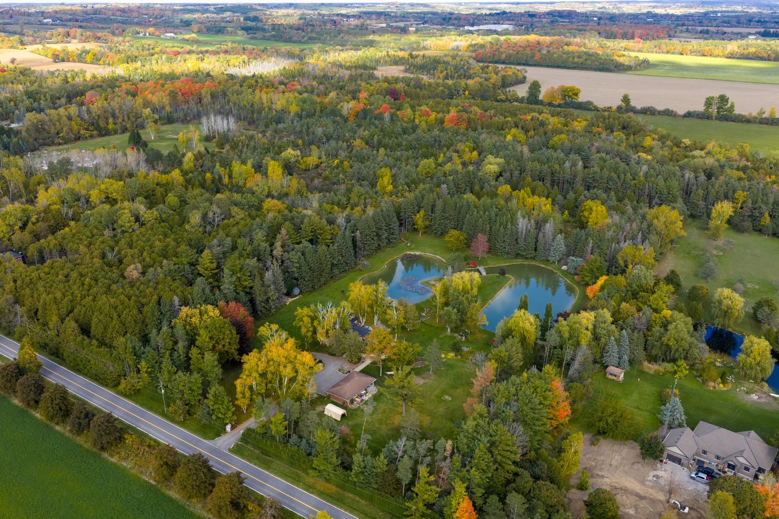 Picturesque, serene, and unassuming, 9285 dagmar is a gorgeous, stunningly renovated, three bedroom bunglalow situated on 13 acres of beautiful, private land! Set back from the road with large hedges and an electronic gate separating you, this enviable home feels completely private. The large circular driveway has ample parking, plus an oversized two car garage and carport. The well proportioned, and open concept, living room, dining room, and kitchen are beautifully renovated with stunning details throughout, featuring: custom millwork, built in cabinetry, a fabulous island in the kitchen, and a vaulted ceiling in the family room, complete with custom wainscotting. The herringbone white oak flooring, and carefully chosen paint colours, compliment the gorgeous stone surround of the wood burning fireplace. As you step through the front door and take two steps into the house, you have a straight line view through the back of the house to the breathtaking scenery behind. Beyond the back deck is a natural, spring fed, pond, charming rounded bridges to cross the water, ample grass to run and play in, and your own private forest. Situated just minutes from the 407, 412, and the 401, the city is easily accessible. In the immediate vicinity, there are several golf courses, ski resorts (dagmar and lake ridge are only 3 minutes away!), parks with walking trails, and downtown whitby is a short drive away. A truly special property!
