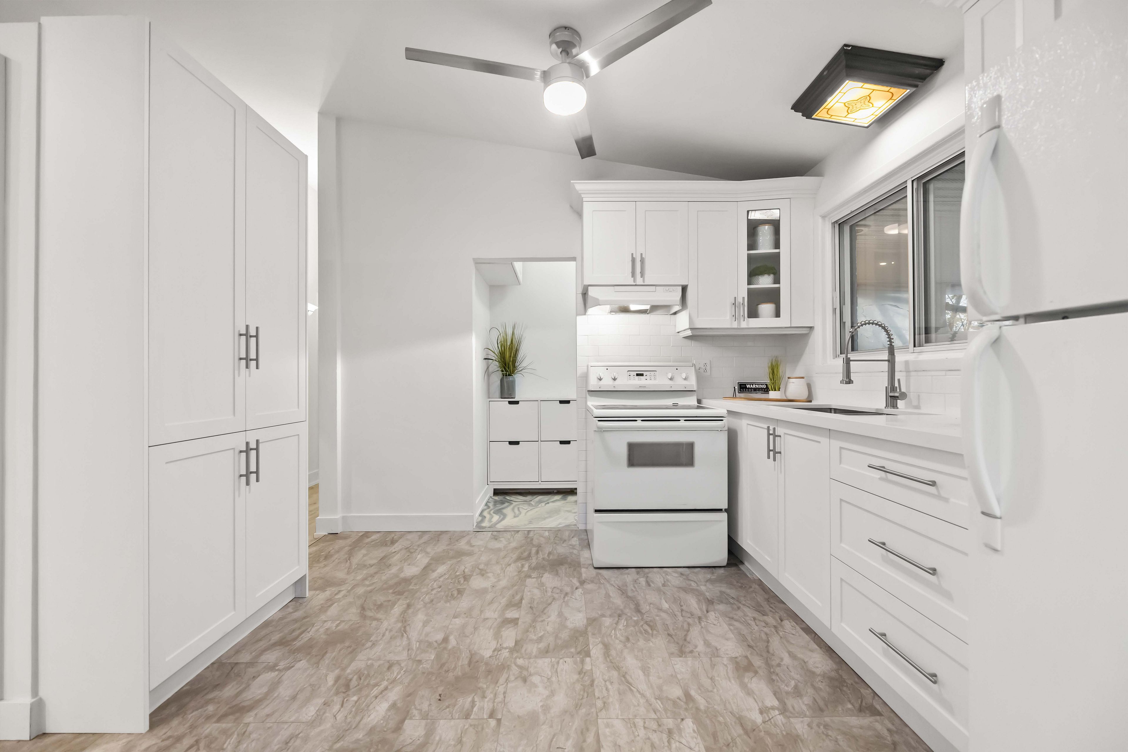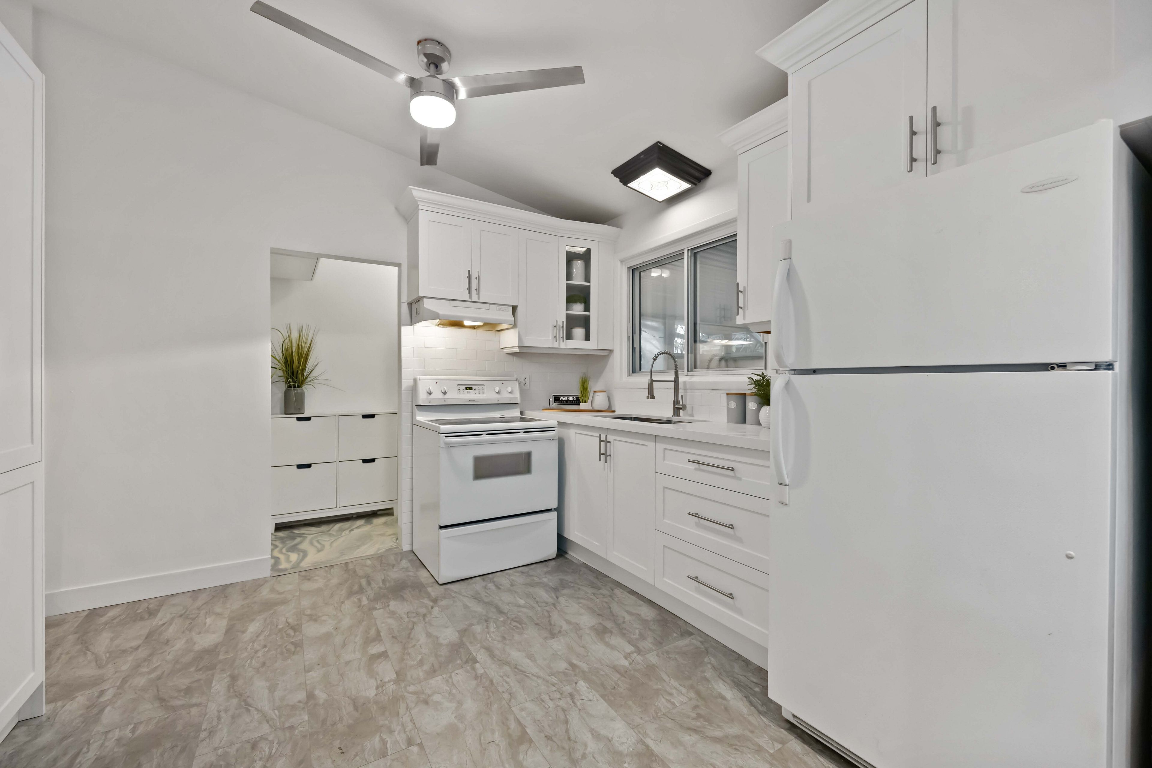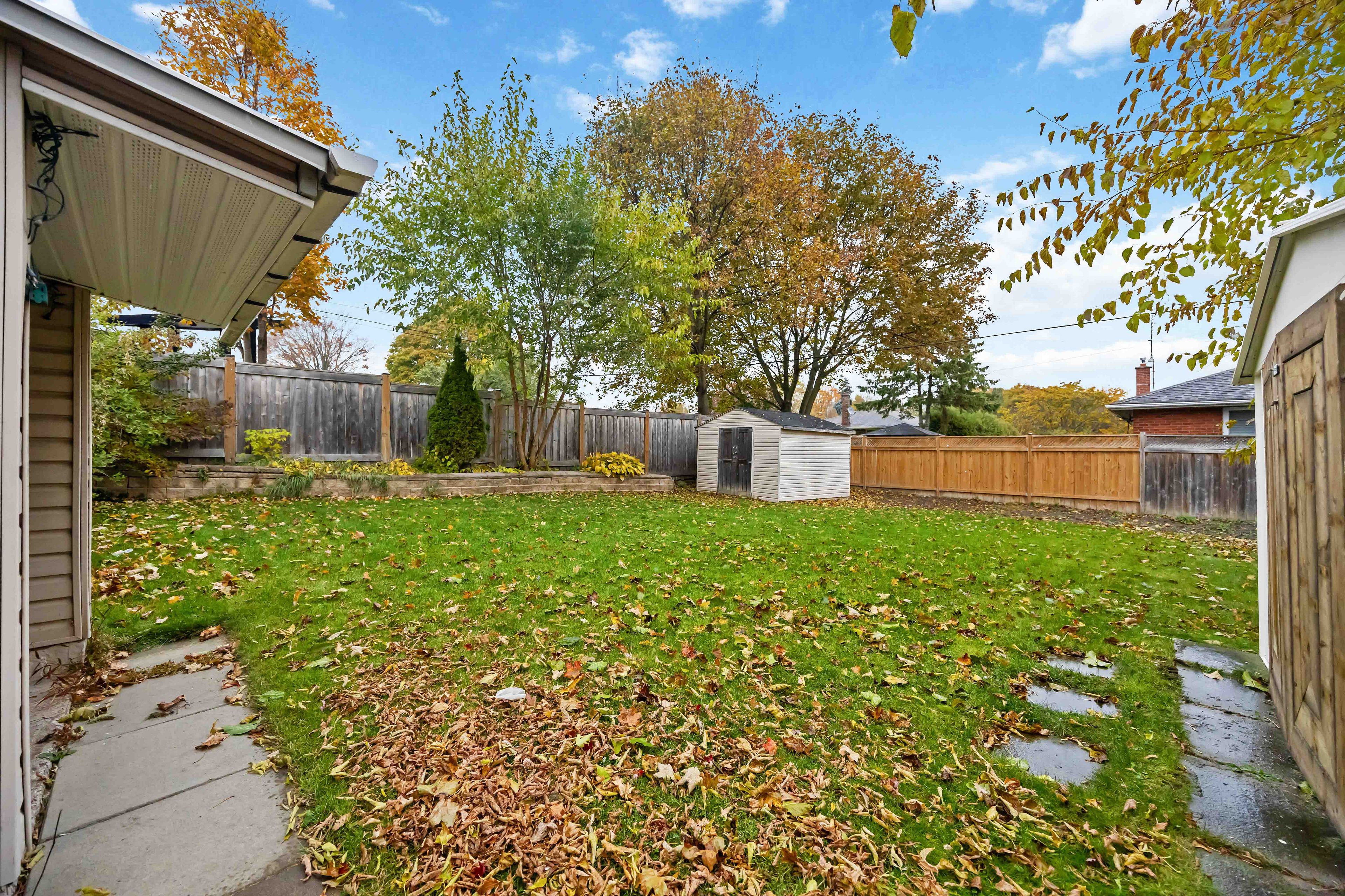 • Private, fully fenced backyard with gardens, storage sheds, and patio space.