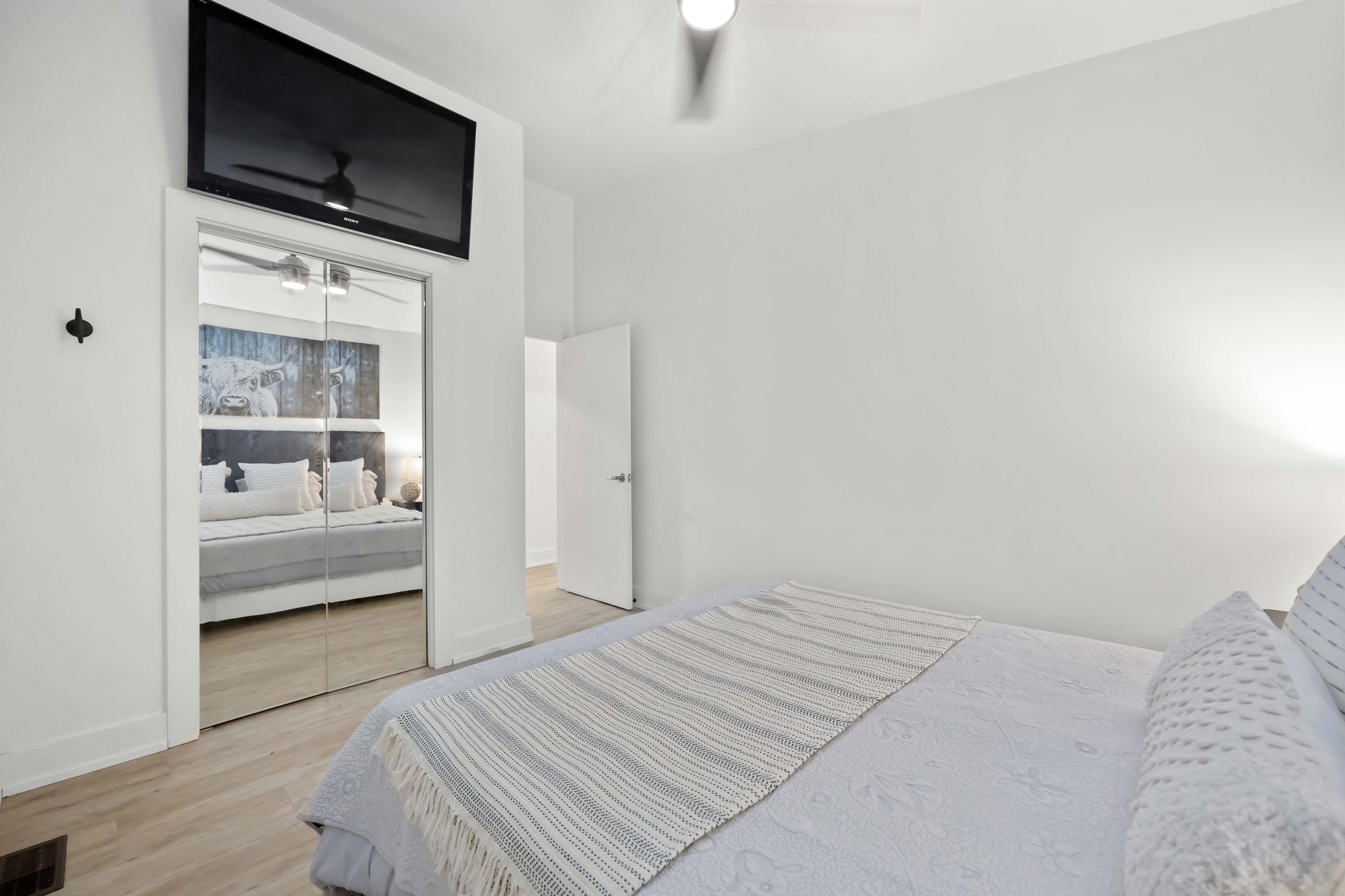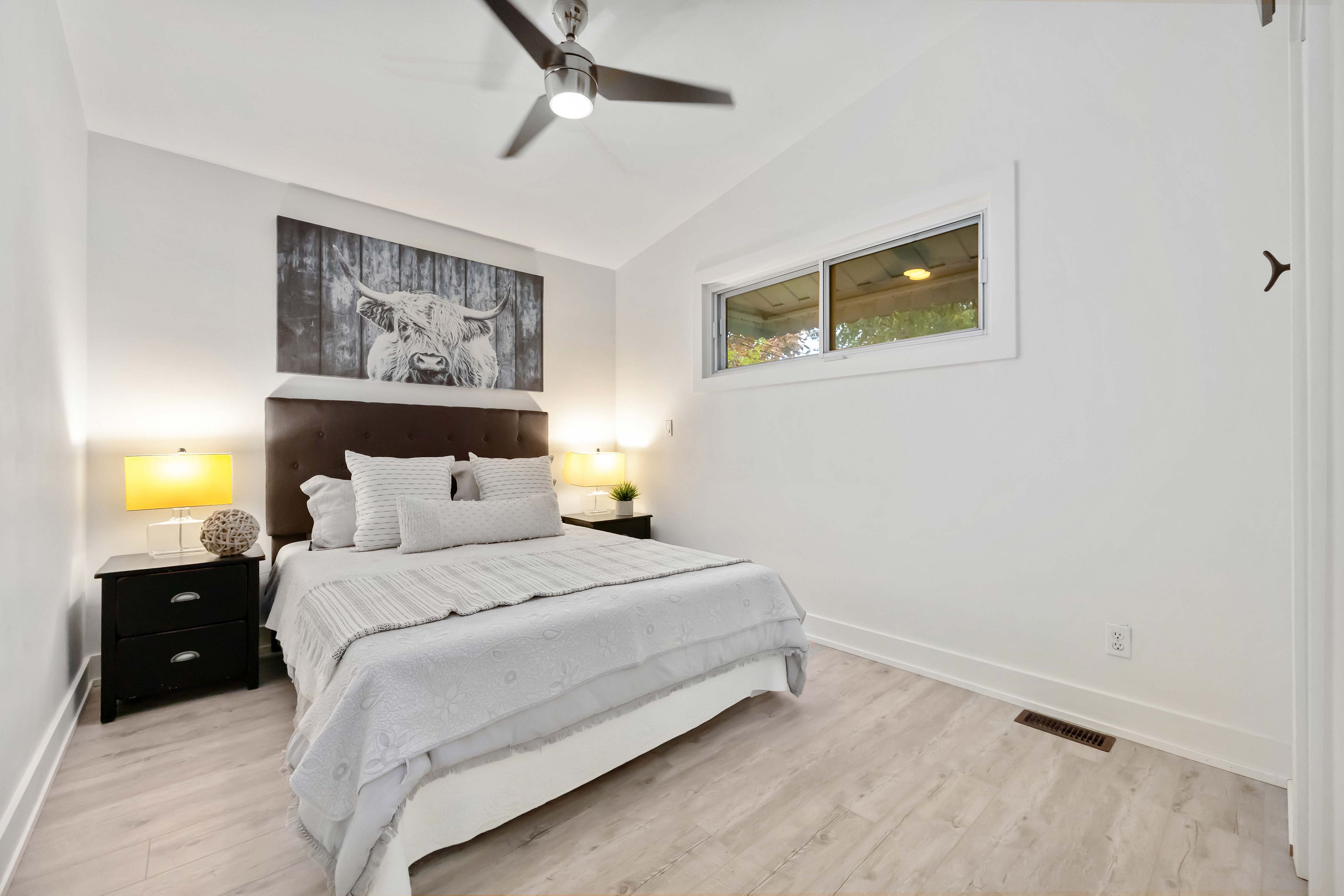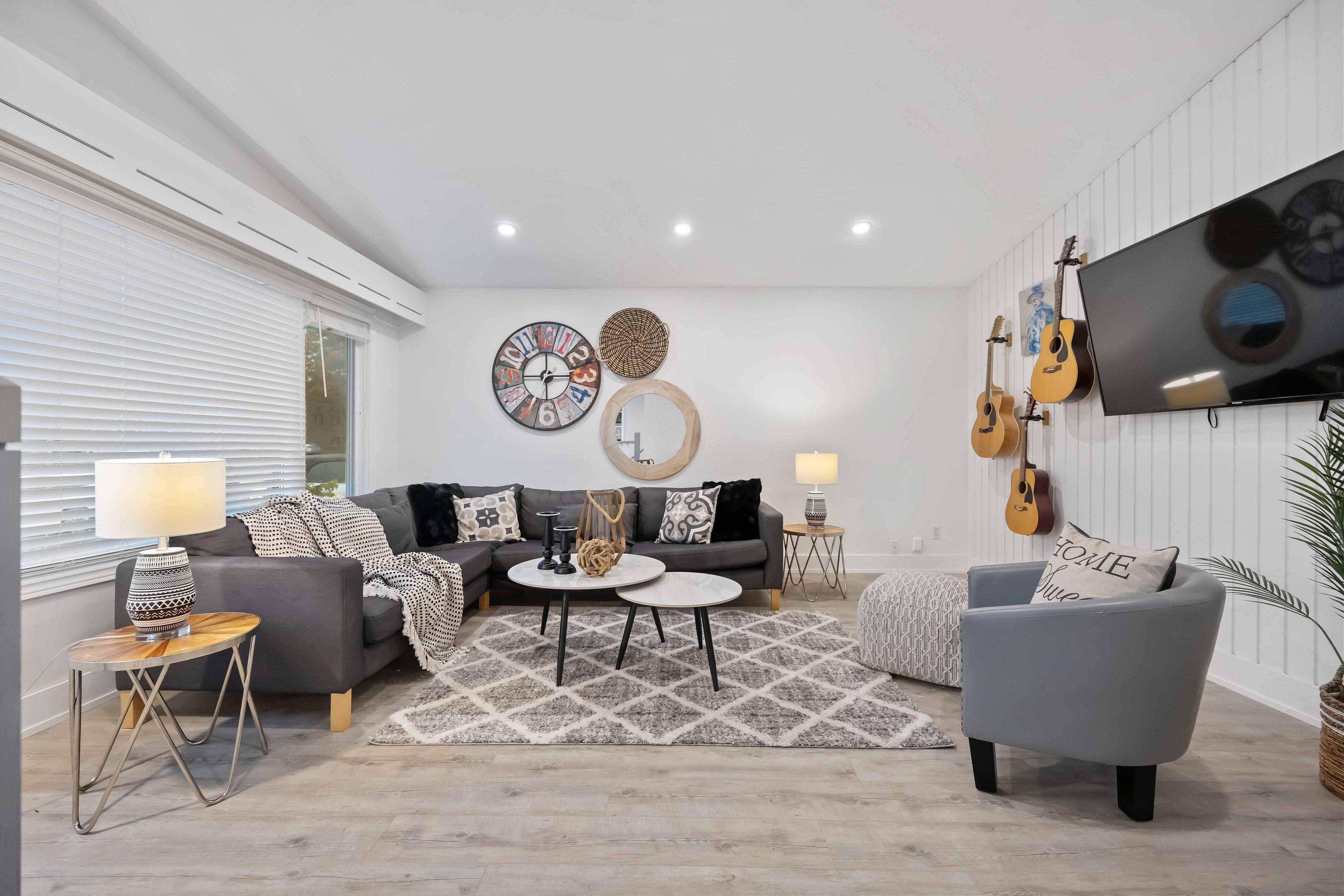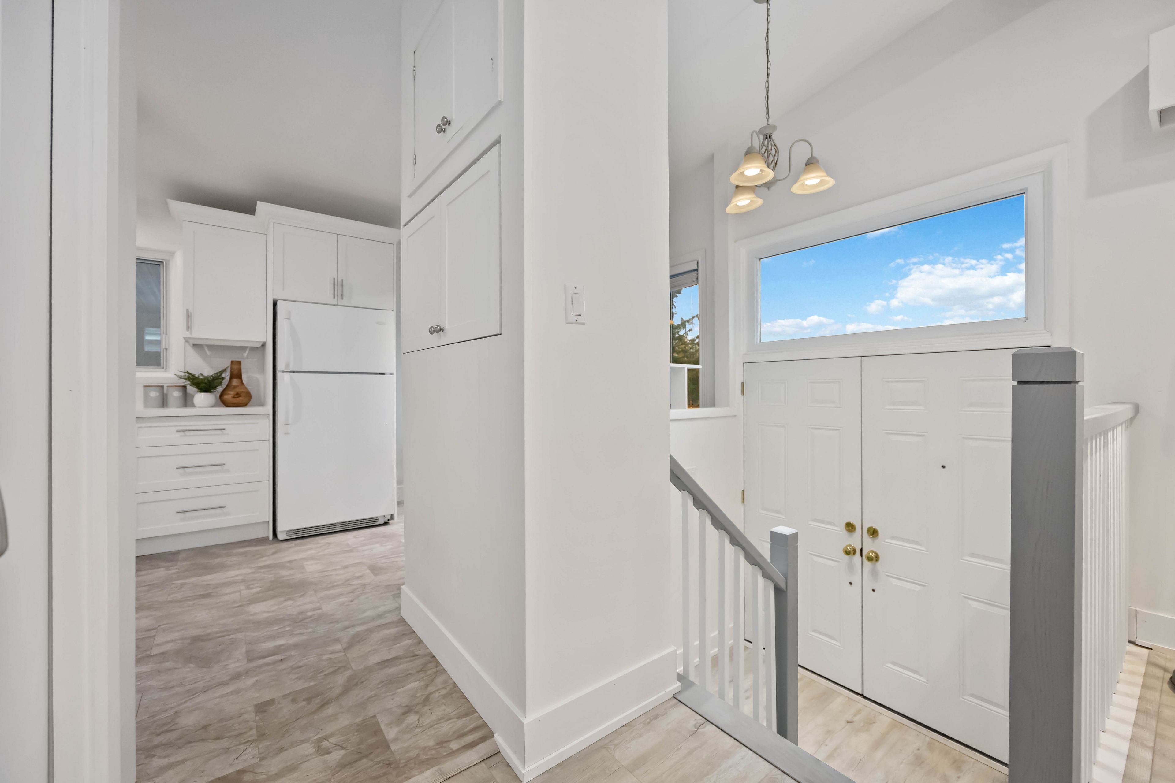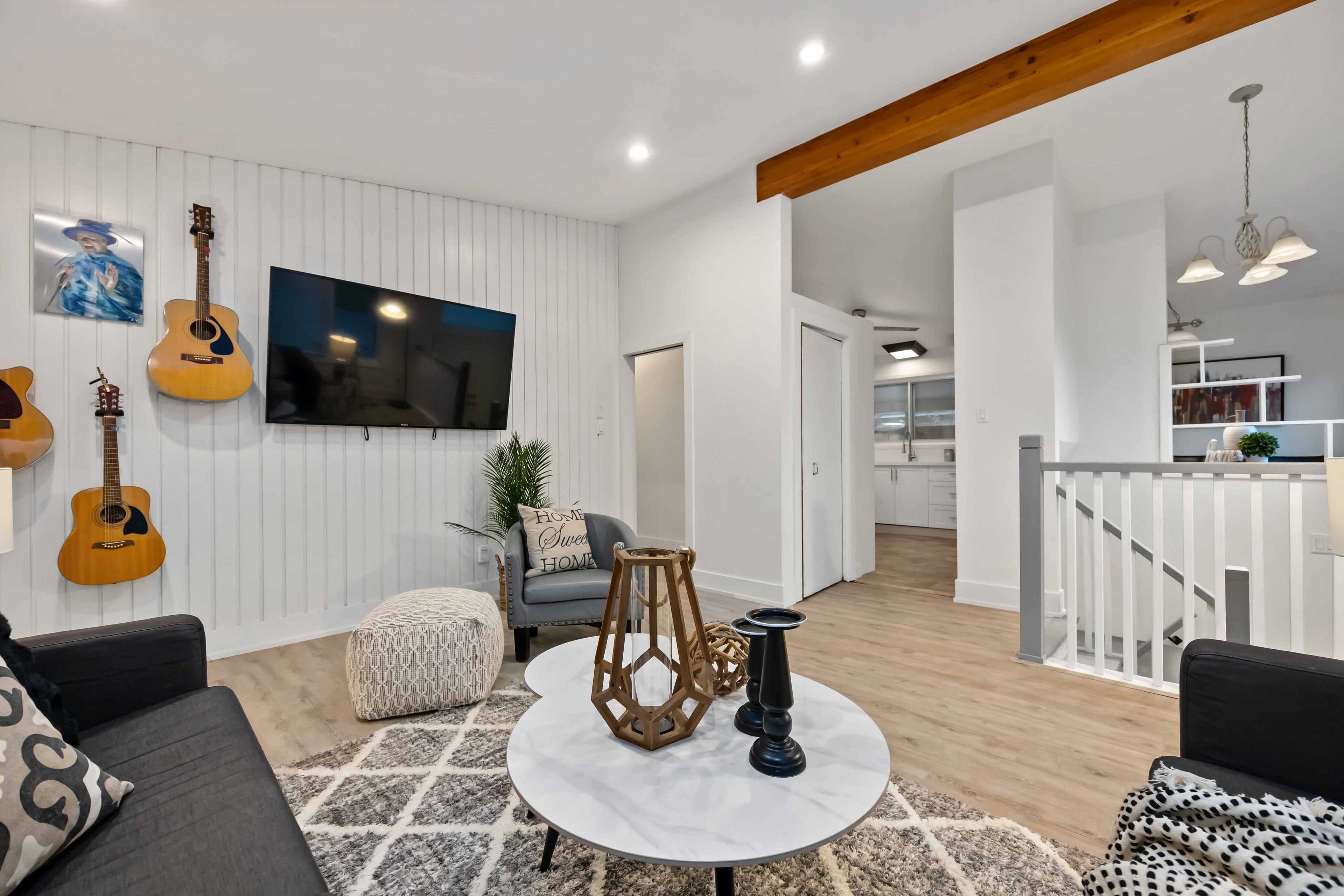 • Main level features open layout with a vaulted beam ceiling and large windows.