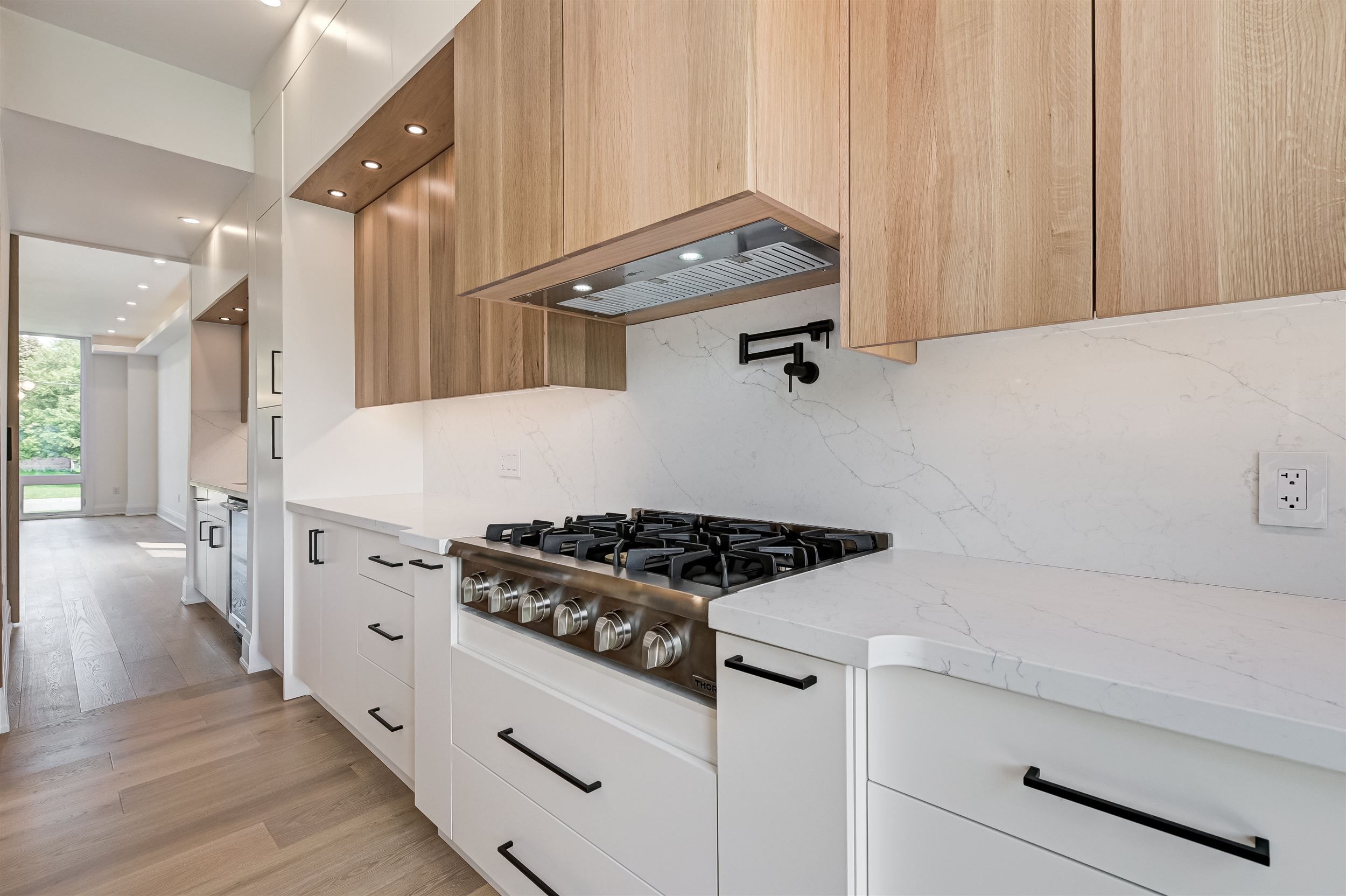 • Luxurious kitchen with oak cabinets and a waterfall island.