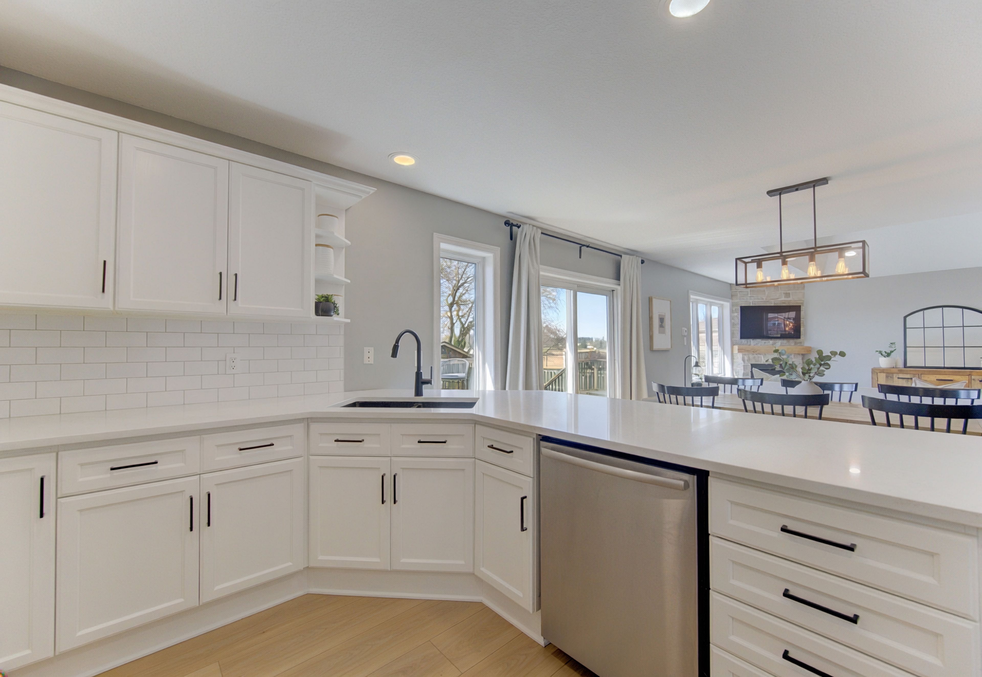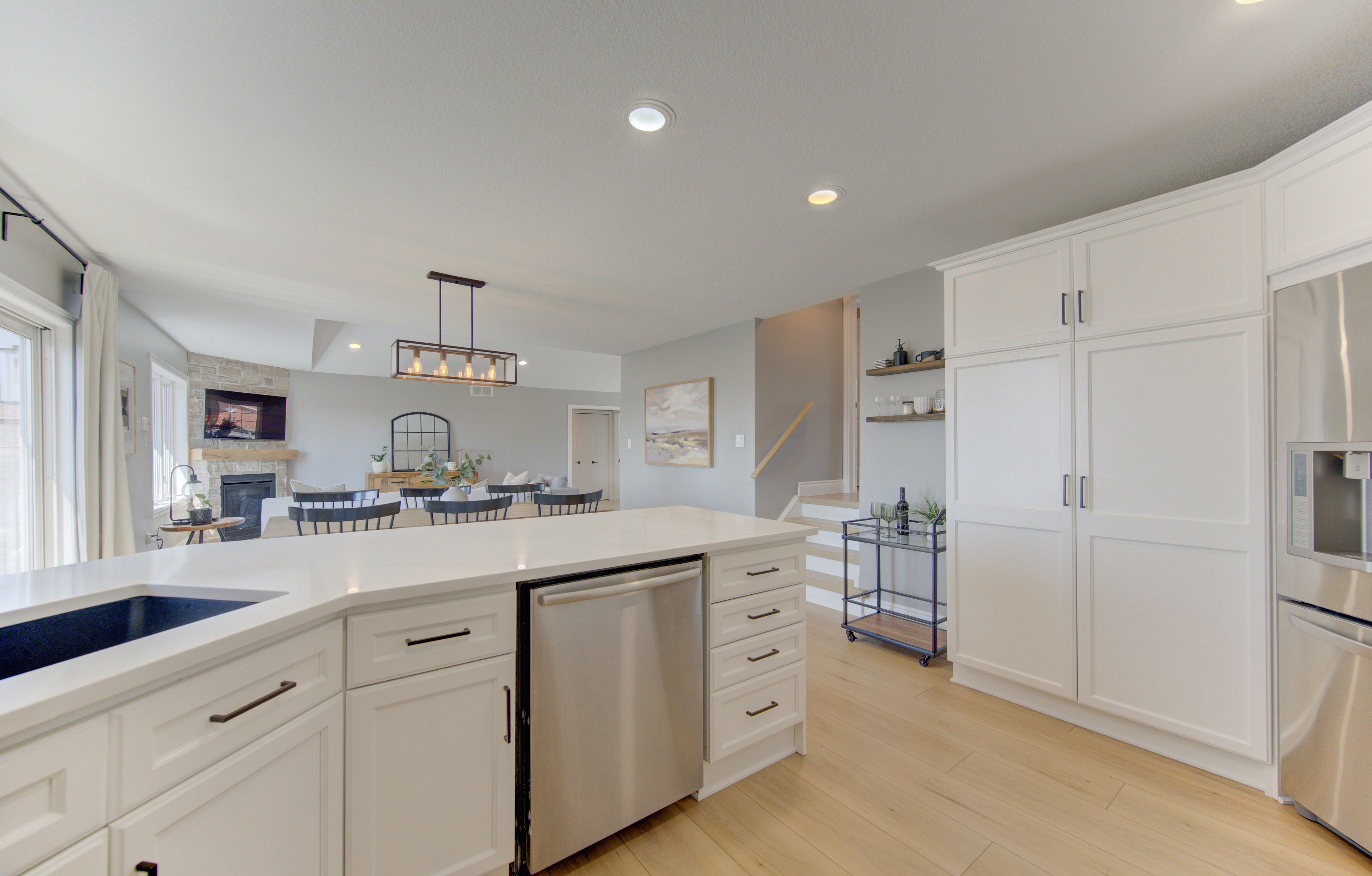 Welcome to this stunning 4-bedroom, 2-bathroom raised bungalow offering modern updates, functional living space, and exceptional comfort throughout. Step inside through the impressive double front doors into a bright and welcoming formal foyer, complete with convenient access to the double attached garage. Upstairs, you'll find a beautifully designed open-concept layout connecting the living room, dining area, and kitchen-perfect for both everyday living and entertaining. The living room is filled with natural light and features a cozy gas fireplace. The adjoining dining area offers sliding doors that lead directly to your private back deck, creating a seamless indoor-outdoor flow. The kitchen is both stylish and functional, showcasing quartz countertops, a trendy backsplash, stainless steel appliances, and a spacious eat-in island with seating for four. The main floor boasts updated luxury vinyl flooring (2024), adding both durability and contemporary appeal. Just a few steps up, retreat to your spacious primary suite, complete with large windows, a walk-in closet with built-in organizers, and a beautifully updated 4-piece ensuite (2023) featuring heated floors for added comfort. Back on the main level, you'll find two additional bedrooms and a fully remodelled 4-piece bathroom. The lower level offers even more living space with a generous rec room-perfect for family gatherings or a home theatre-as well as a fourth bedroom, ideal for guests or a home office. A 3-piece bathroom rough-in is also in place, offering great potential for future customization. Outside, enjoy a fully fenced, private backyard-perfect for relaxing or entertaining. The property also features ample parking for up to four vehicles plus a double attached garage. This move-in-ready home combines modern finishes, thoughtful updates, and a fantastic layout-all in a desirable wellesley location.