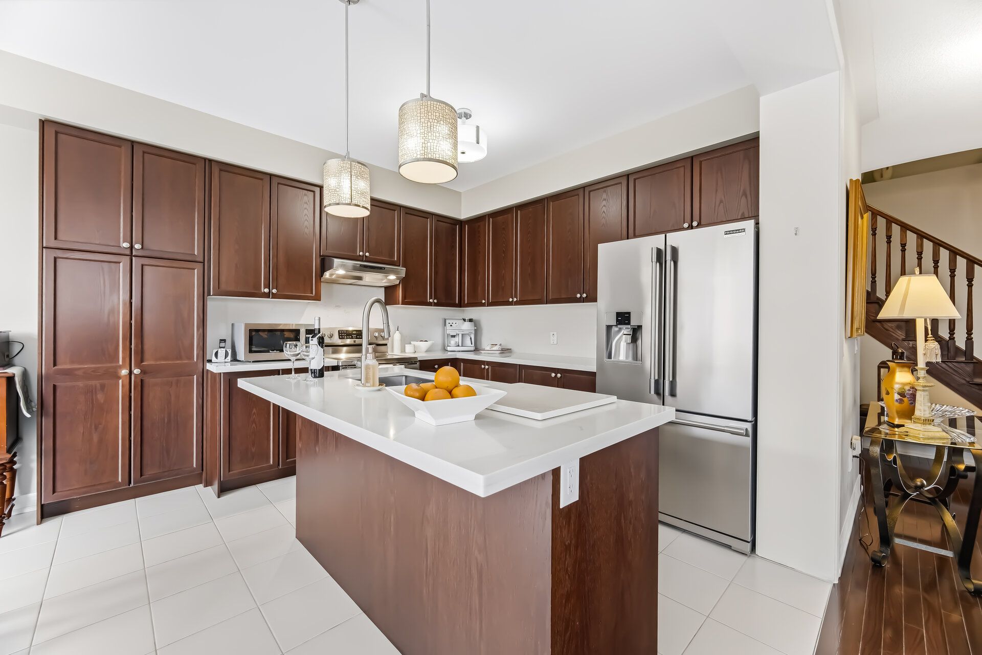 • Chef's kitchen featuring oak cabinetry, quartz countertops, and stainless steel appliances.