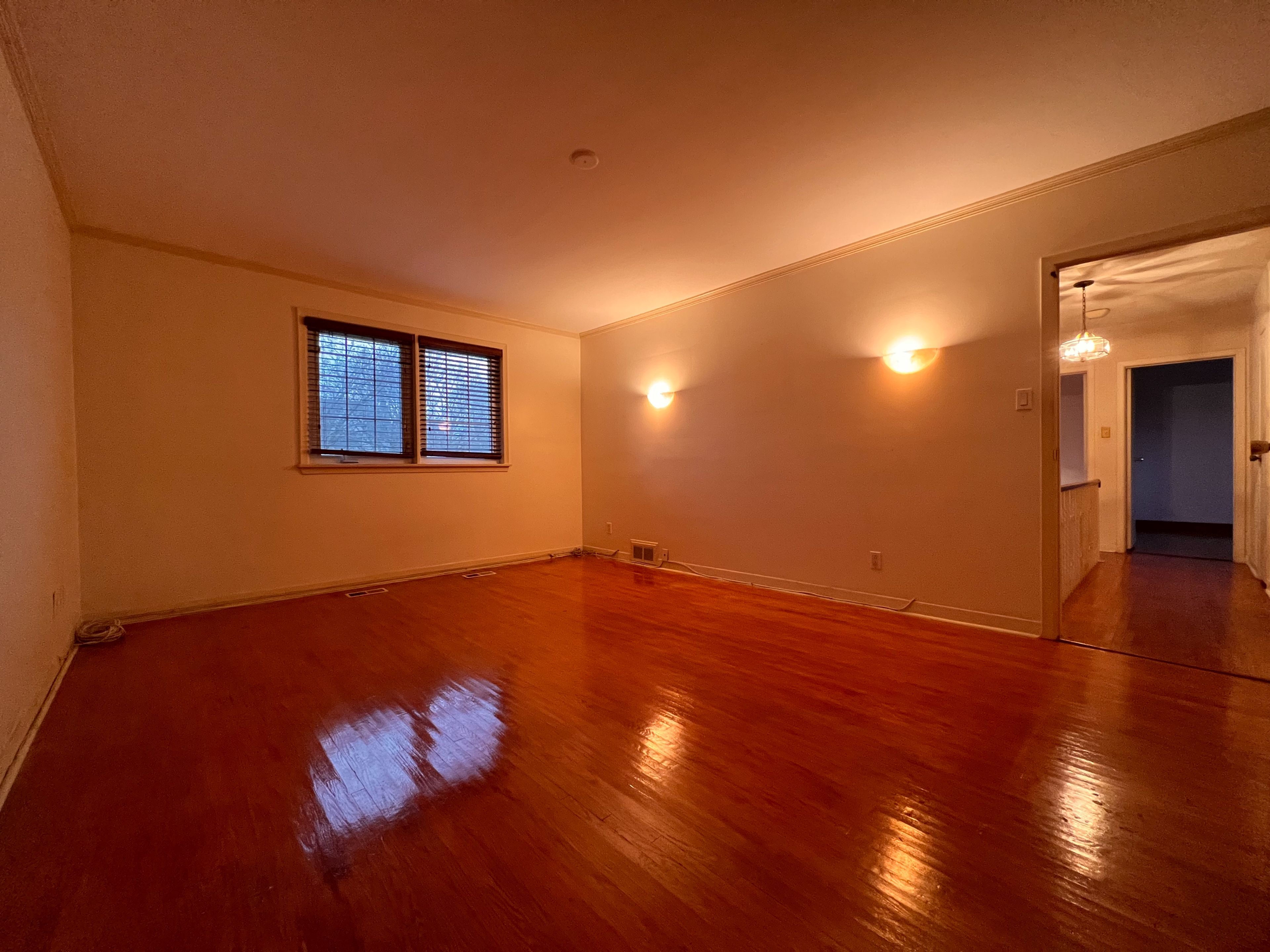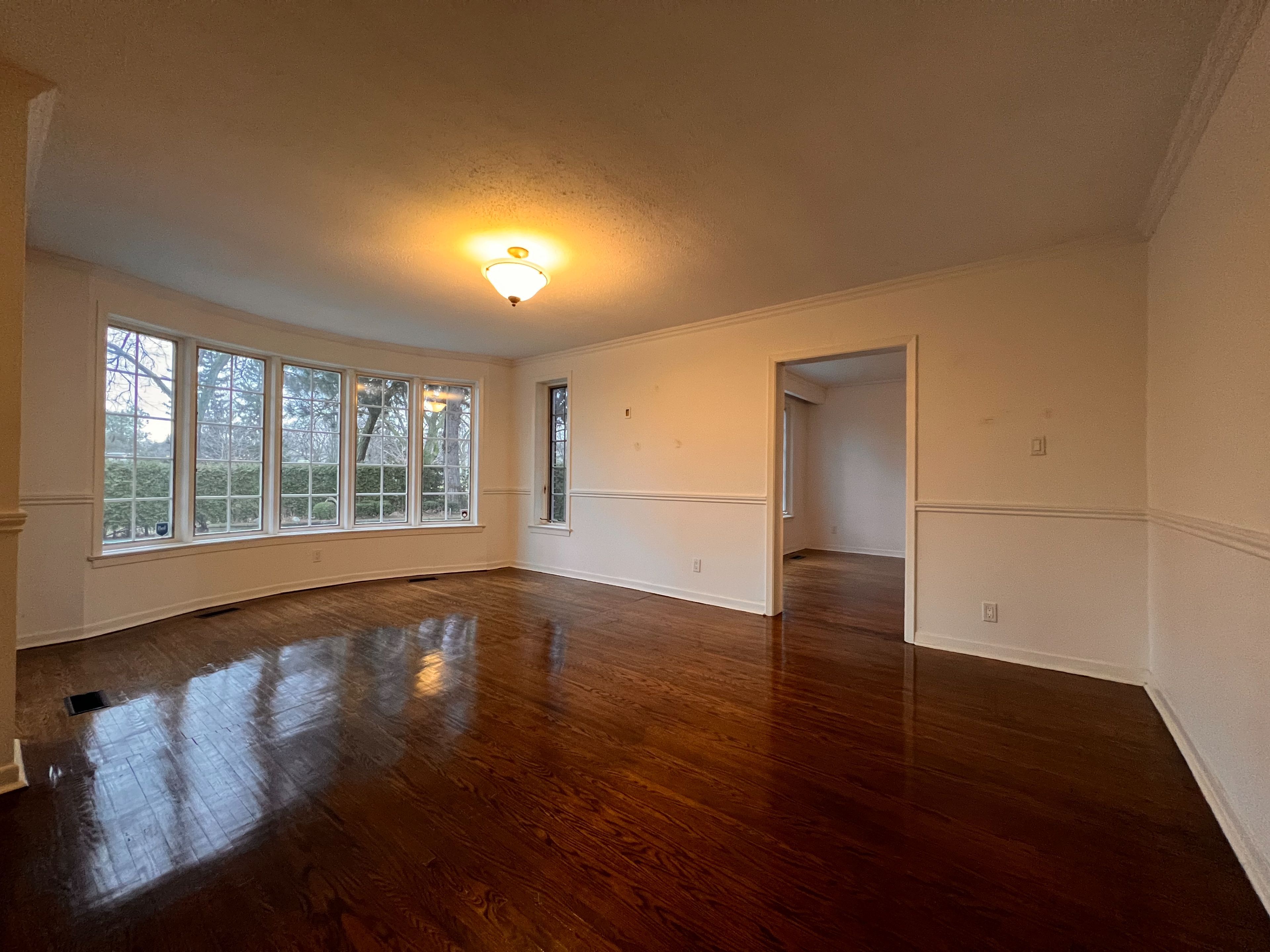 • Bright living room featuring a bay window and hardwood floors.