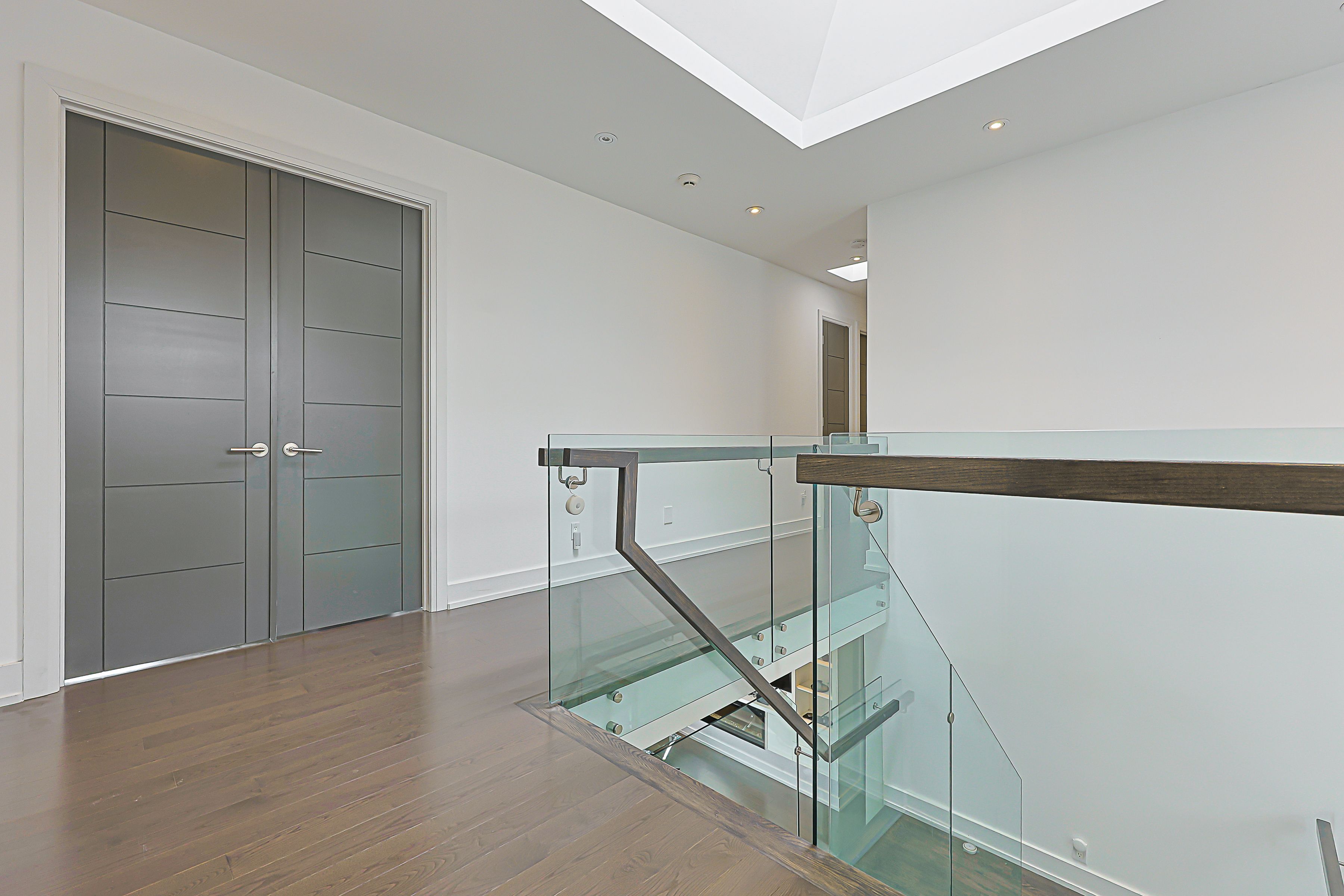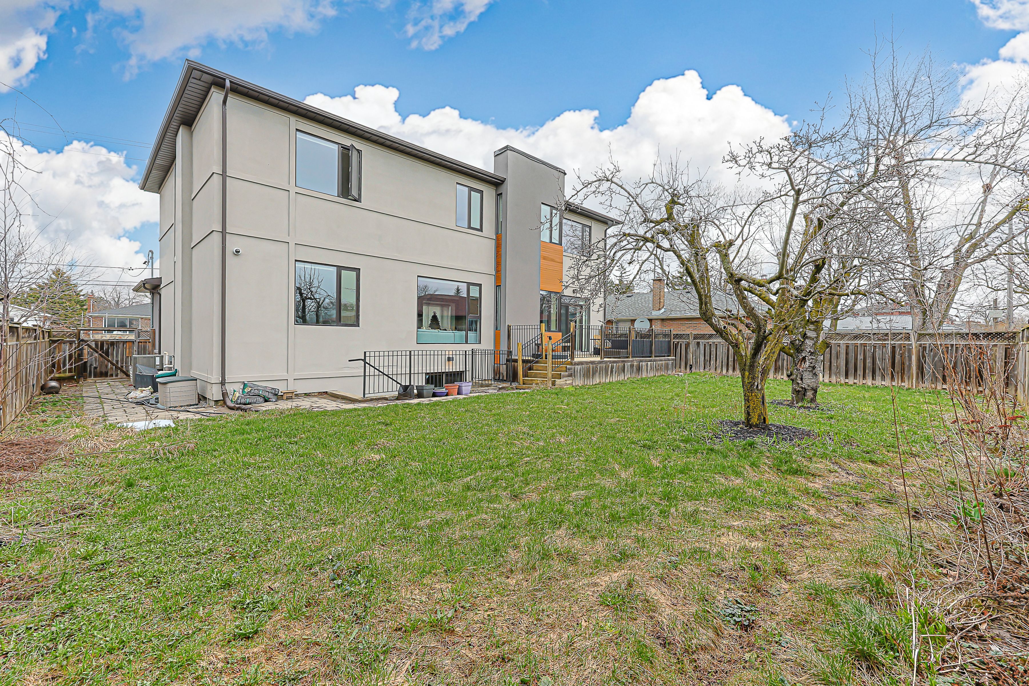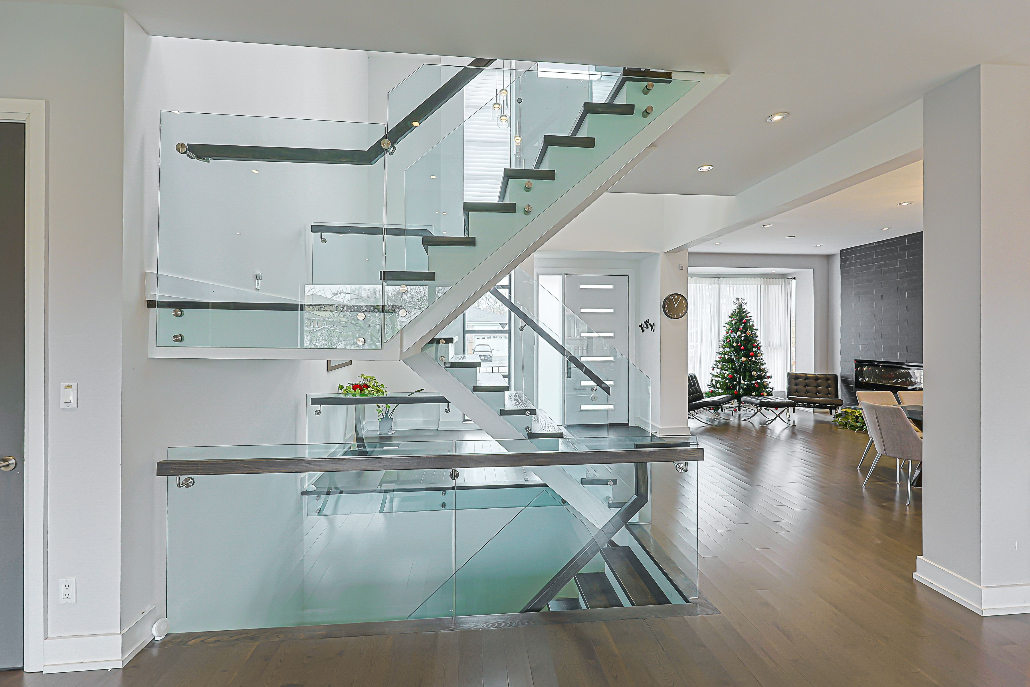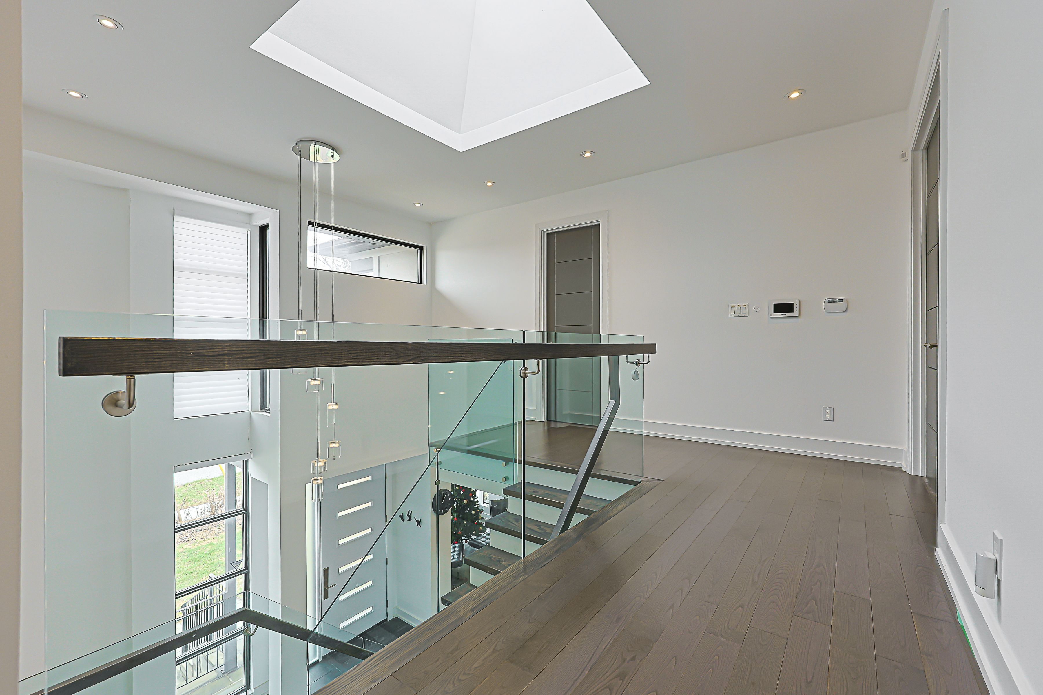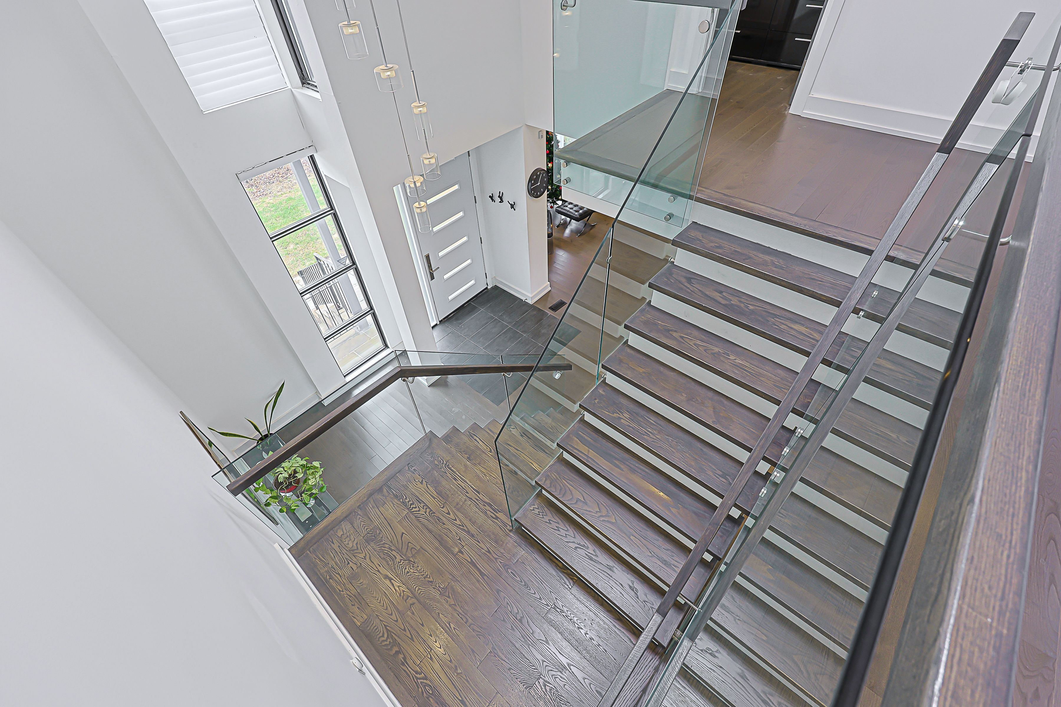Modern. Elegant. Irreplaceable. This unique custom-built gem in the heart of pleasant view offers unparalleled sophistication. An impressive double-height foyer leads to a sun-drenched open-concept layout featuring 10ft ceilings and floor-to-ceiling aluminum windows. The gourmet chef's kitchen flows seamlessly to an oversized deck-perfect for alfresco dining. Highlights include a striking glass staircase, dual skylights, and premium hunter douglas auto-blinds. Featuring a rare 2nd-floor laundry plus a finished walk-up basement with wet bar and rough-in laundry. Stunning stone & cedar facade with a double garage and stone driveway. Steps to top-rated schools, parks, and easy hwy 404/401 access.
