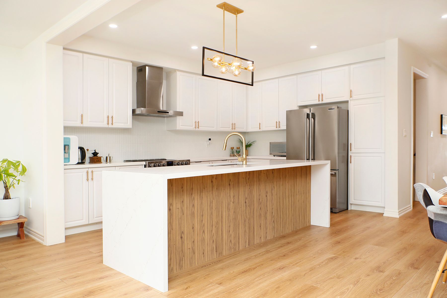 • Gourmet kitchen featuring quartz countertops and an oversized waterfall island.