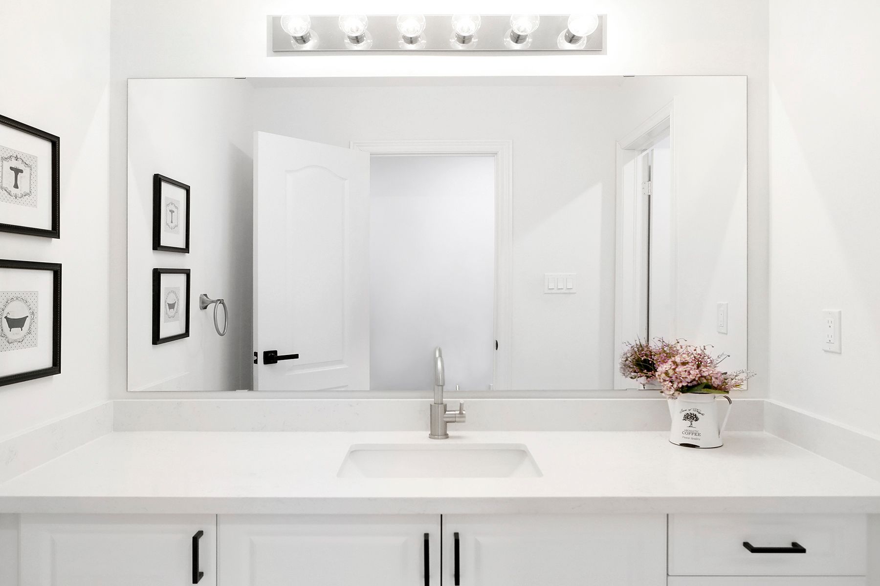 • Upgraded kitchen features quartz countertops and an oversized waterfall island.