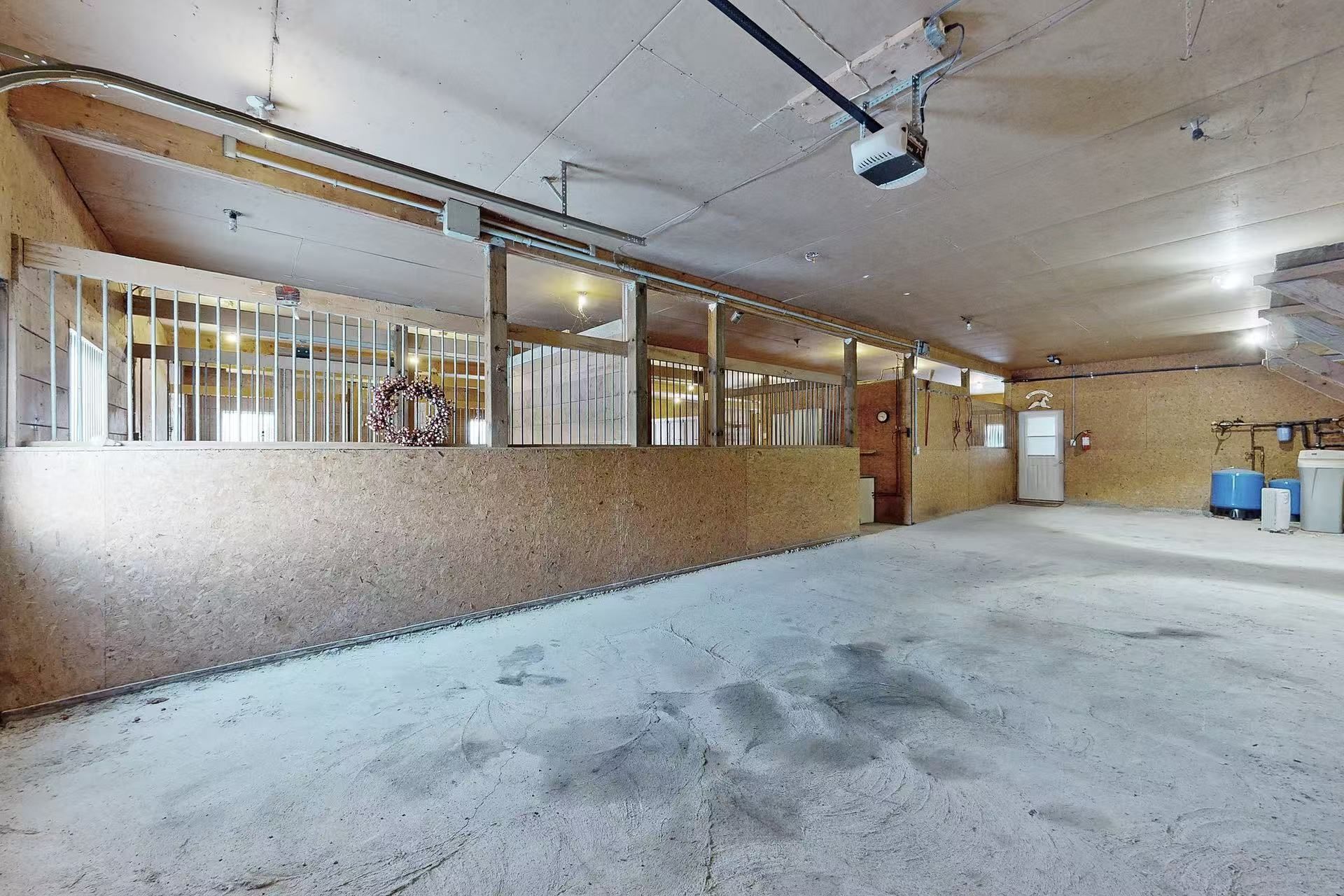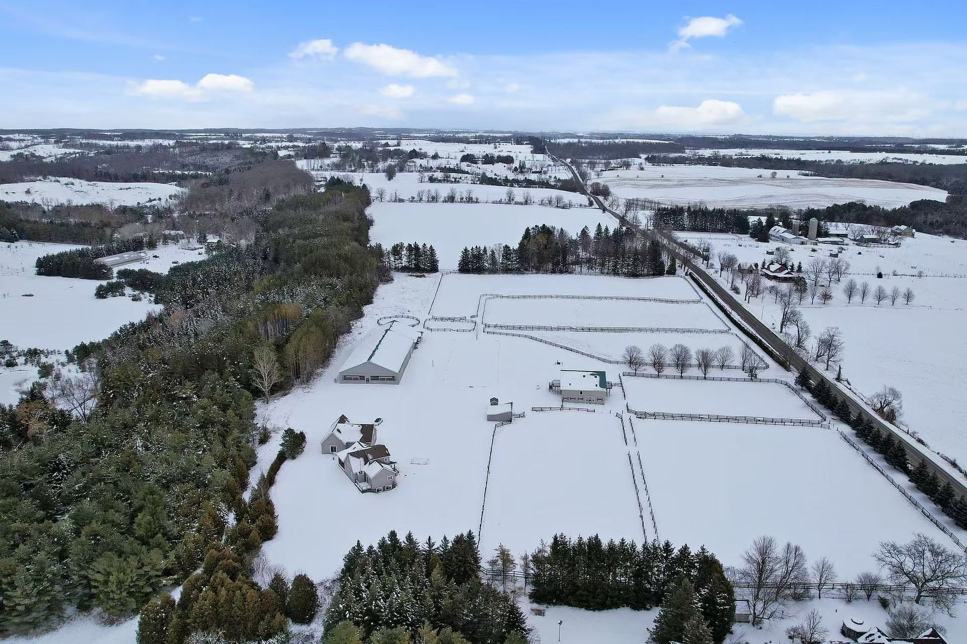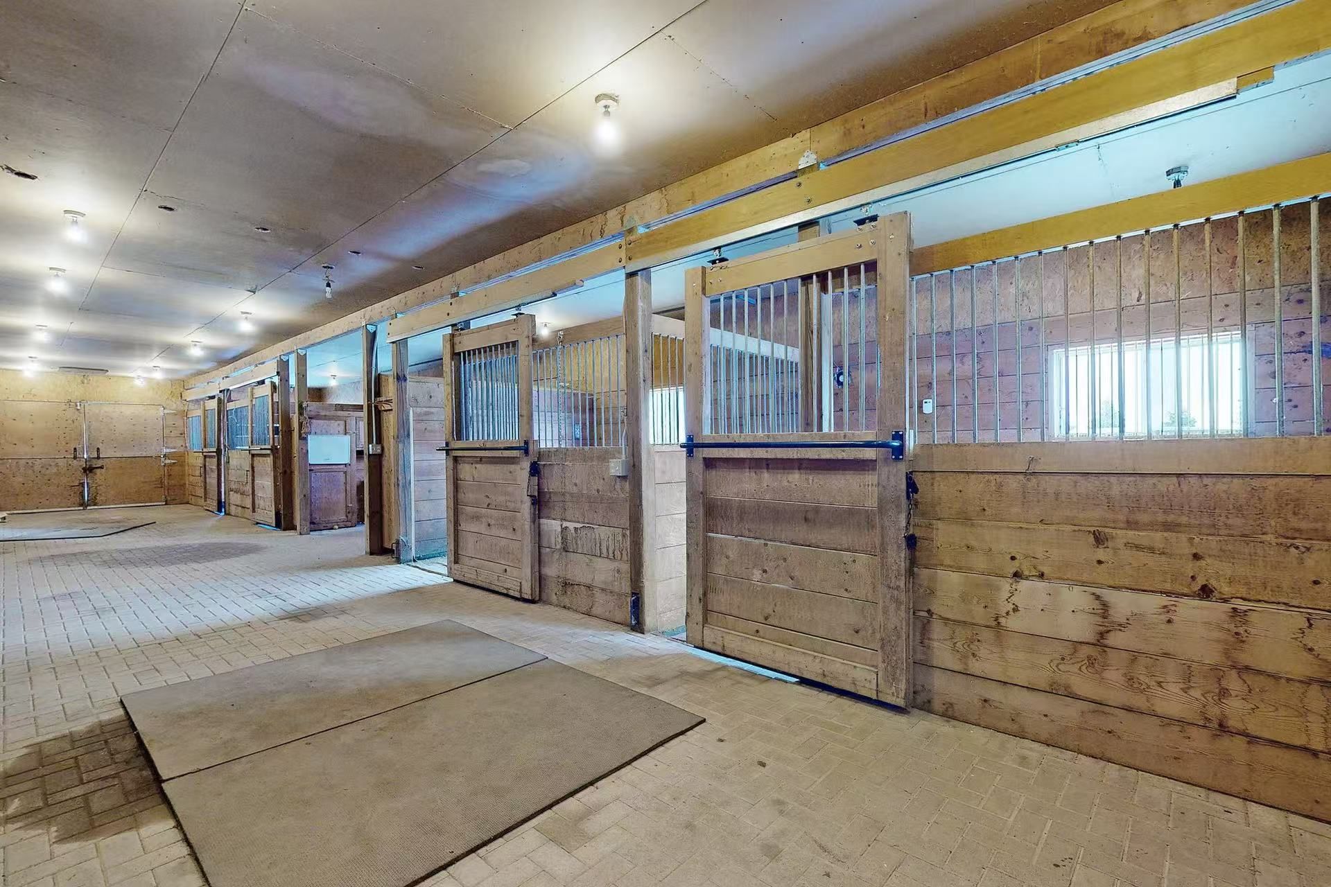 Only 10 minutes from the 407, this property offers the best of both worlds with a rural lifestyle and access to toronto in under an hour, situated behind a towering 8' hedge s roadside gates is an equestrian layout ideal for both a private or boarding facility. Impressive main dutch master's barn with arena includes german fiber footing. Second barn with additional8 stalls garage& spacious finished loft; outdoor ring with drainage, several paddocks.