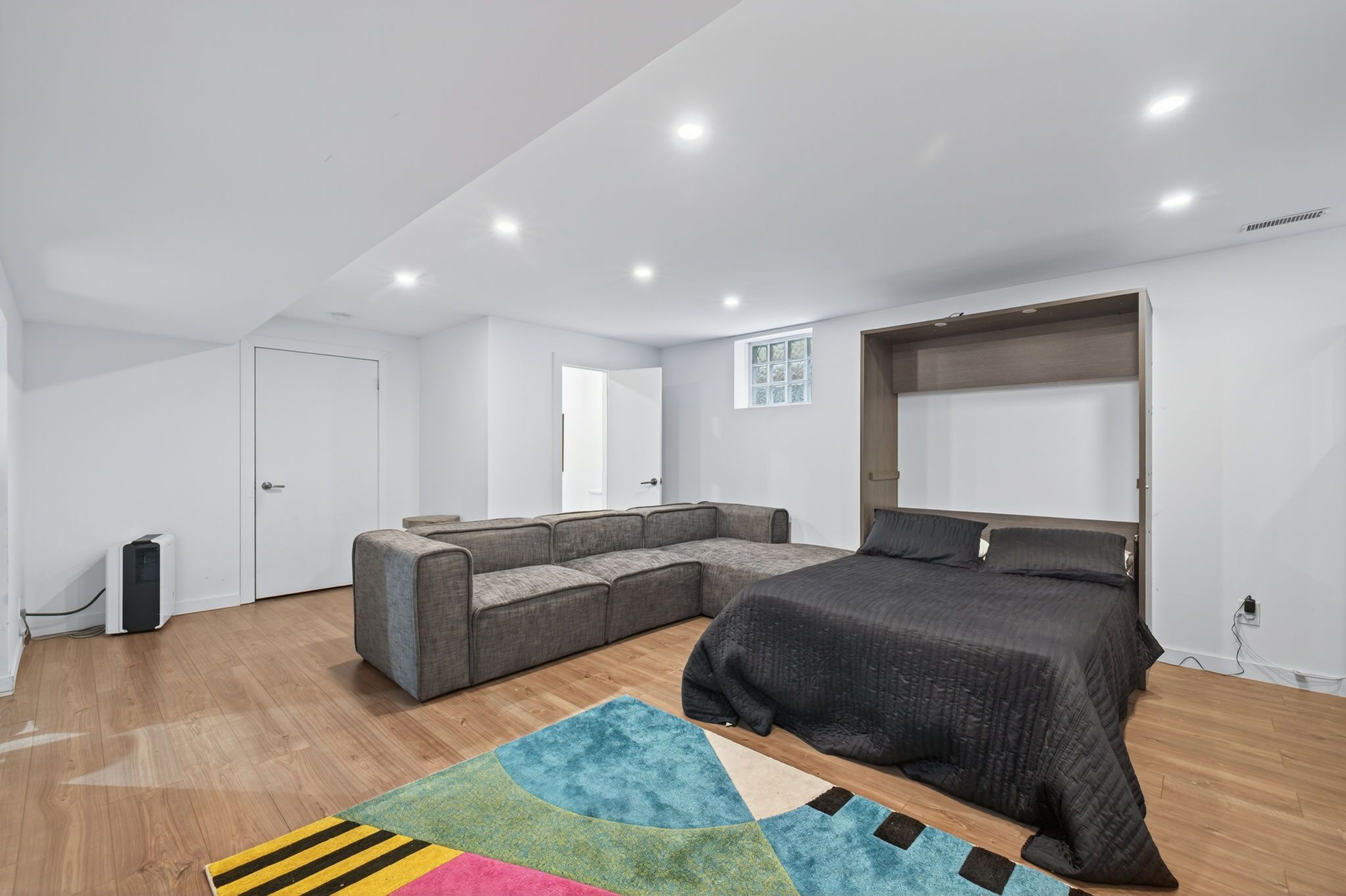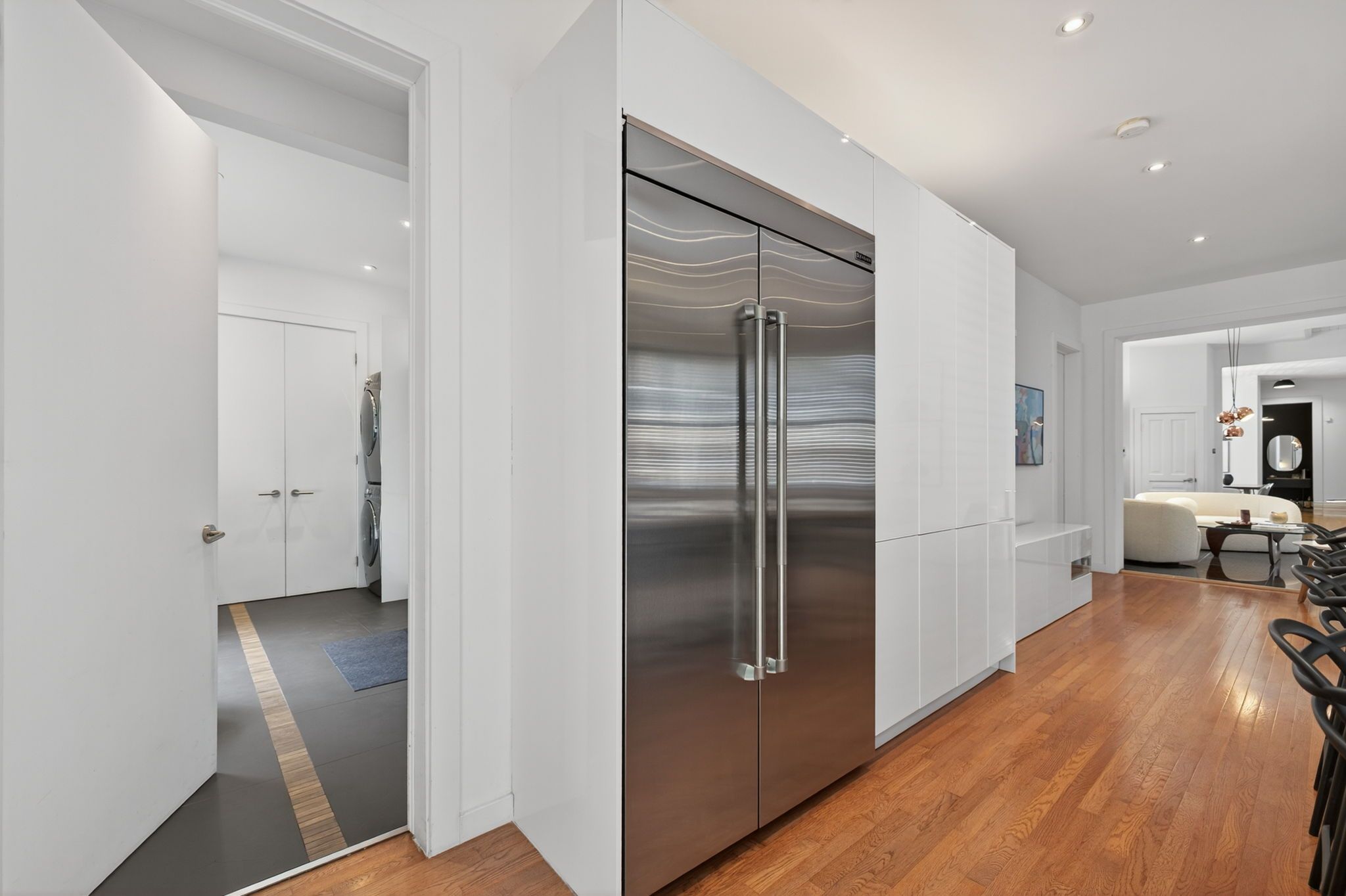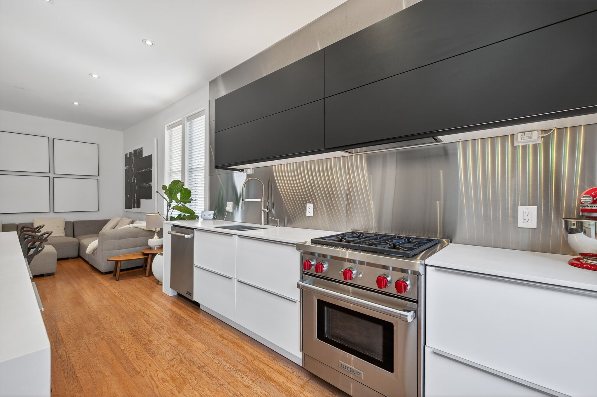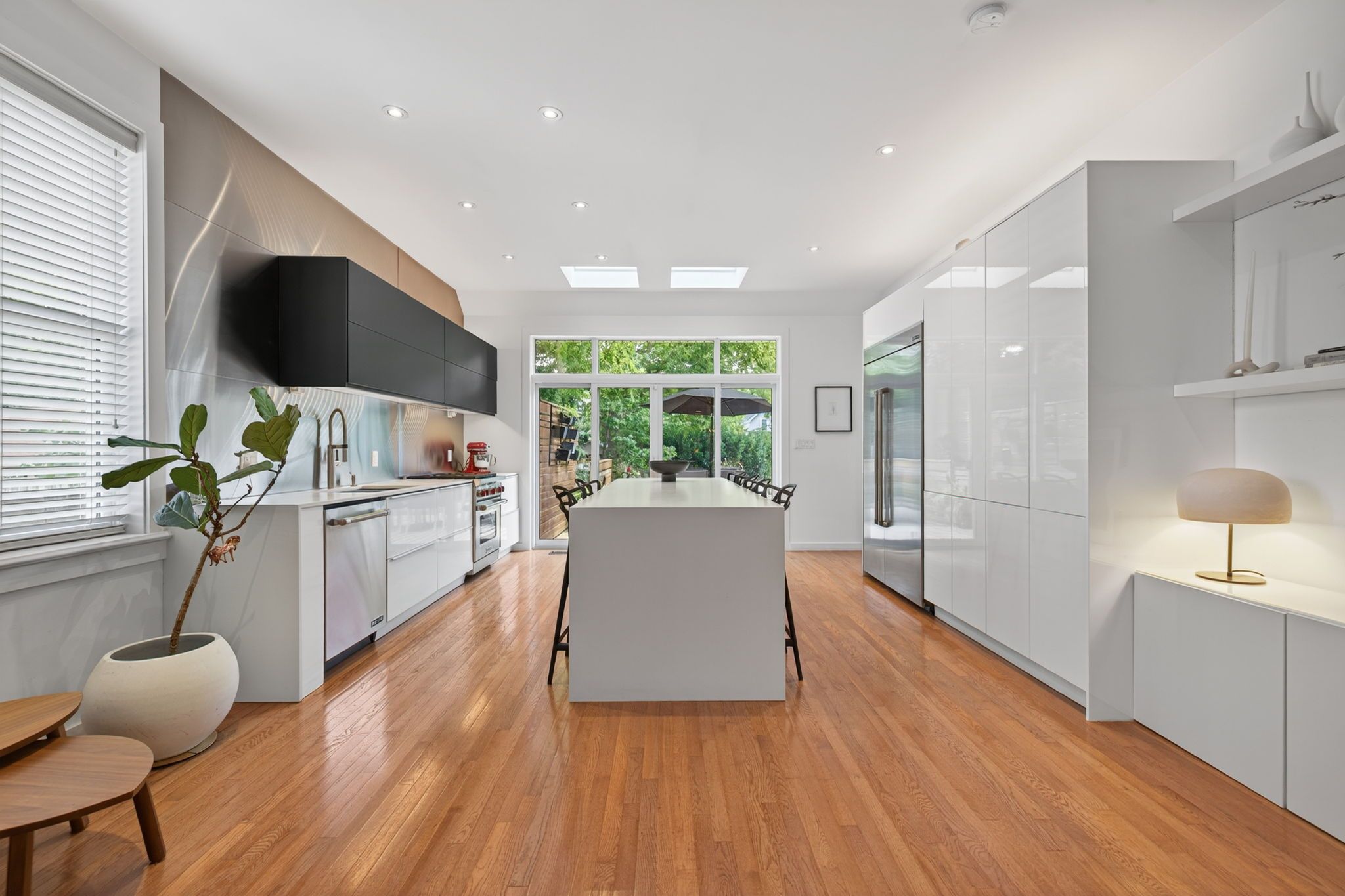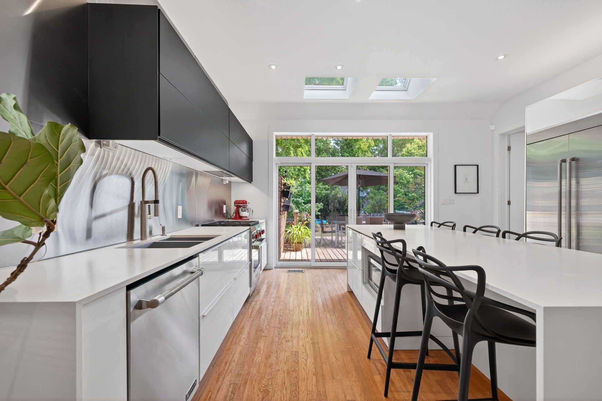 • Modern kitchen with stainless steel appliances and oversized island.
