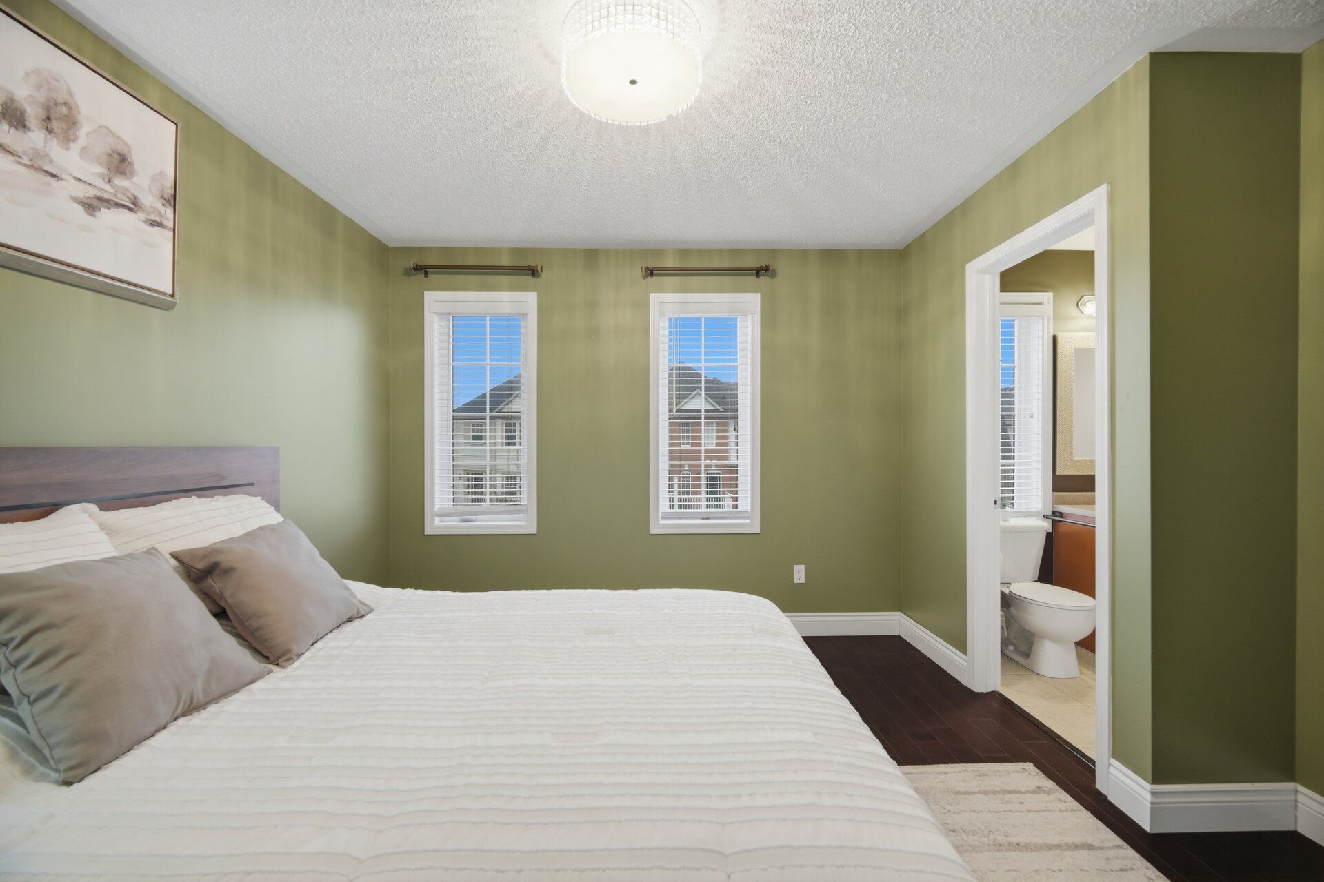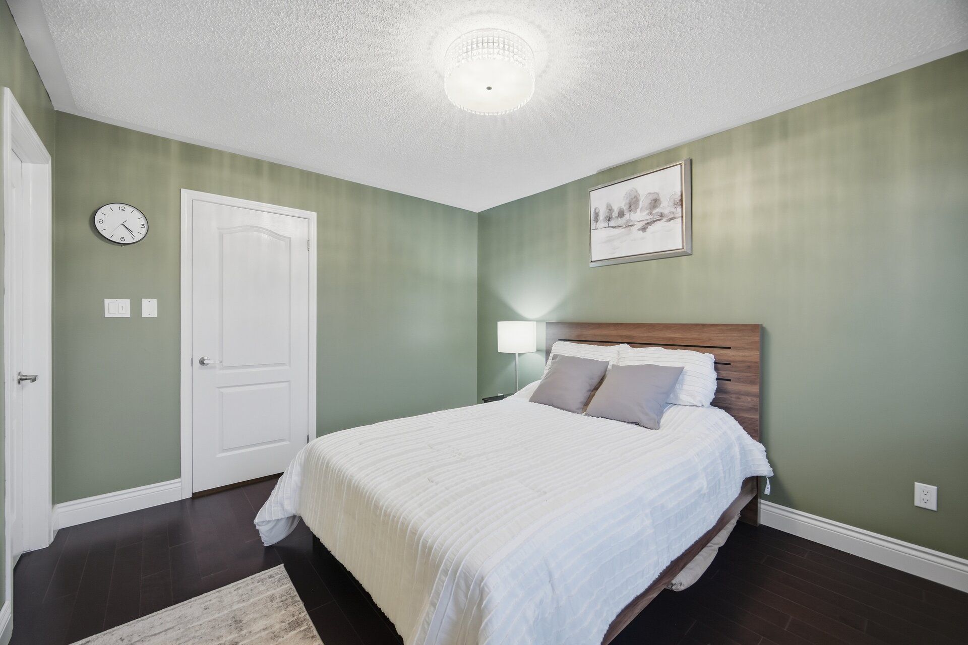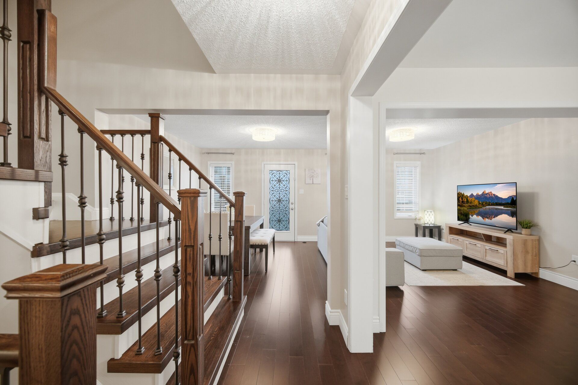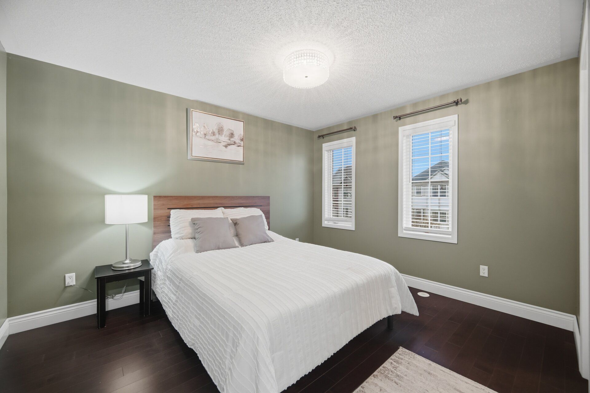 ***must see*** this stunning freehold townhome features 2 large bedrooms, 2. 5-bath with over 1,400 square feet of carpet-free living space. The large foyer can be used to welcome your guests or as an office. Dark hardwood stairs, accompanied by wrought iron pickets, lead you up to a modern and open-concept main floor with a beautiful fully-loaded kitchen, complete with s/s appliances, granite counter tops, pantry, soft close cabinet doors and breakfast bar. The combined living & dining area are complimented with large windows filling the main floor with natural light. The dining area is walkout to your own balcony, perfect for a bbq or your morning coffee. Upstairs, you will find a 4-pc bathroom and two generous bedrooms. The primary bedroom features its own 4-pc ensuite bathroom and walk-in closet. Laundry is conveniently located on the main floor. Complete with two parking spots, one-garage and one-surface and easy access to many amenities including shopping, schools, parks, sports centres and more! Book your private showing today!