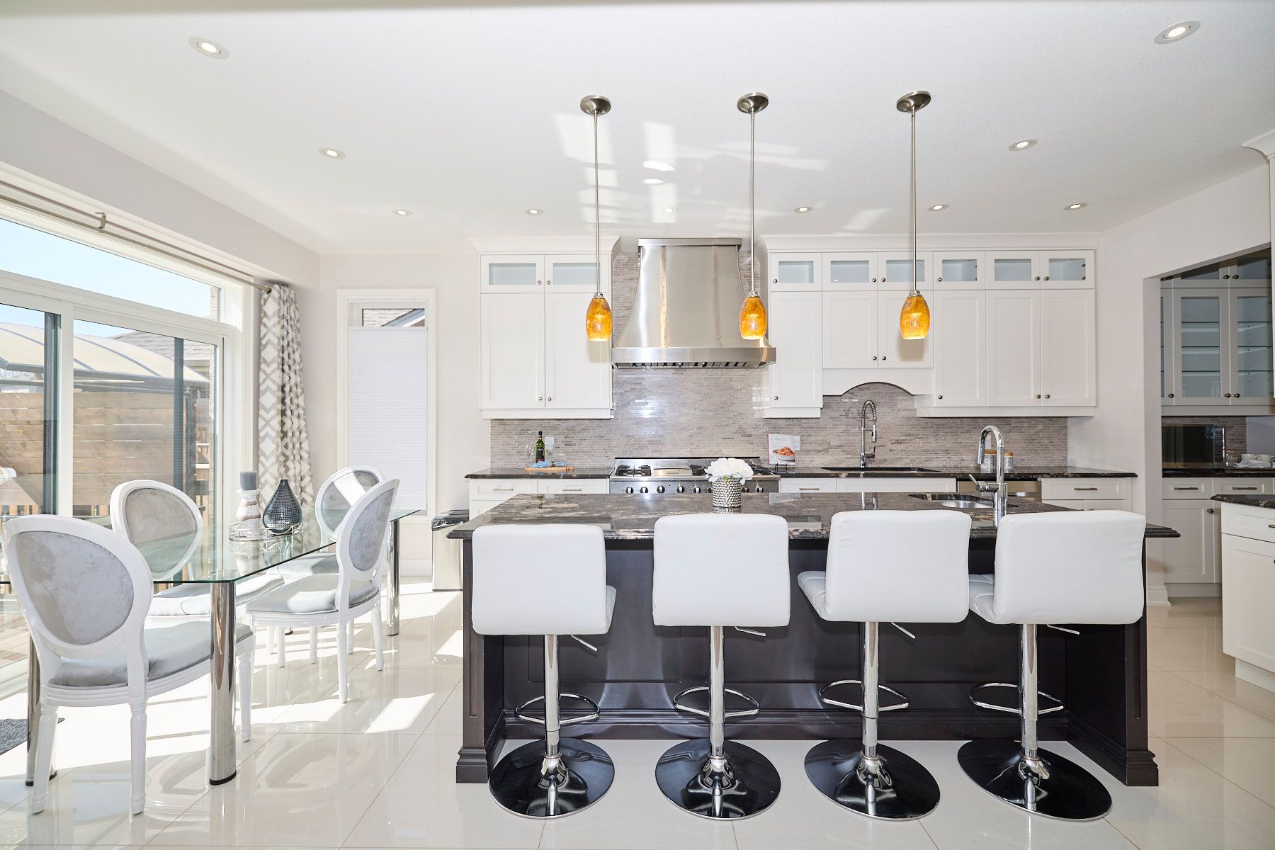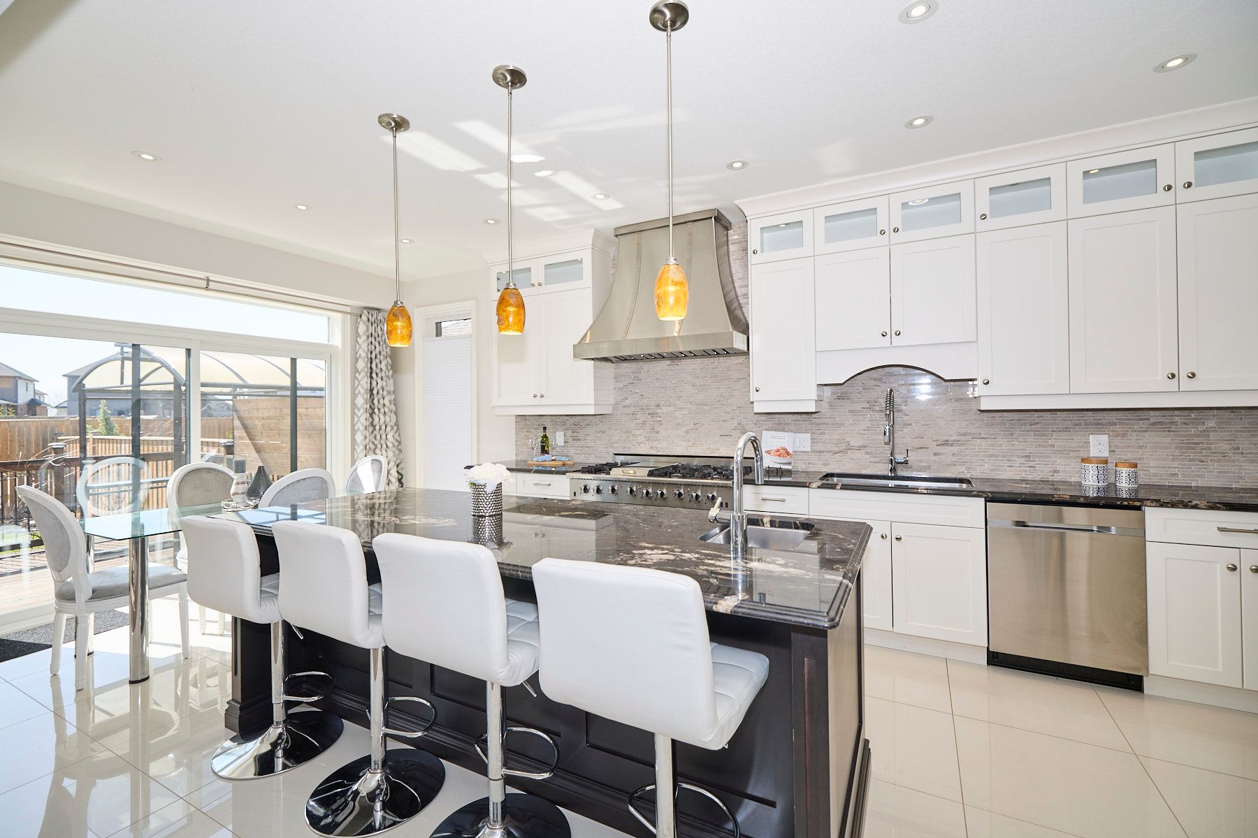 • High-end kitchen featuring an 8-burner gas stove and top appliances.
