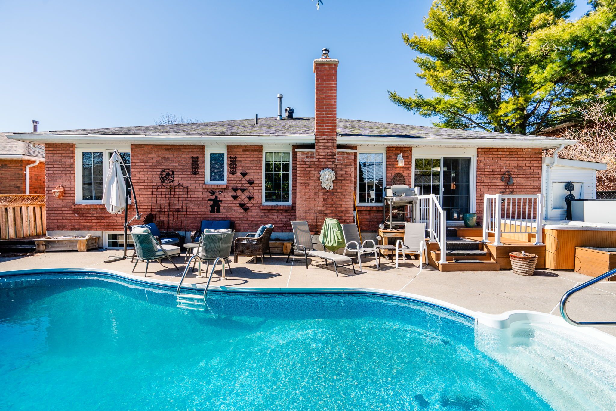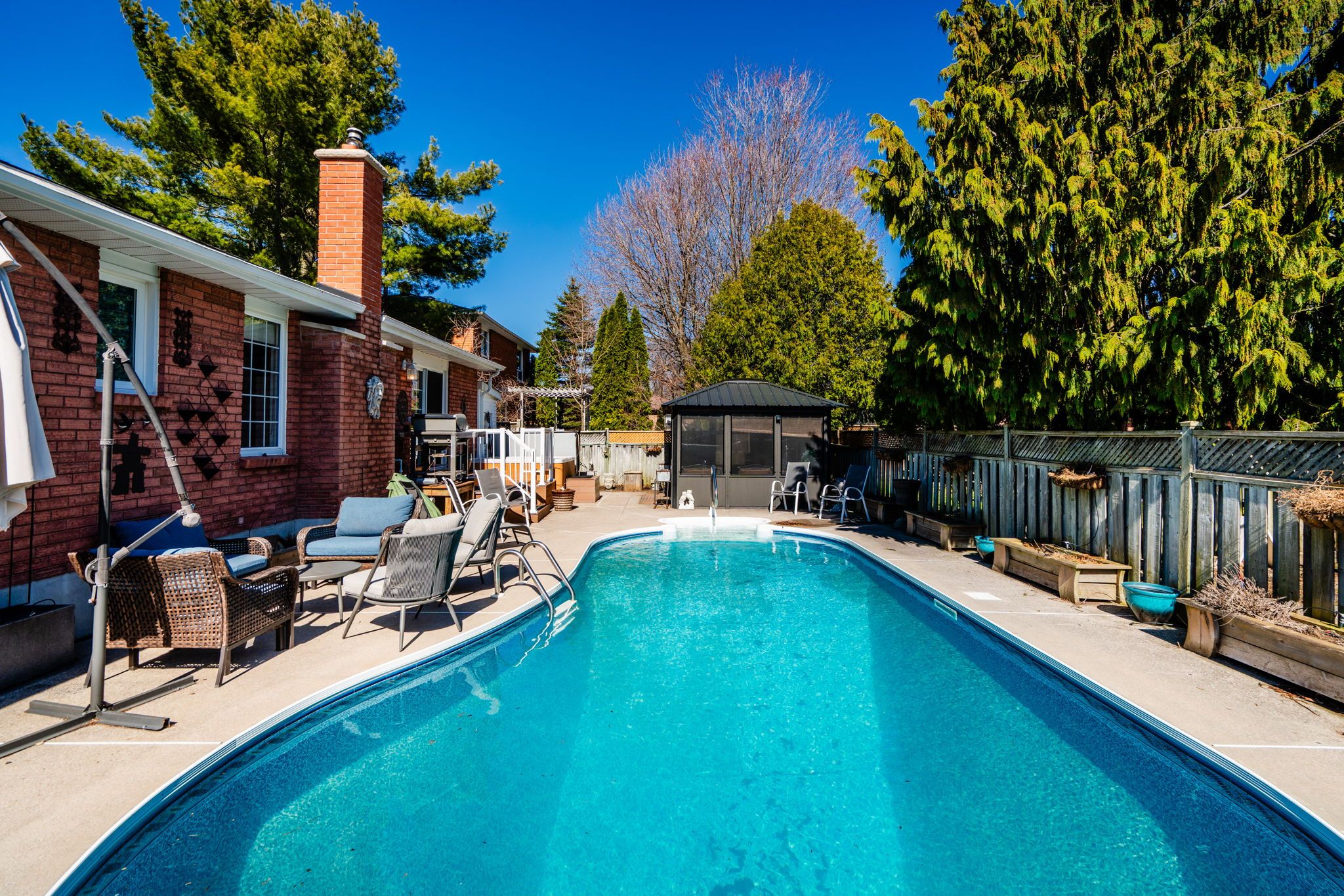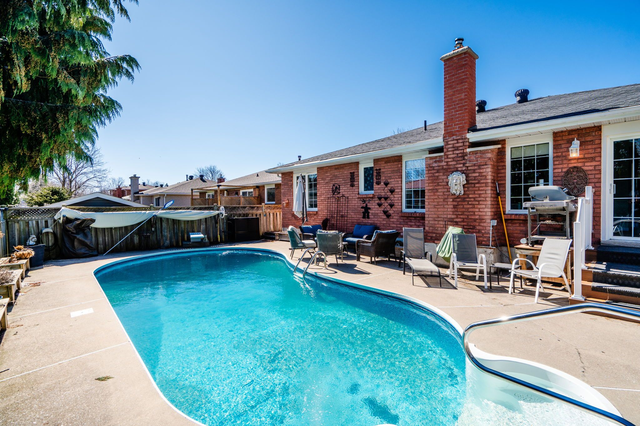 Located in the highly desirable west end, this all-brick bungalow offers the perfect blend of comfort, space, and outdoor living. Featuring 3+1 bedrooms and 3 bathrooms, the home boasts a large main floor primary suite complete with a private ensuite, along with spacious principal rooms including a bright kitchen, living room, and a cozy family room with a gas fireplace. Engineered hardwood flooring runs throughout the main level, adding warmth and style. The fully finished basement extends your living space with a generous rec room (complete with pool table), plus an additional office or craft room. Step outside to your private backyard oasis featuring a 16x32 inground pool with a new liner (2024), a 6-person hot tub with new cover, screened gazebo, cedar planters, and an irrigation system-all fully fenced for privacy. Additional highlights include new gutter guards, central vac, and a generlink for added peace of mind.