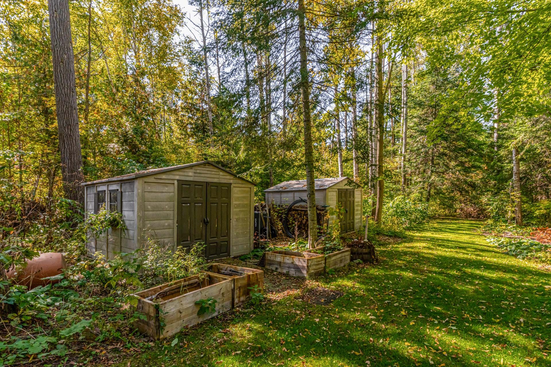• Fully fenced yard featuring fruit trees, fire pit area, and trails.