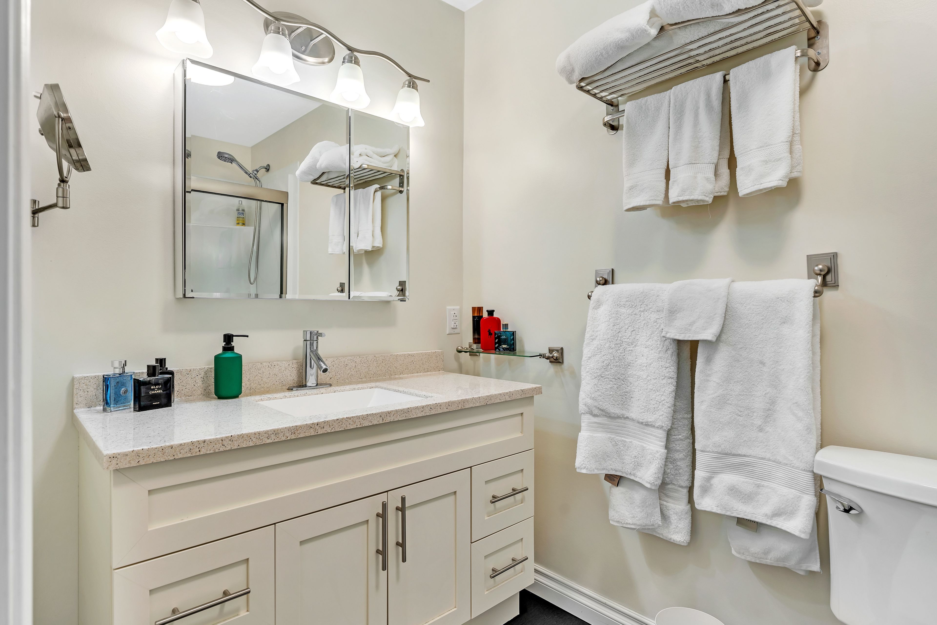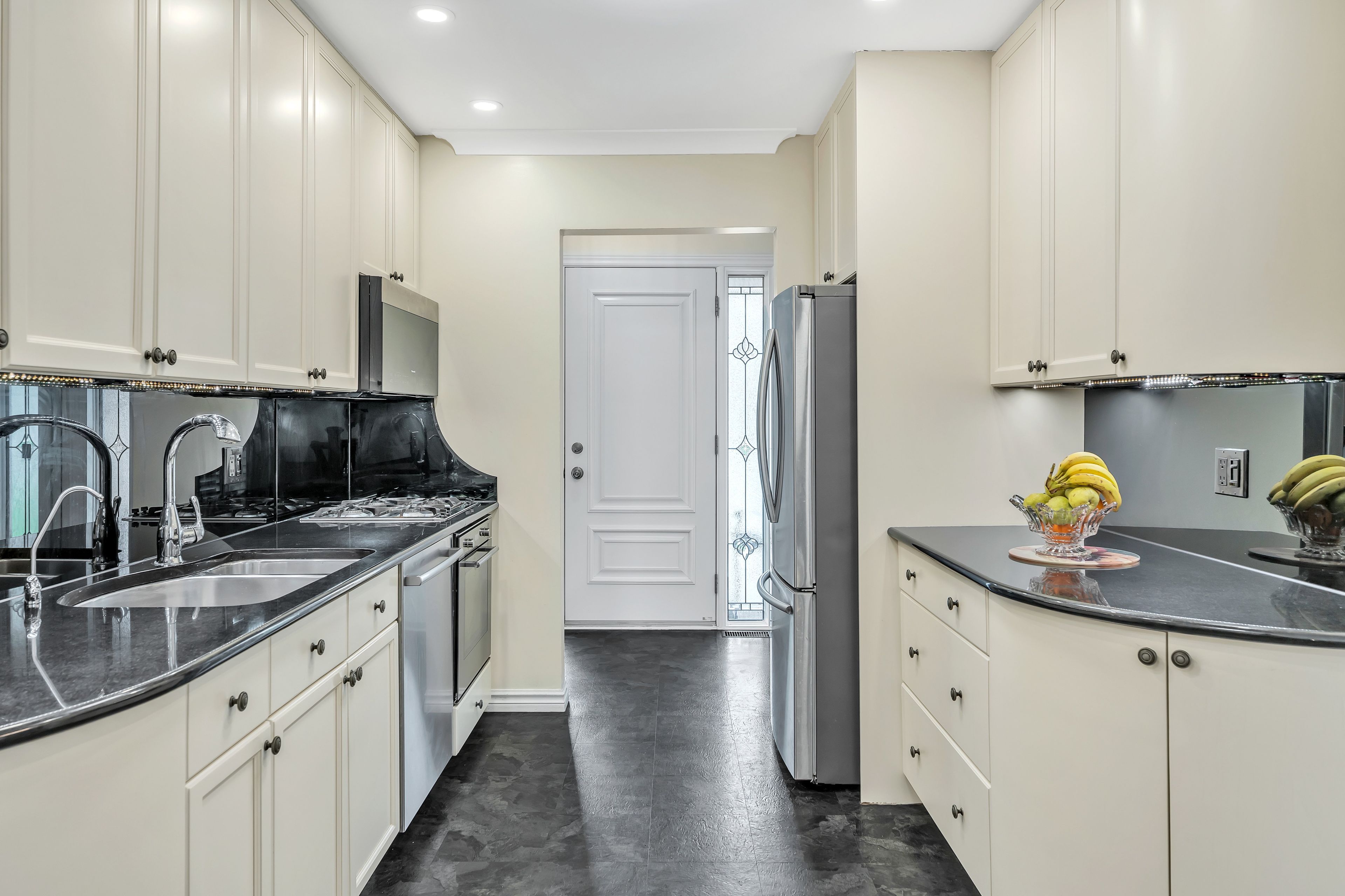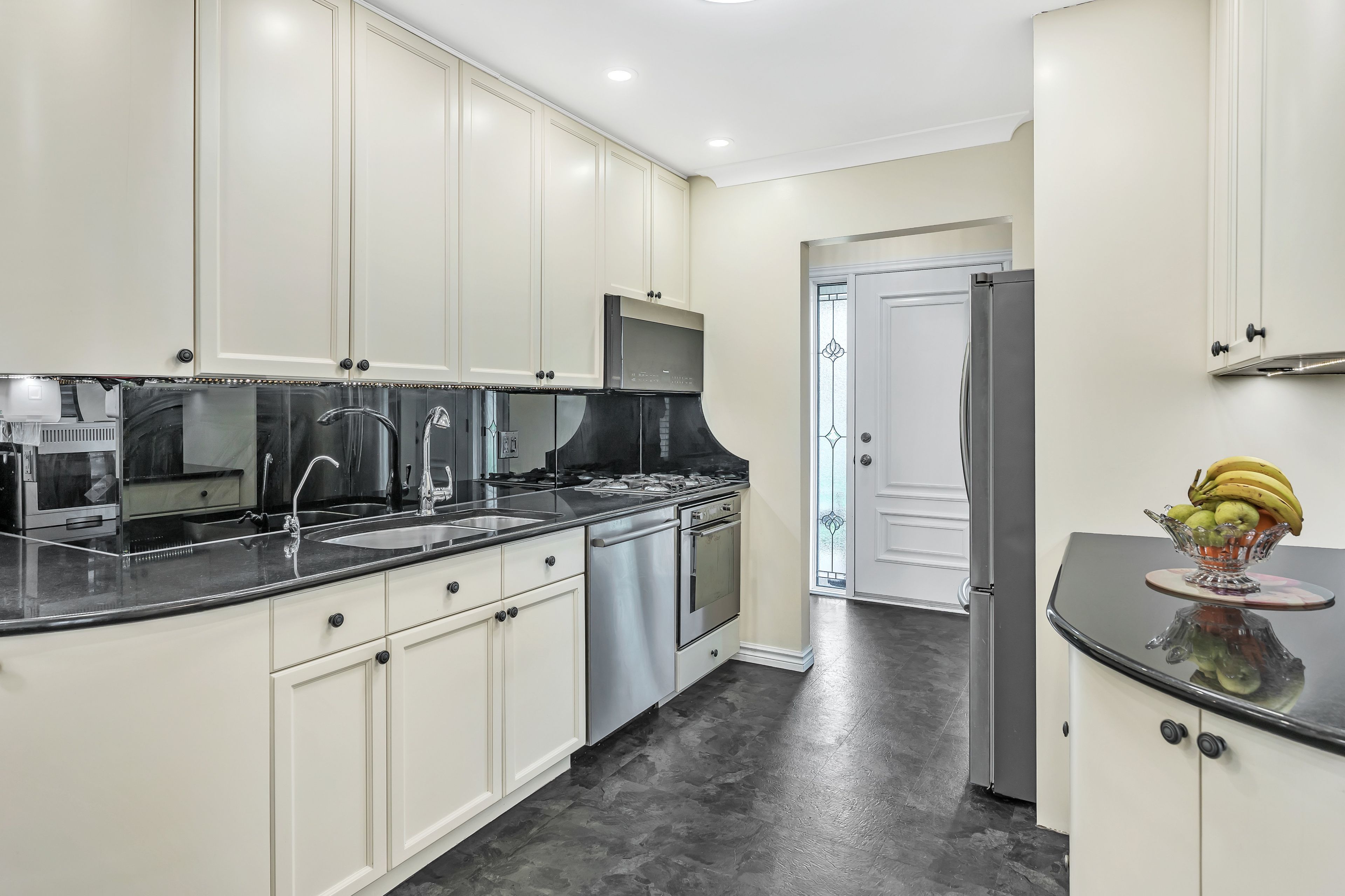 • Modern kitchen with stainless steel appliances and gas range for cooking enthusiasts.