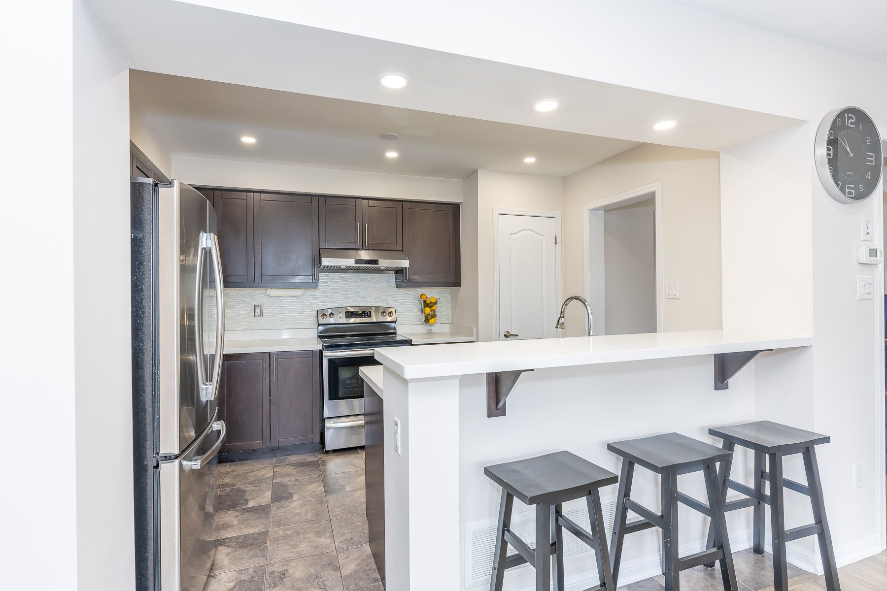 • Modern eat-in kitchen with stainless steel appliances and breakfast bar.