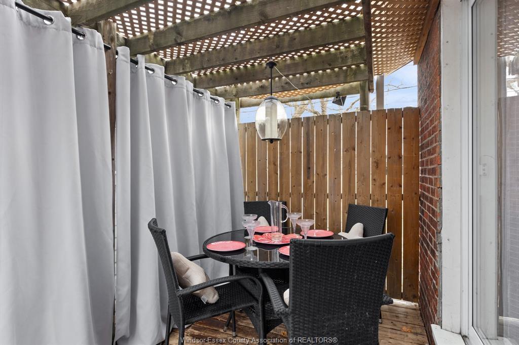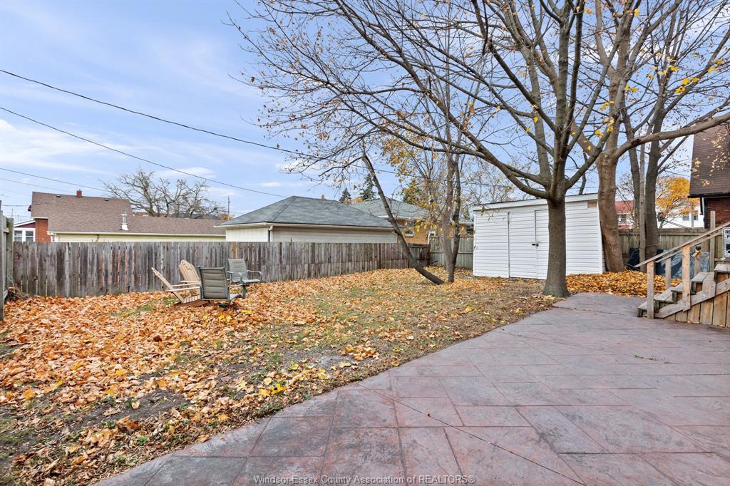 • Private deck overlooking a large fenced yard with patio and storage shed.