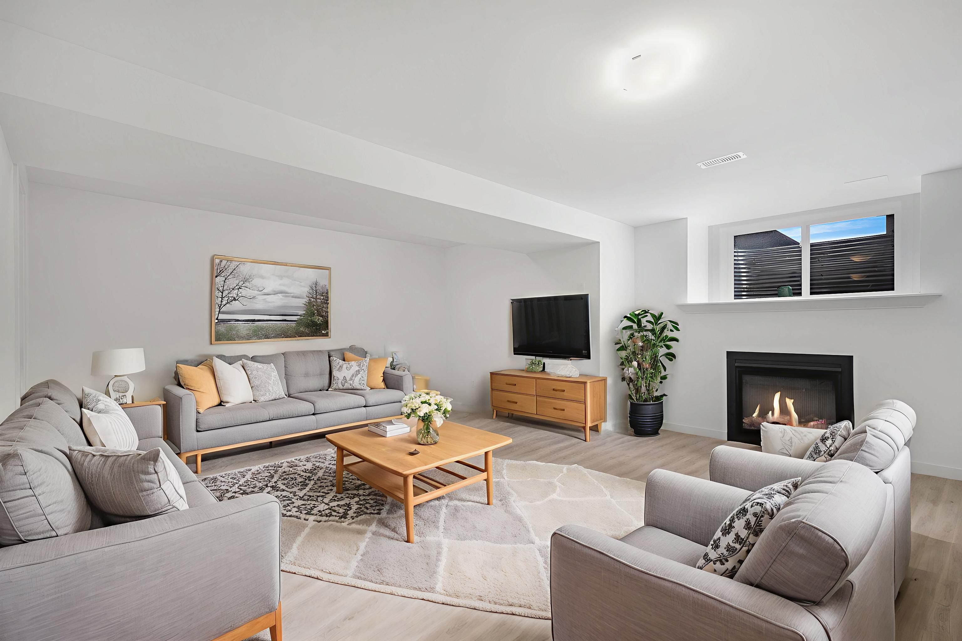 • Fully finished basement includes a natural gas fireplace for warmth.