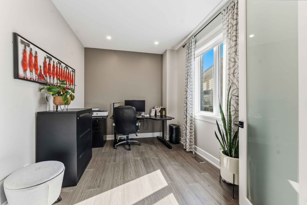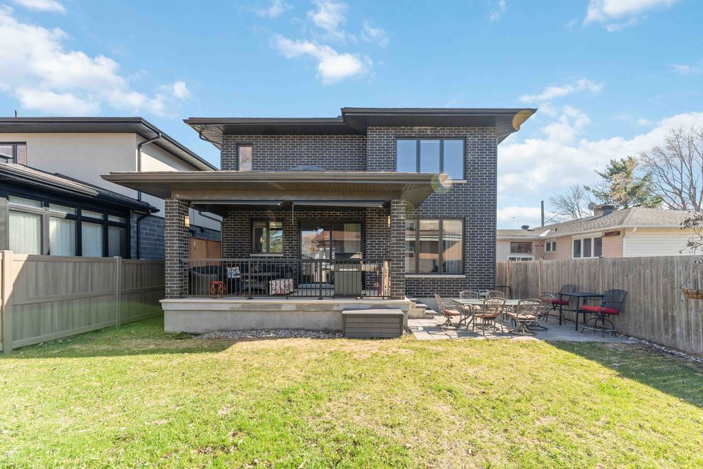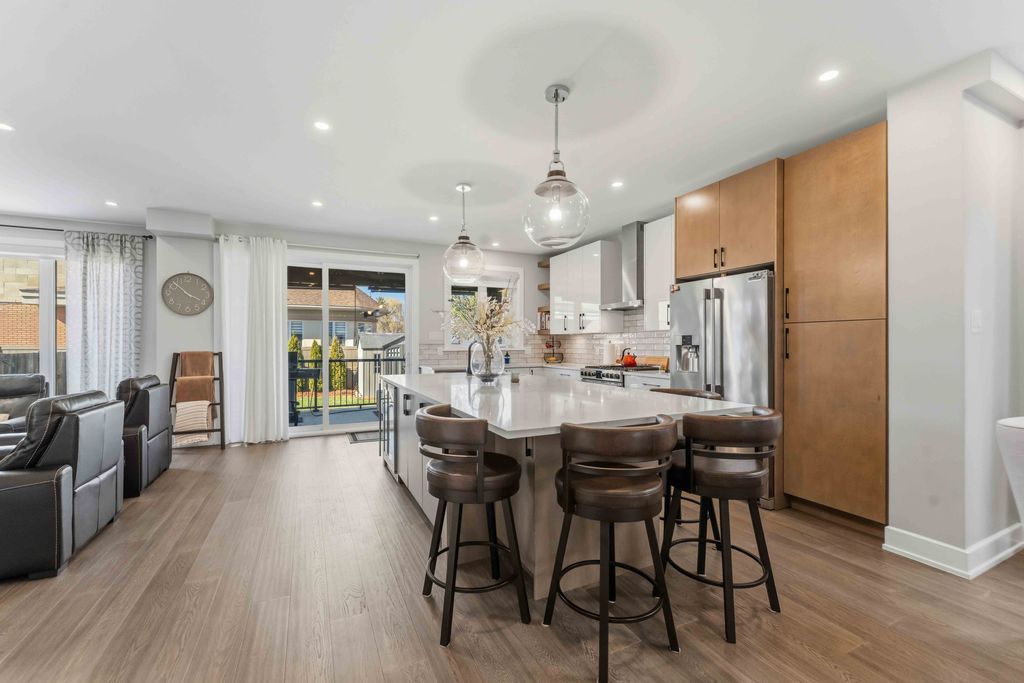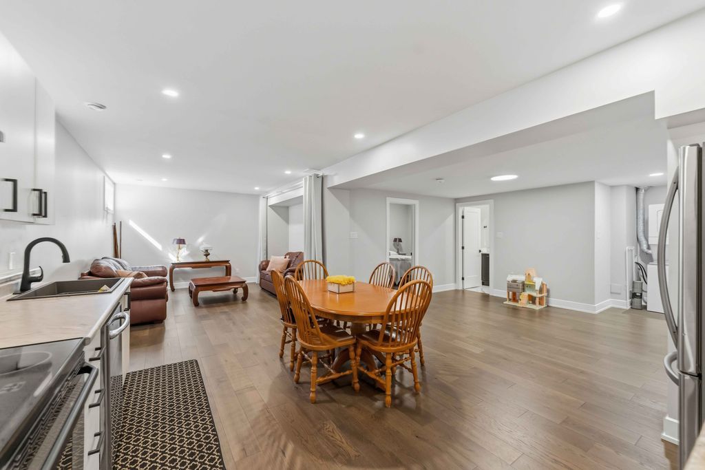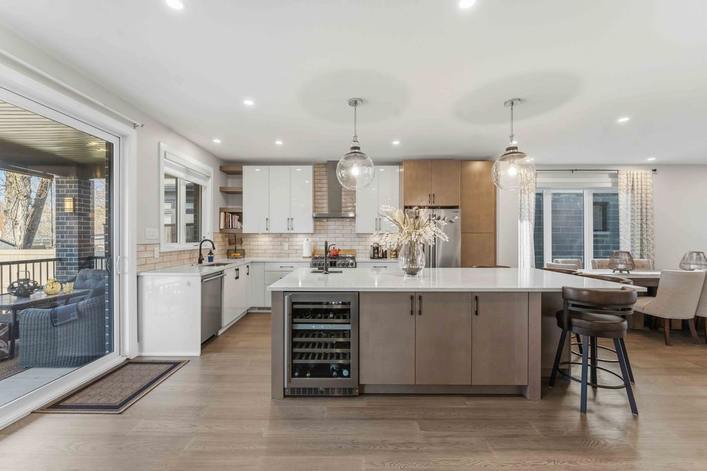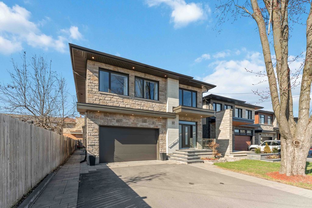 Welcome to an exceptional four-bedroom residence where refined design meets everyday comfort in one of ottawa's well-connected family communities, moments to parks, schools, shopping, transit, and an easy commute to downtown. A grand entryway opens to a striking floating staircase and unobstructed sightlines through the main level. Engineered hardwood spans the first and second floors, complementing the elegant open-concept layout. The dining area flows seamlessly into a designer kitchen and inviting living room, anchored by a gas fireplace and overlooking the private backyard. The chef's kitchen is beautifully appointed with premium stainless steel appliances, quartz countertops, a gas range, oversized island with built-in wine fridge, and abundant workspace for entertaining. French doors off the living area reveal a bright main-floor office with a large window-ideal for working from home. Upstairs, four generous bedrooms offer exceptional comfort. The luxurious primary suite features a truly dream-worthy custom dressing room with built-ins and centre island, along with a spa-inspired five-piece ensuite complete with dual vanities, roman tub, and glass shower. Two secondary bedrooms share a convenient jack-and-jill bath, while the fourth bedroom enjoys its own ensuite and walk-in closet. A beautifully designed laundry room with custom built-ins completes the upper level. The finished lower level offers outstanding flexibility with a private in-law suite featuring its own exterior entrance, full kitchen, living area, bedroom, bathroom, for multigenerational living, guests, or future income potential. Outside, enjoy a landscaped, fully fenced yard with pvc fencing, a spacious deck, built-in sun shades, and storage shed. An oversized single garage adds everyday convenience. Sophisticated, warm, and thoughtfully designed throughout, this is a rare opportunity to own a truly turnkey home in ottawa.