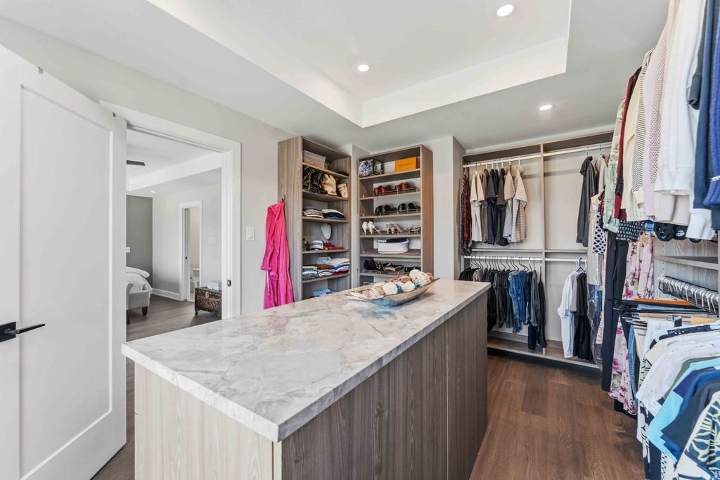 • Chef's kitchen with premium appliances, oversized island, and wine fridge.