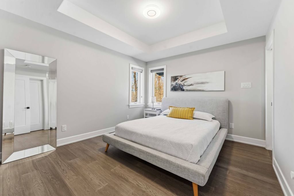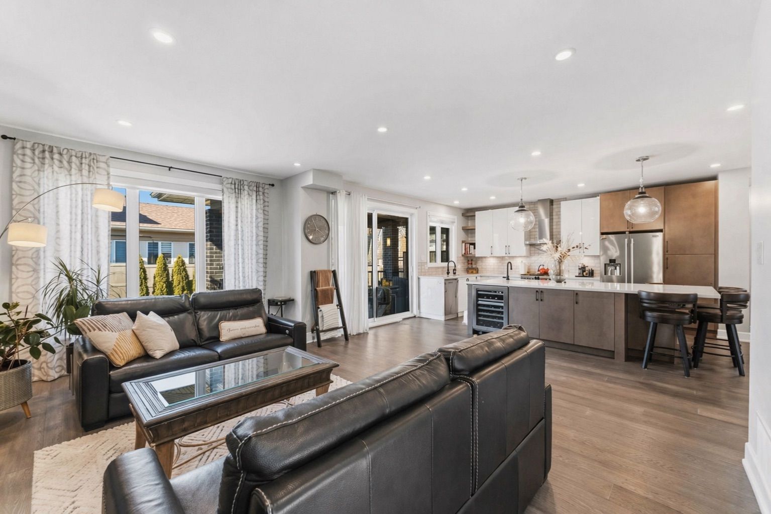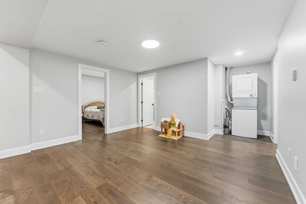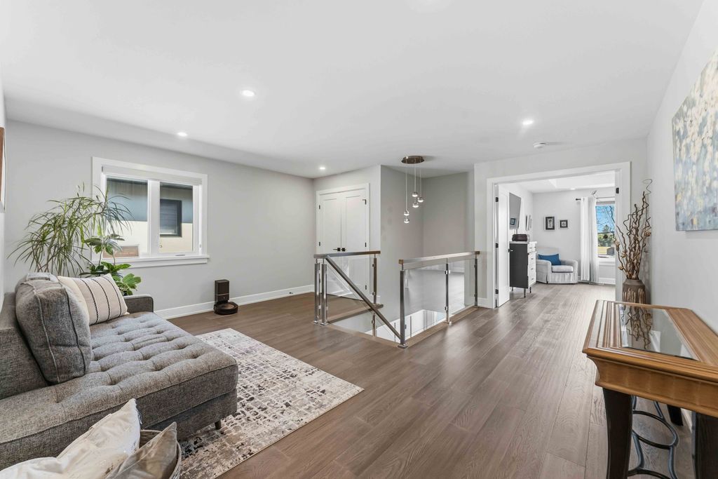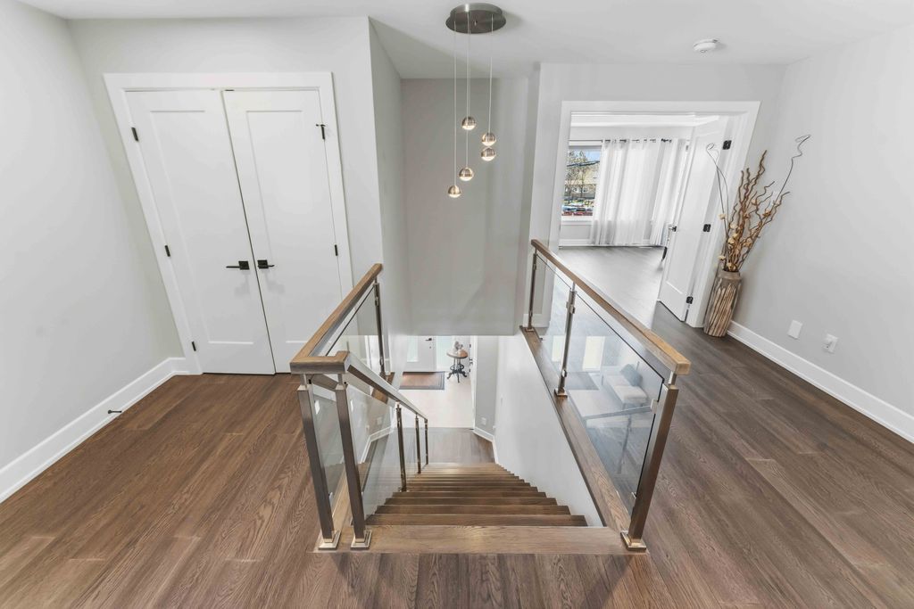 • Open-concept layout with engineered hardwood and a striking floating staircase.
