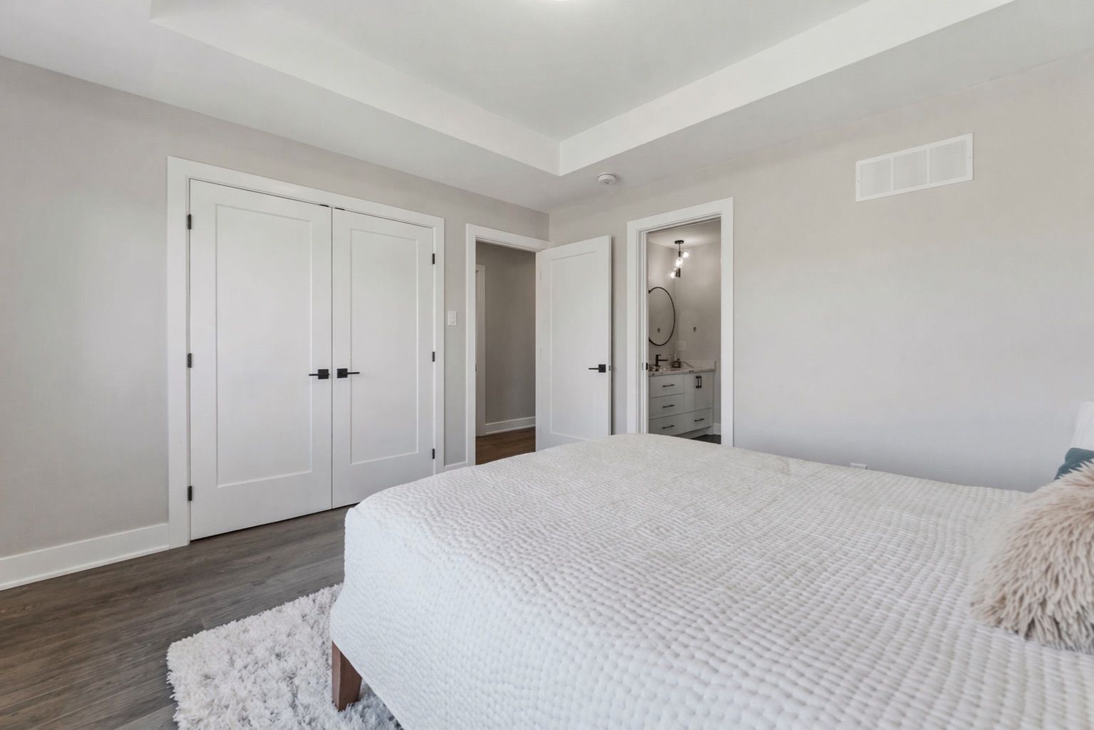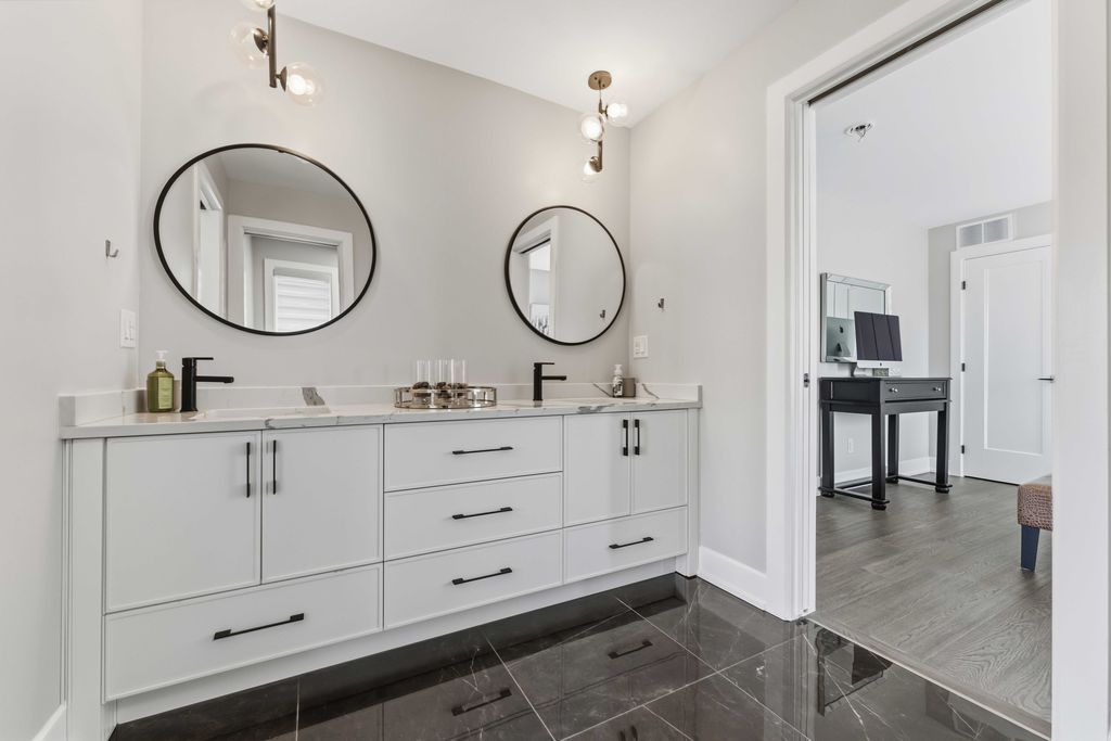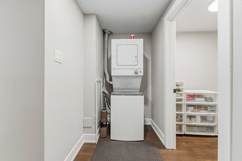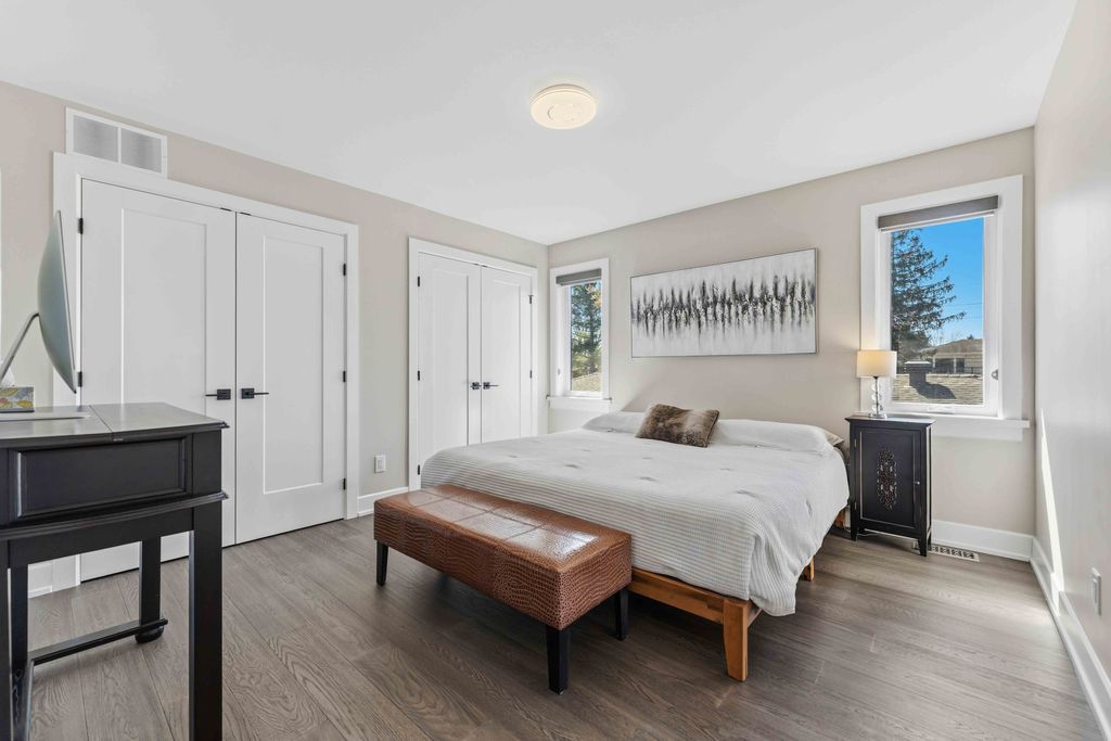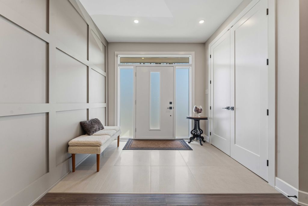 • Open-concept layout with engineered hardwood and a striking floating staircase.