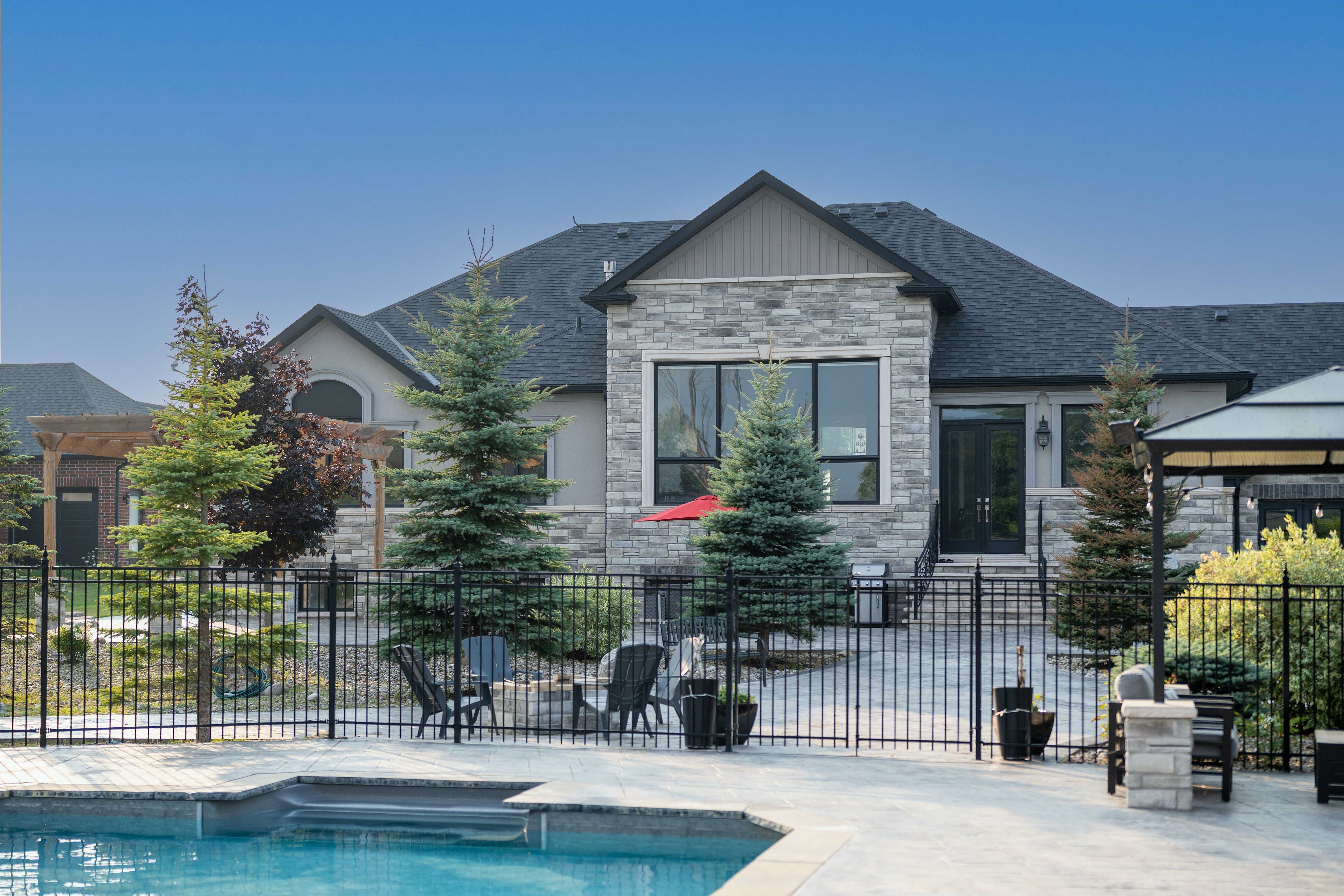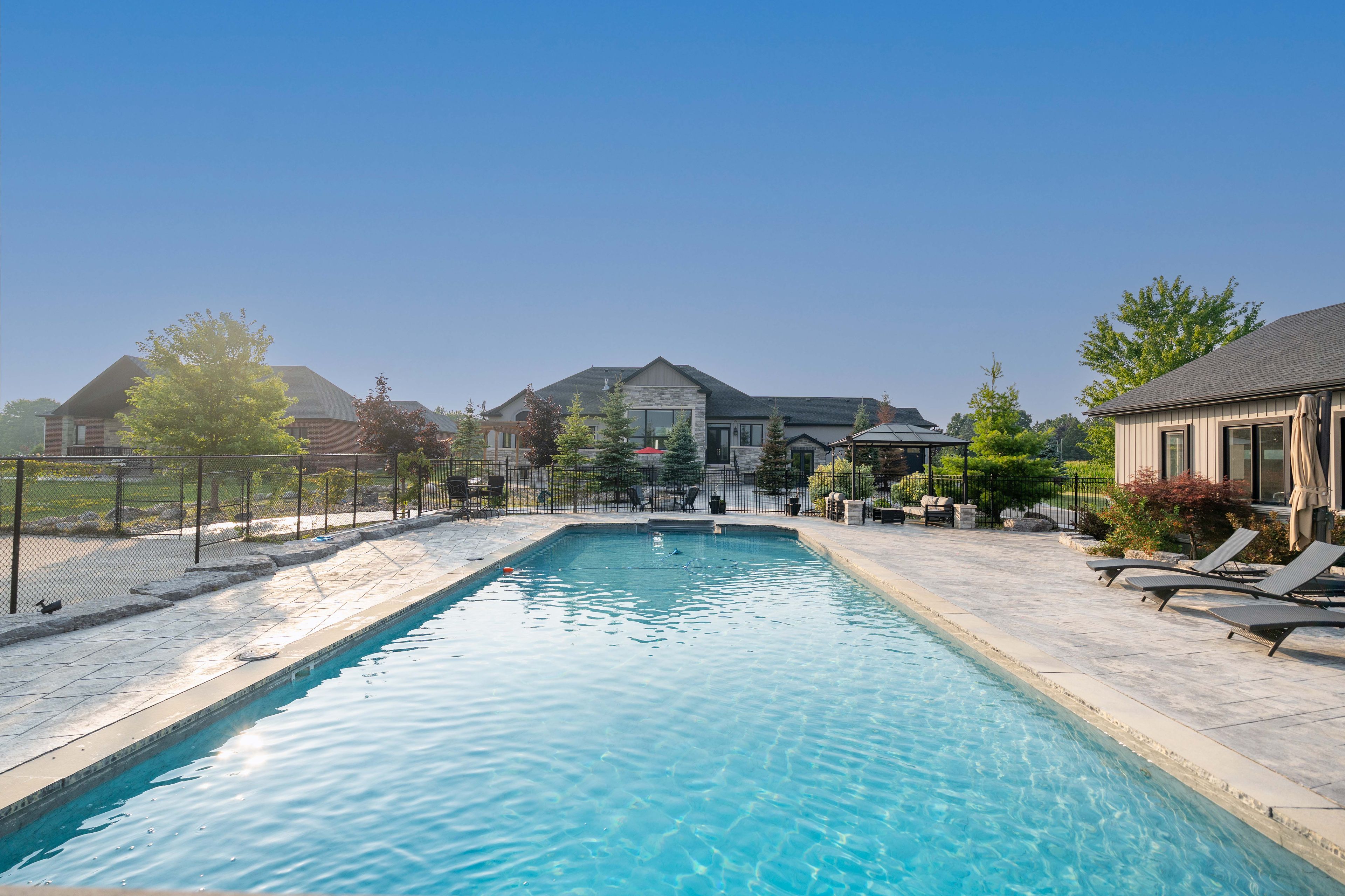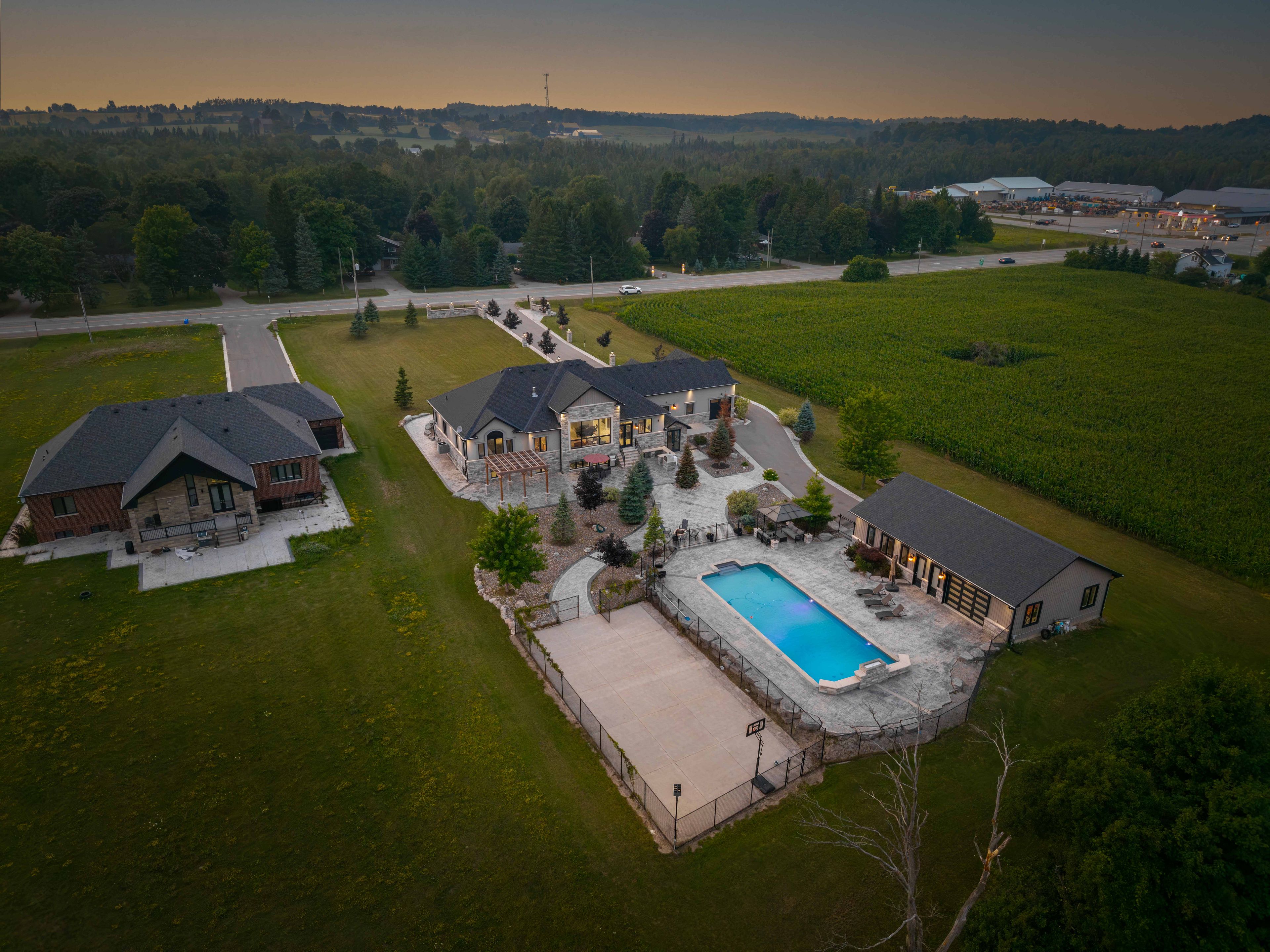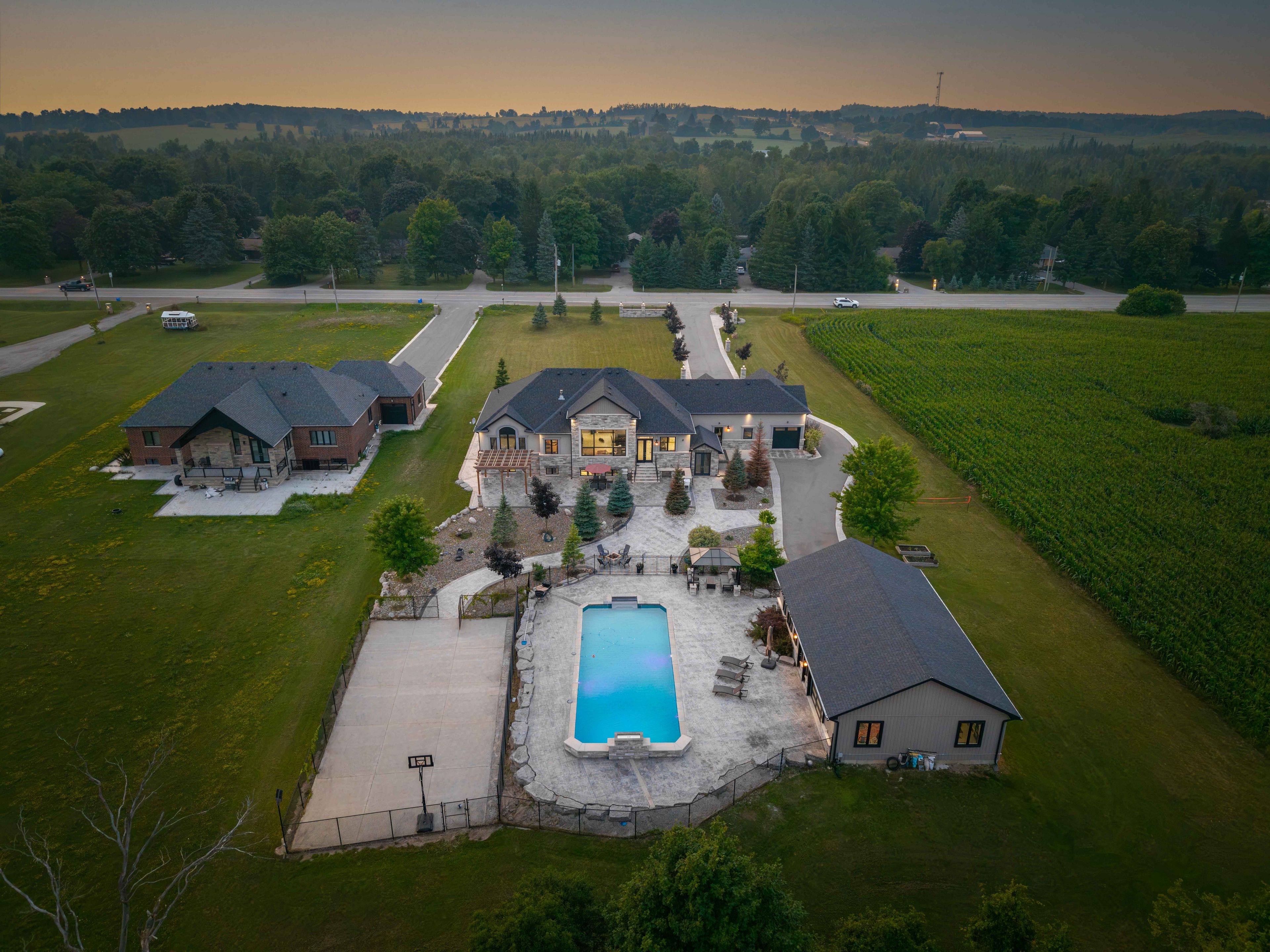 Welcome to 9383 wellington 124 road in erin, an absolutely stunning custom-built bungalow offering over 5,700 square feet of finished living space. Set on 1. 31 acres of beautifully landscaped grounds, this home is designed with exceptional craftsmanship and thoughtful details throughout. The main level spans 2,846 square feet and features an open-concept layout with soaring 10- to 15-foot ceilings. A striking 9-by-15-foot picture window floods the family room with natural light, while the gas fireplace adds warmth and elegance. The gourmet kitchen is a showpiece, complete with a centre island, leathered granite counters, stainless steel appliances, and upper and lower accent lighting. The primary suite is a true retreat with a lavish spa-like ensuite, while the additional bedrooms offer spacious layouts, walk-in closets, and a jack-and-jill bath. The fully finished lower level adds another 2,876 square feet of living space, featuring a massive recreation room, guest suite, and full bath. This versatile space is perfect for entertaining, relaxing, or hosting extended family and friends. Outdoors, the property continues to impress with a heated saltwater pool, cascading waterfalls, a sports pad, and a cabana that can also serve as a separate garage with space for up to four additional vehicles. Along with the oversized three-car garage with a drive-thru bay and the long private driveway, this home offers exceptional parking and functionality. This is more than a home its a lifestyle. Combining luxury, recreation, and comfort, 9383 wellington 124 road delivers the best of both home and cottage living in one remarkable property.