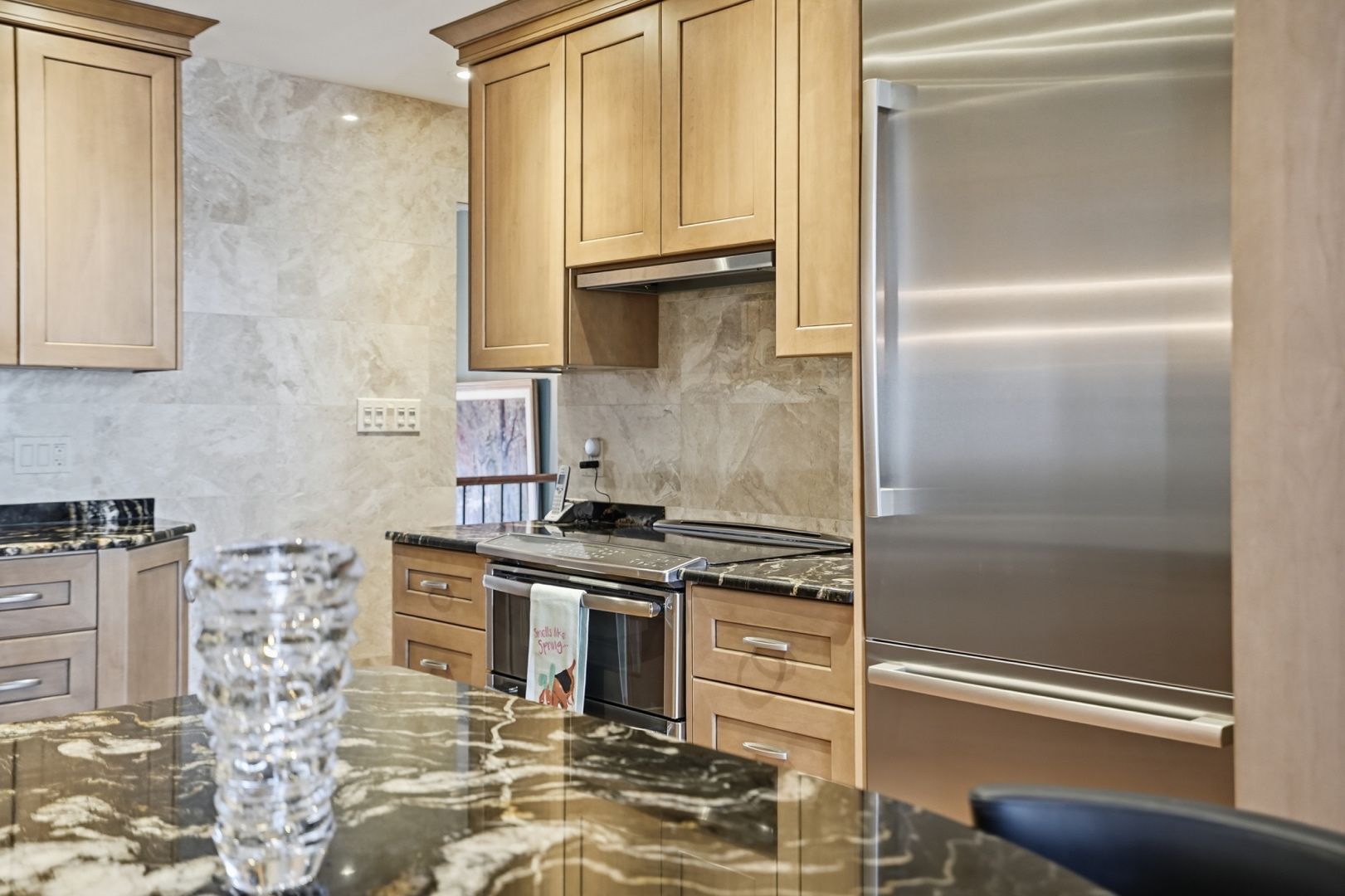 • Well-appointed kitchen with stainless steel appliances and granite countertops.