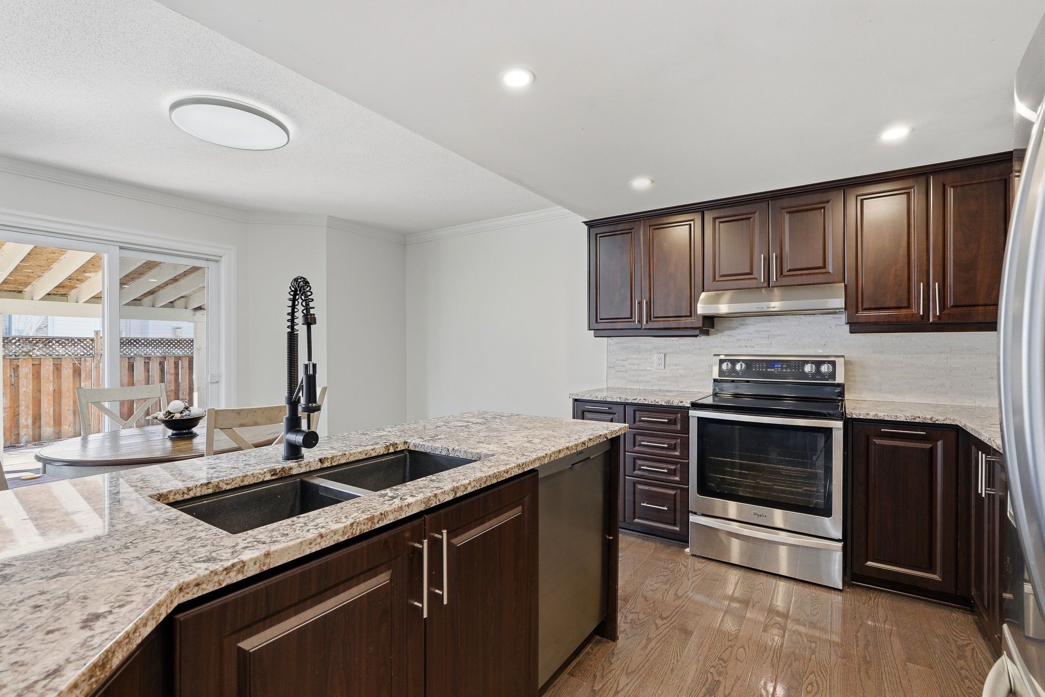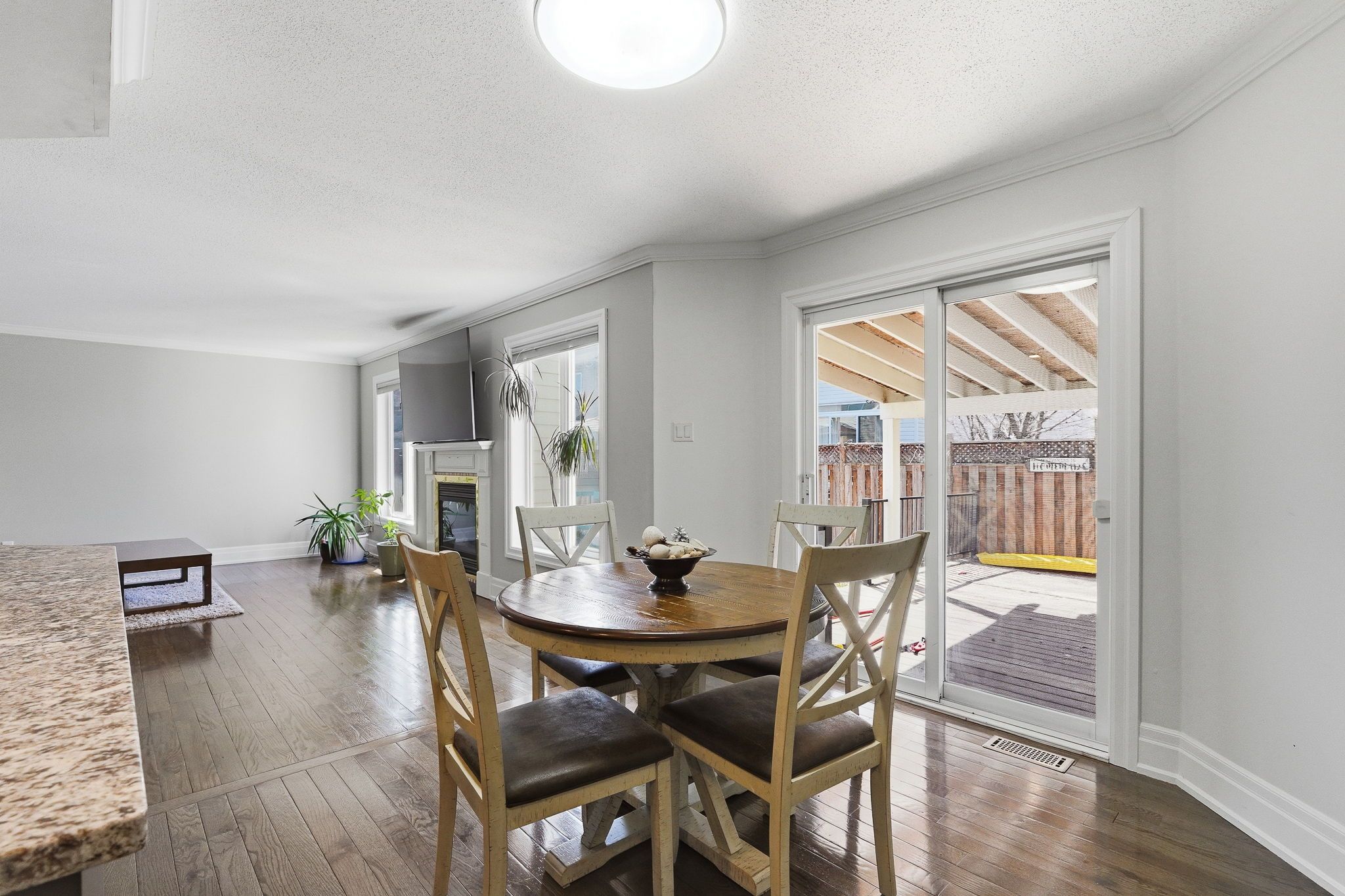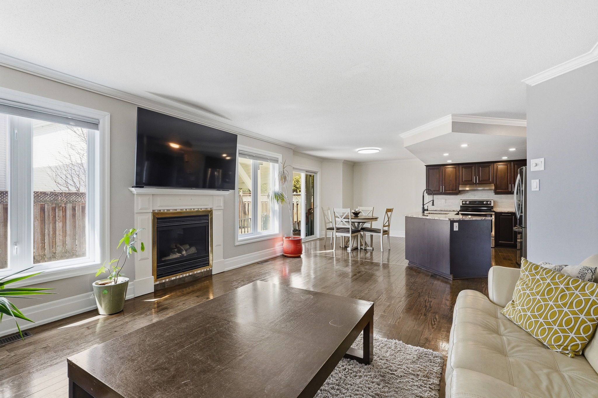 • Inviting family room with gas fireplace and access to fenced backyard.
