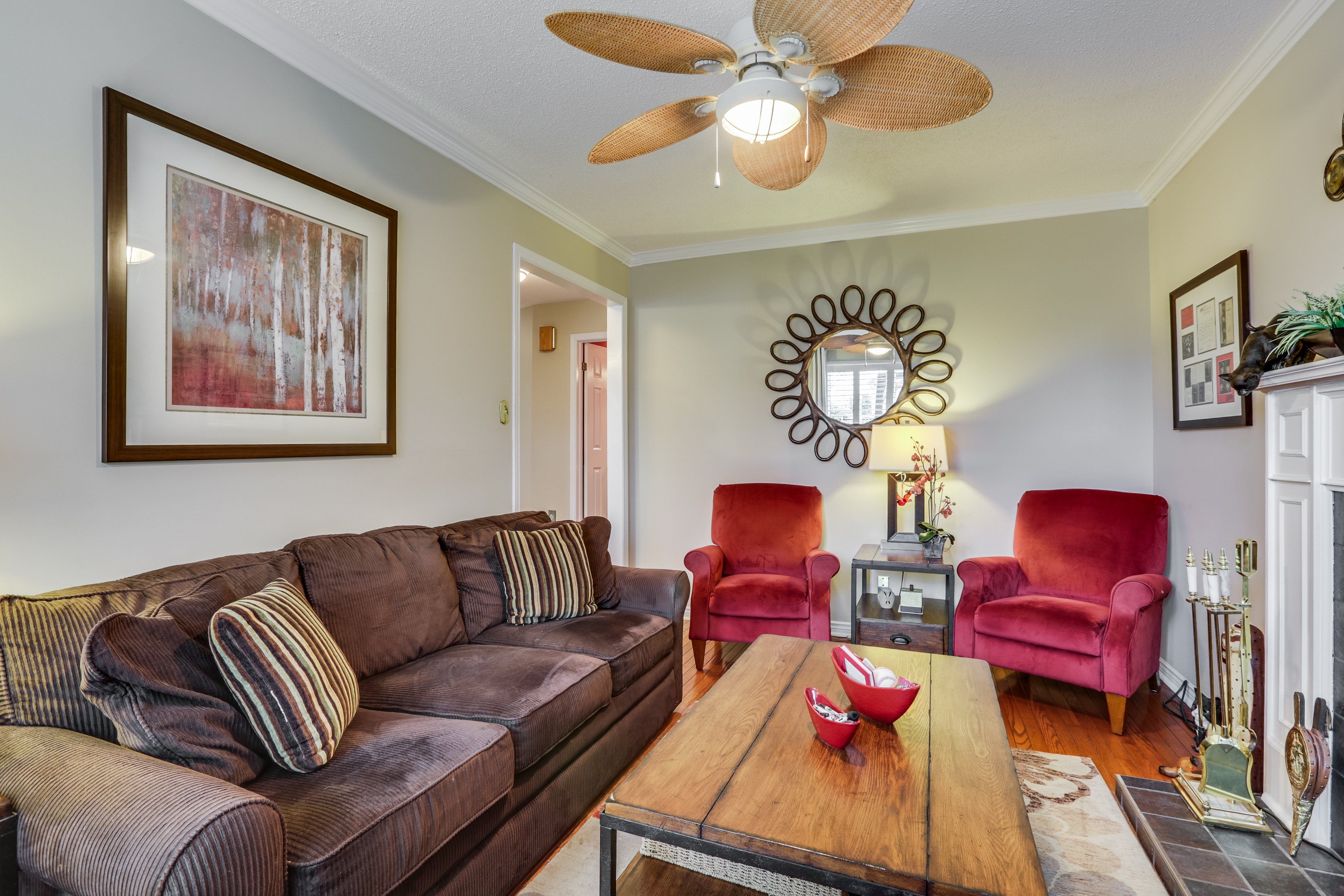 • Spacious main level with hardwood flooring and cozy family room with fireplace.