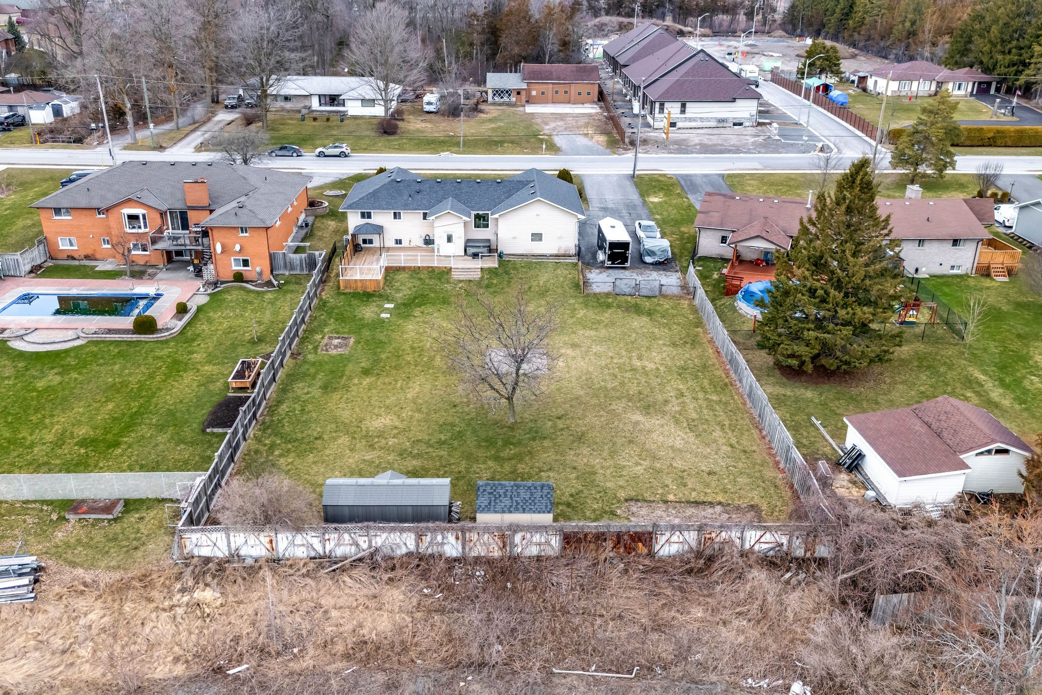 • Fully fenced yard with tiered decks, hot tub, and entertaining areas.