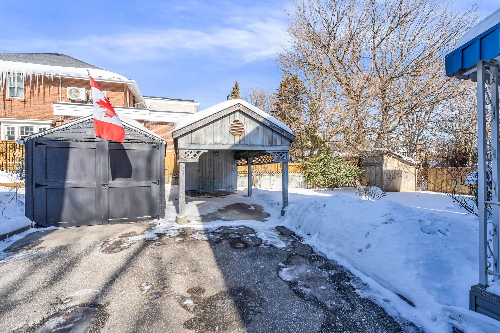 • Wide mutual driveway with carport and storage shed for convenience.