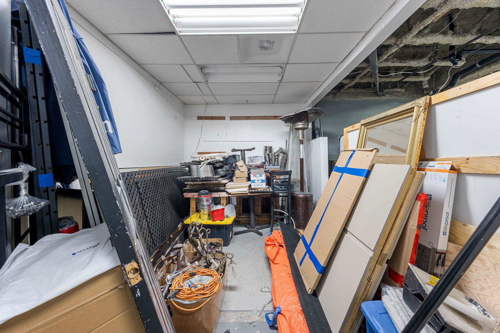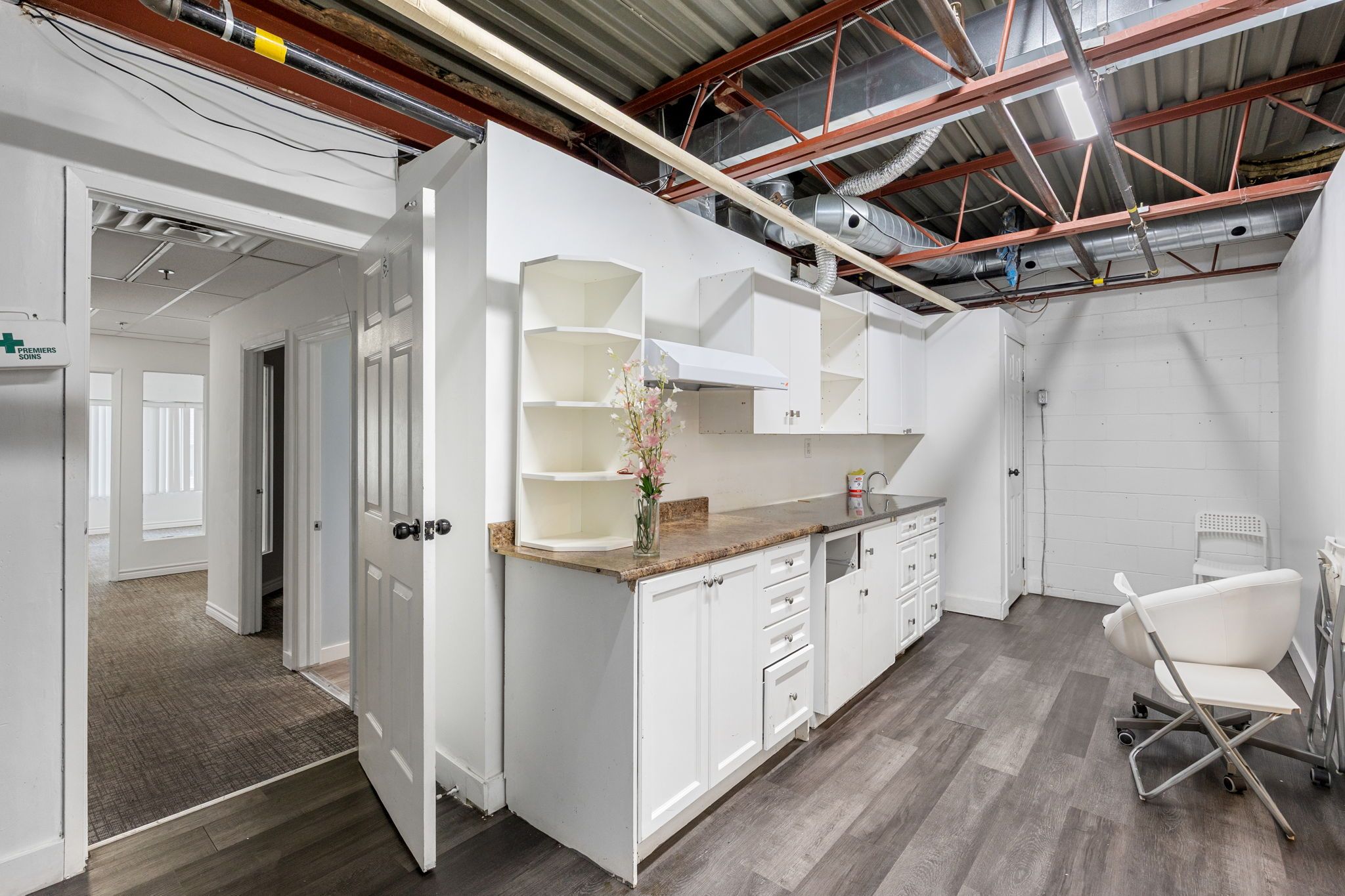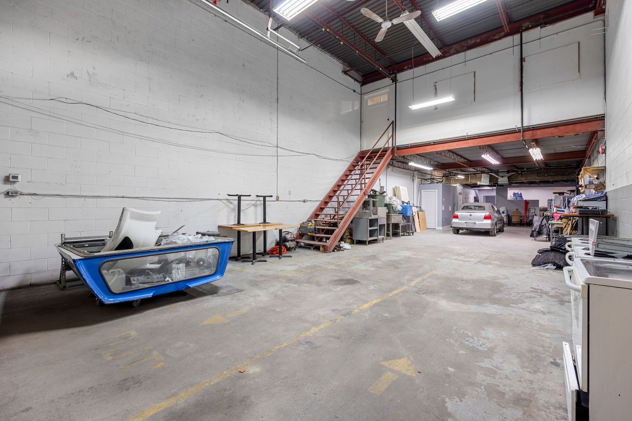 • Second floor mezzanine with office space, kitchenette, and bathrooms.