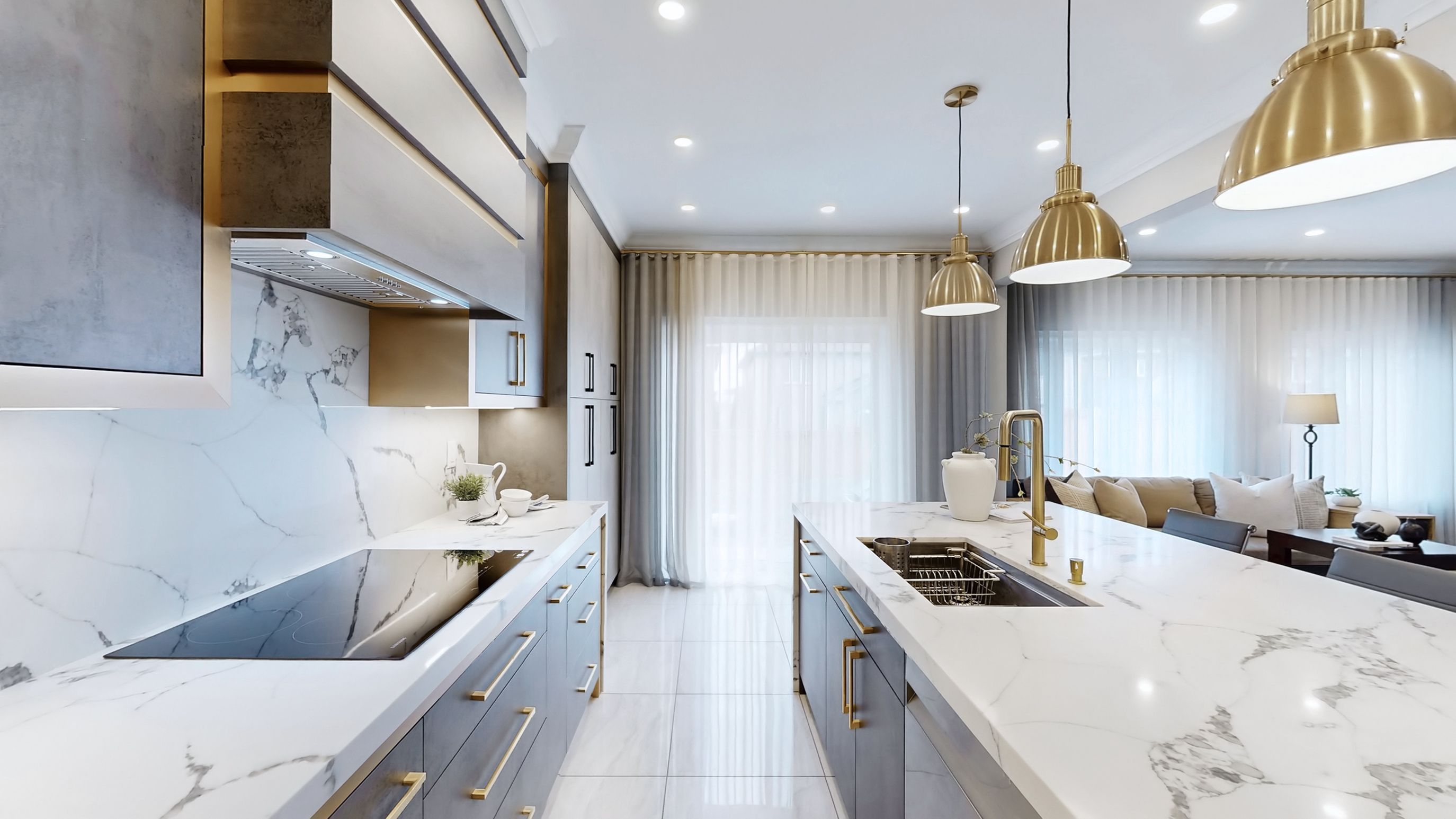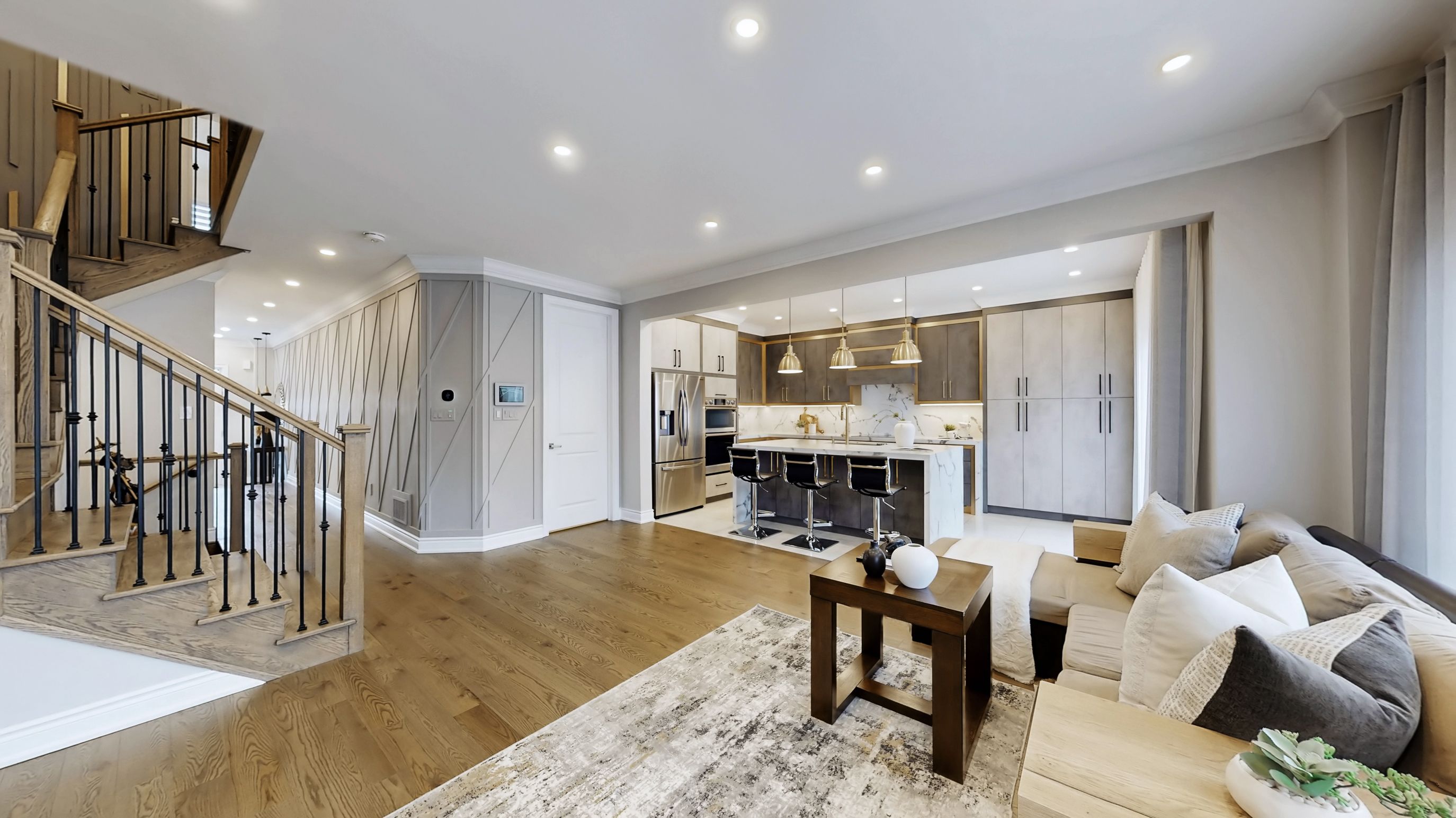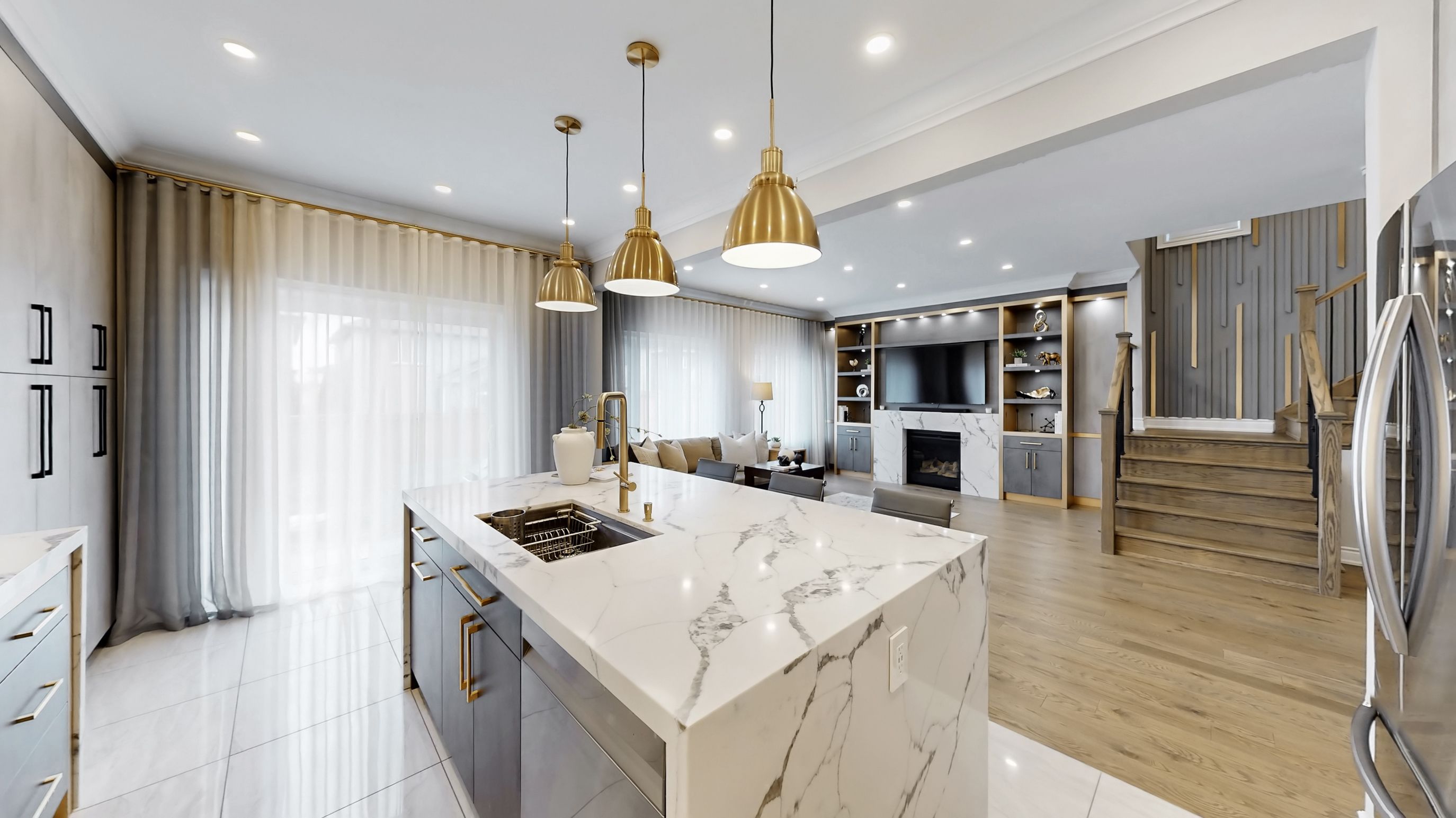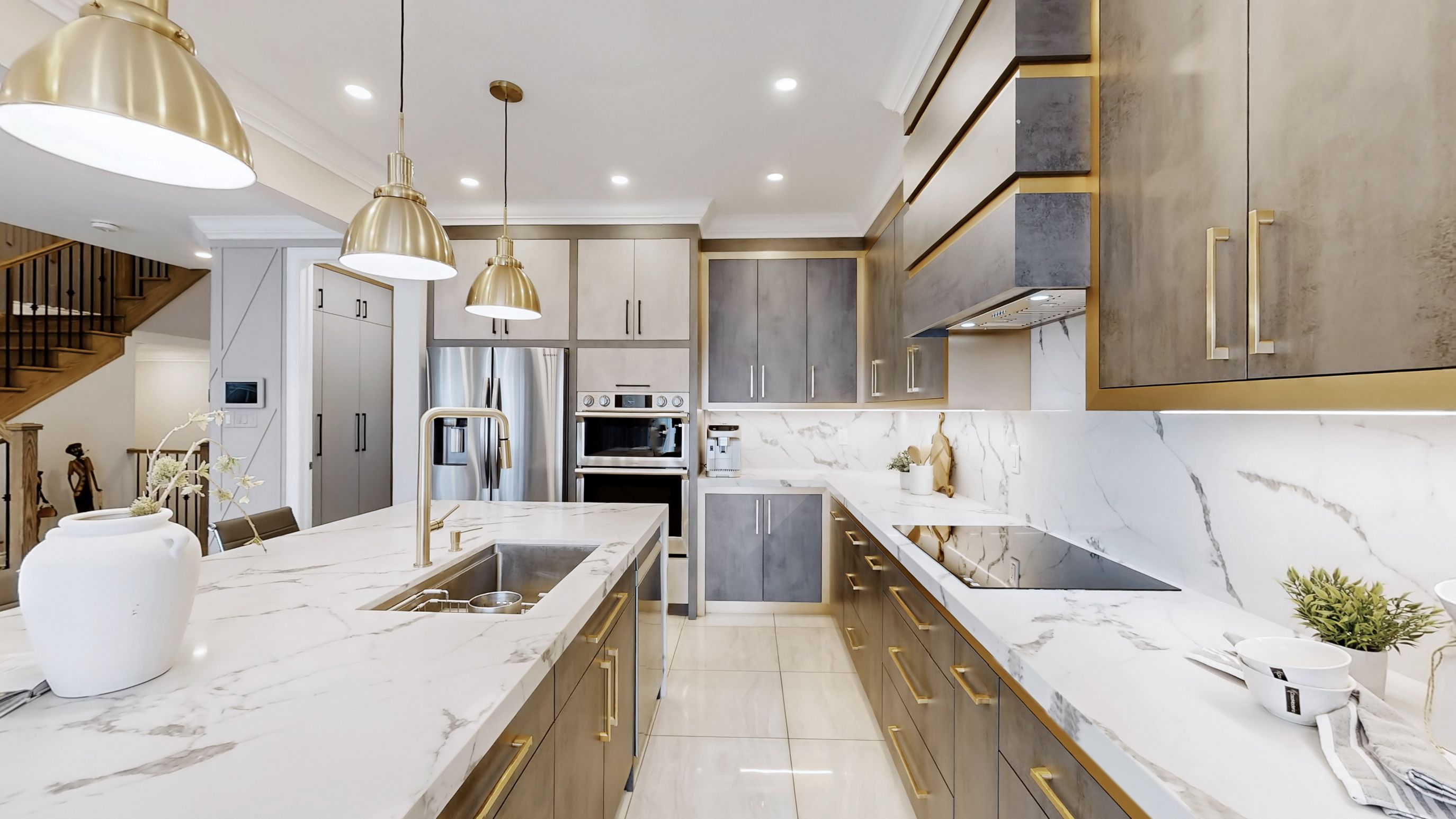 • Chef's kitchen featuring quartz countertops and premium Samsung appliances.