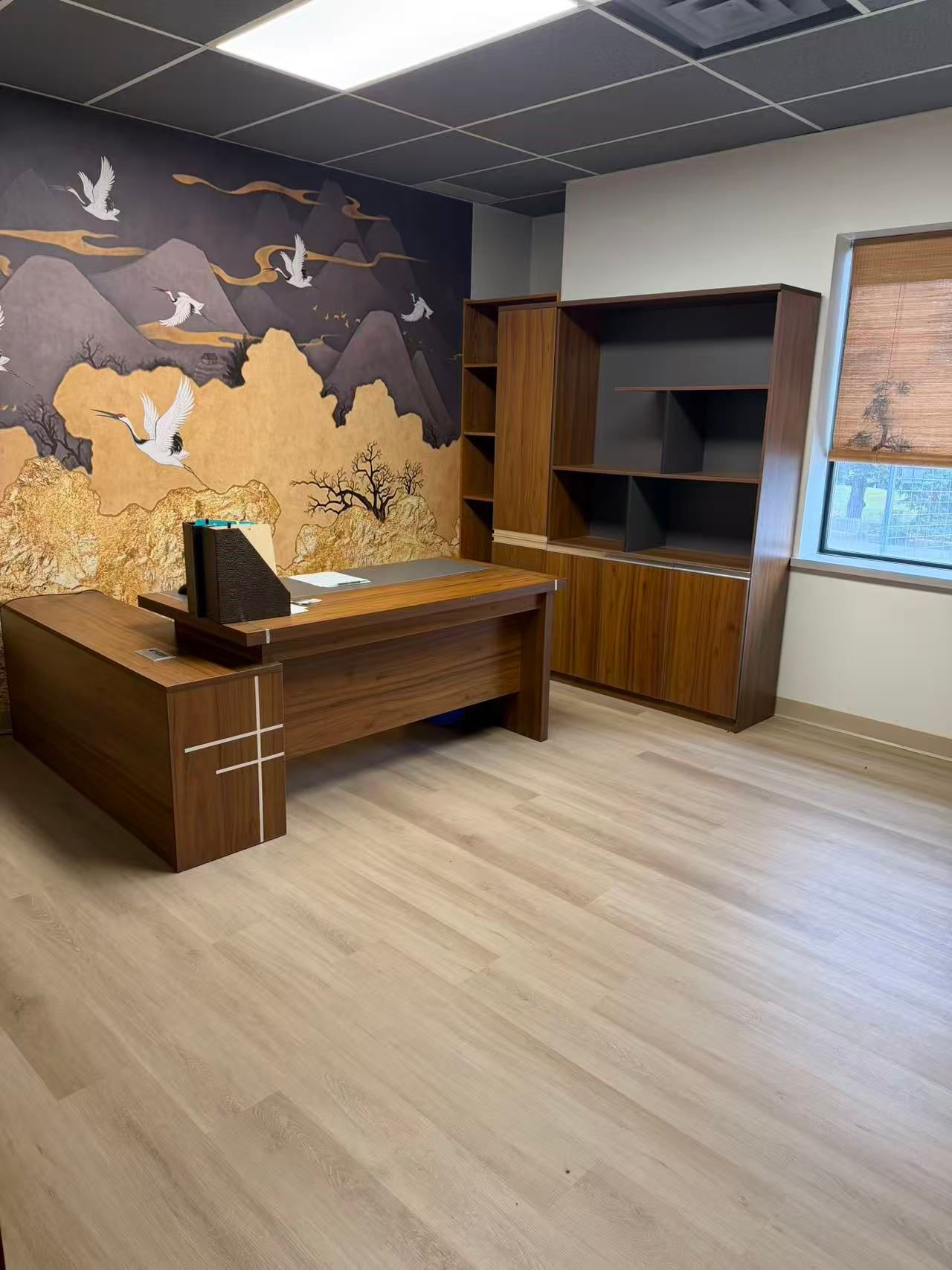 • Includes four private offices and a large open office area.