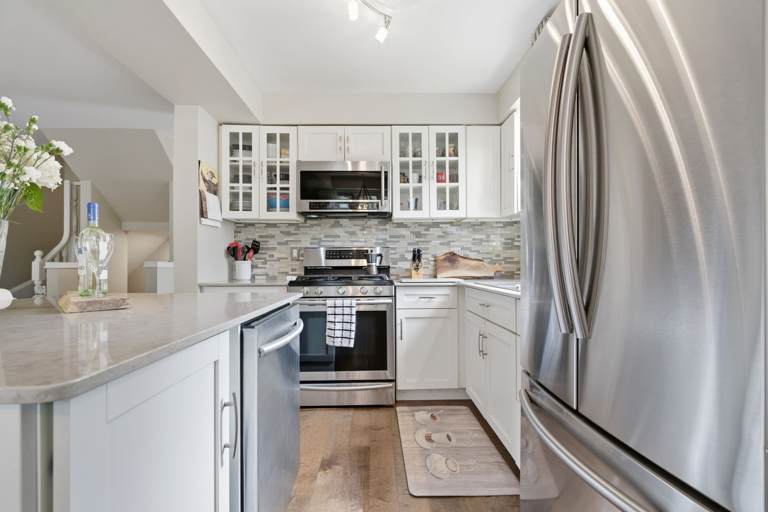 • Updated kitchen with quartz countertops and a gas stove for cooking.