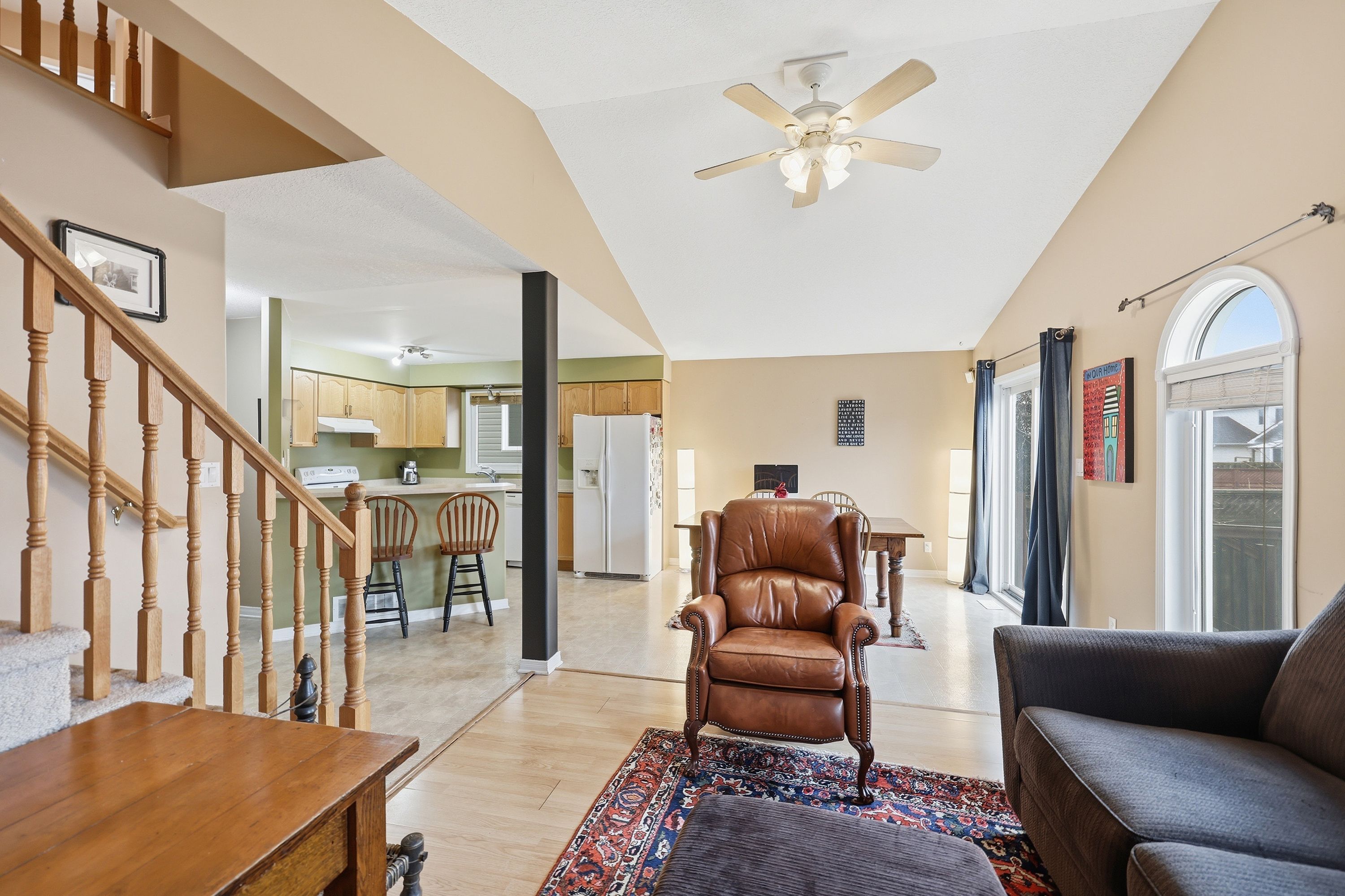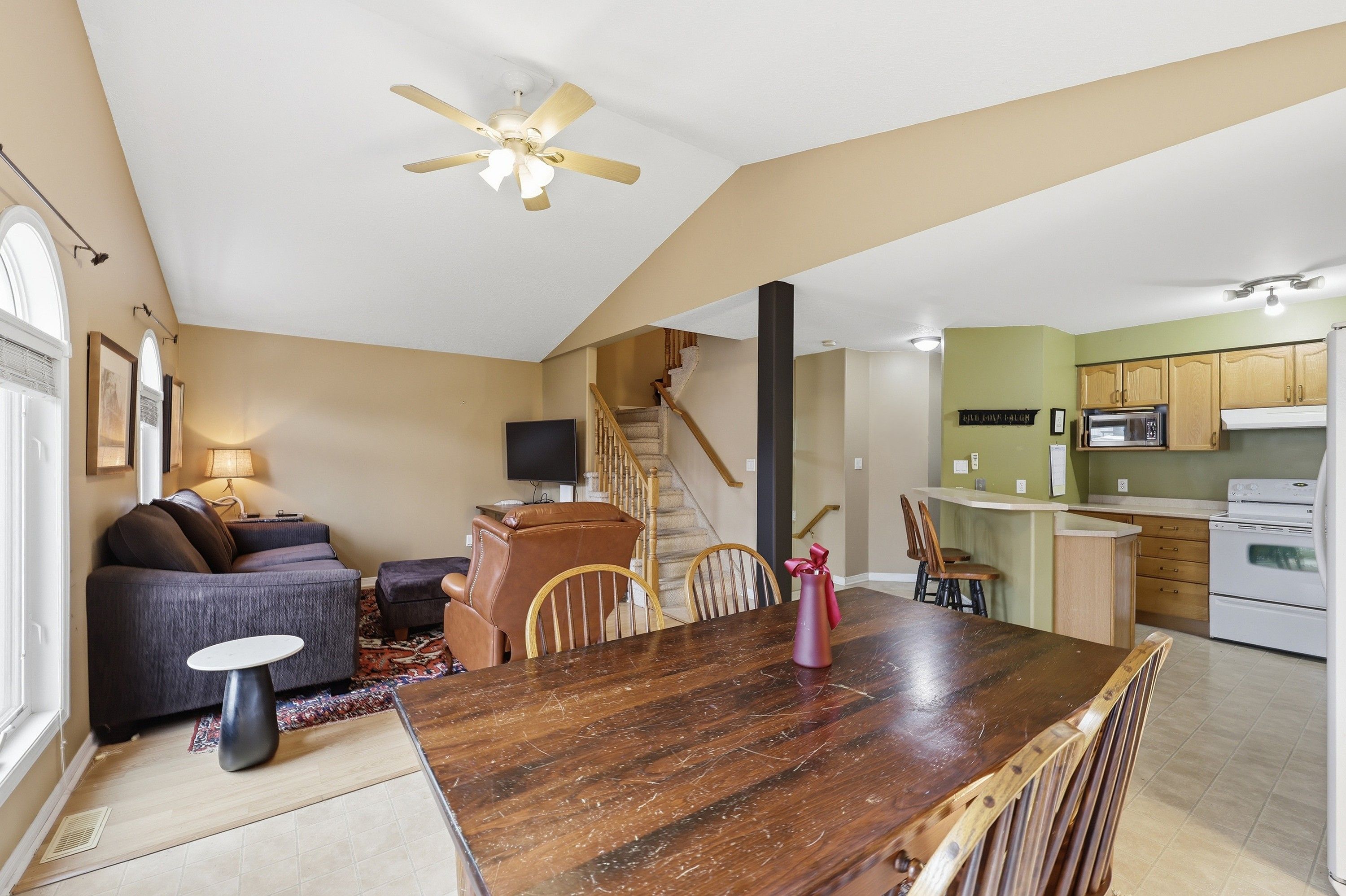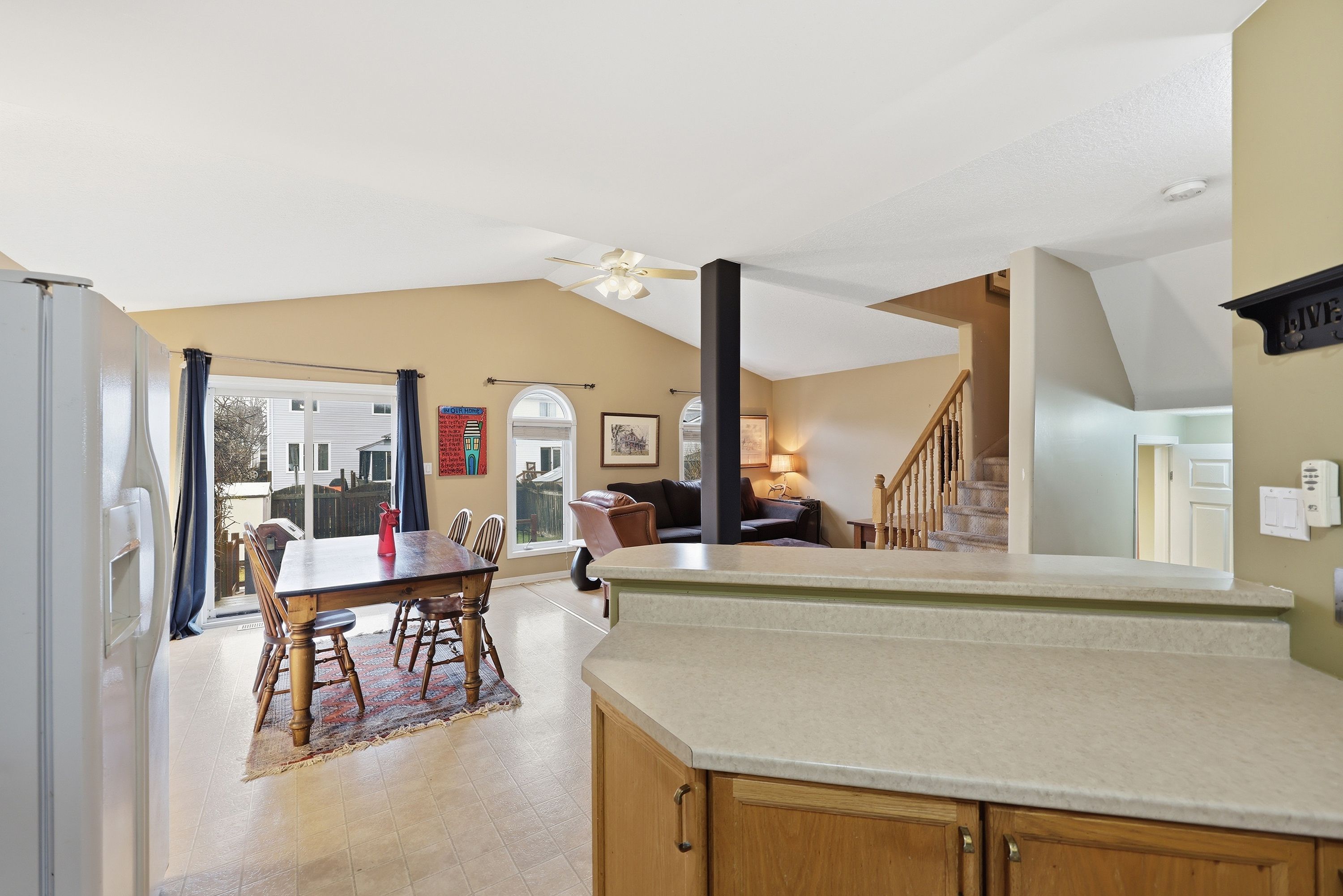 • Bright open concept main floor with vaulted ceilings and a functional kitchen.