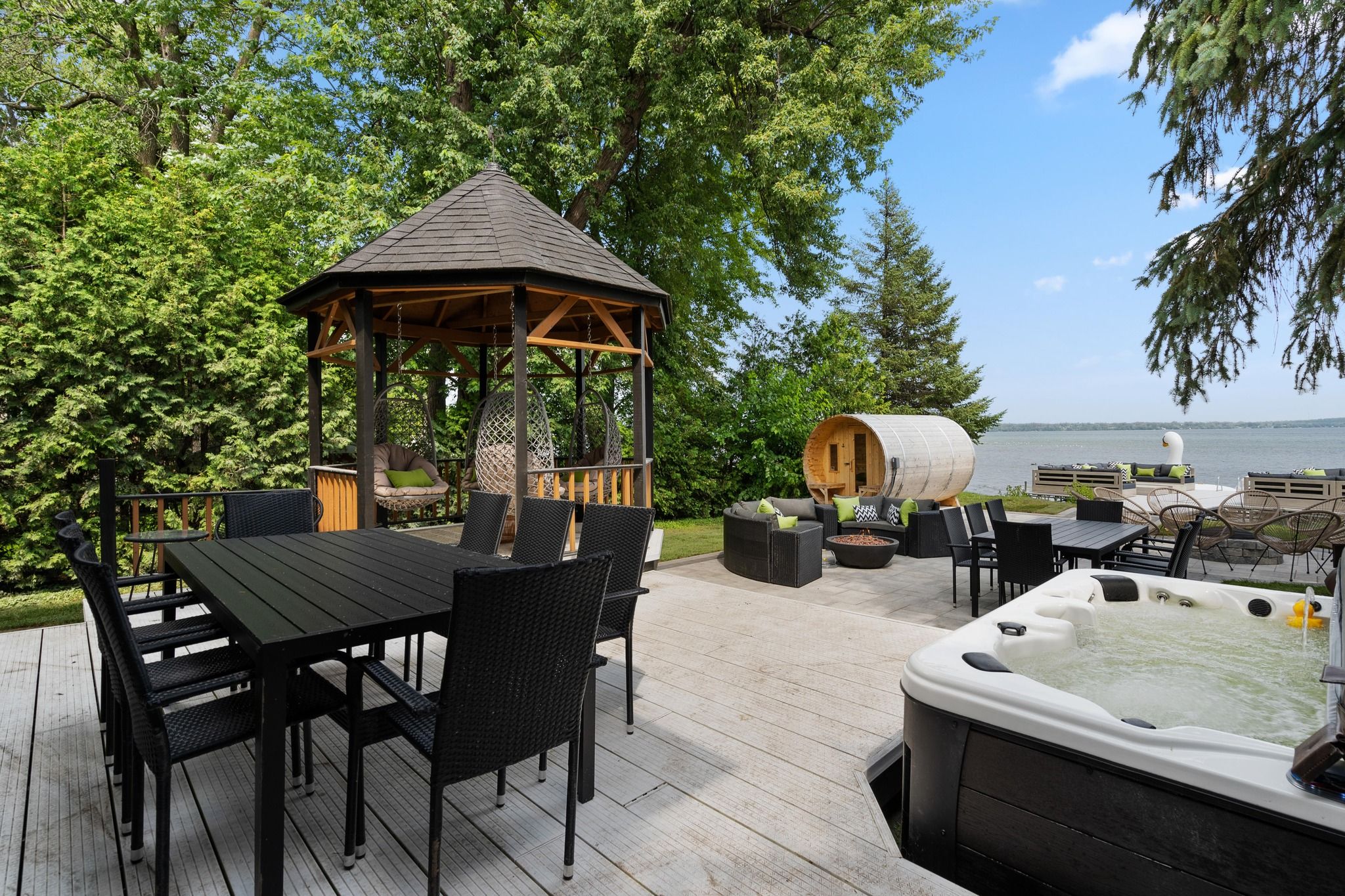 Stunning fully renovated private waterfront home on deep property nestled on the shores of lake simcoe. With 5 bedrooms plus office (2 being in a private in-law suite) and 5 full bathrooms, this home has room for the whole family! Whether lounging outside by the gas or natural fireplace, out on the custom composite dock, in the 12-person sauna or 8-person hot tub or on the composite deck, you will love every inch. Not to mention inside with primary suite facing lake simcoe with complete privacy, enjoy dual closets and ensuite. Two wings and staircases to this home are perfect for large families, or for the teenagers to have their own space. Two kitchen areas (both with quartz countertops), two living rooms, and bathrooms at every turn. Cozy up inside with the fireplace while relaxing music plays throughout the whole home's sound system. Dual second floor laundry is just another bonus but with almost everything being 2-4 years young it is turnkey move in ready to say the least. Gas bbq hookup, parking for 9 vehicles in oversized driveway, 4 car garage (double tandem) and just down from popular marina and restaurant, this lake home will leave you in awe. Don't miss the well-lit up home at dusk with pot lights everywhere or turn off the lights, take in the sunset and enjoy the views under the gazebo. This waterfront beauty has perfection written all over it. 2025 garage door openers, 2024 pressure tank, 2021 ac, and furnace, 2022 all landscaping and extensive patio areas and firepit, 2022 dock, 2021 hot water tank, 2016 uv system, 2025 uv light, 2025 professionally painted benjamin moore
