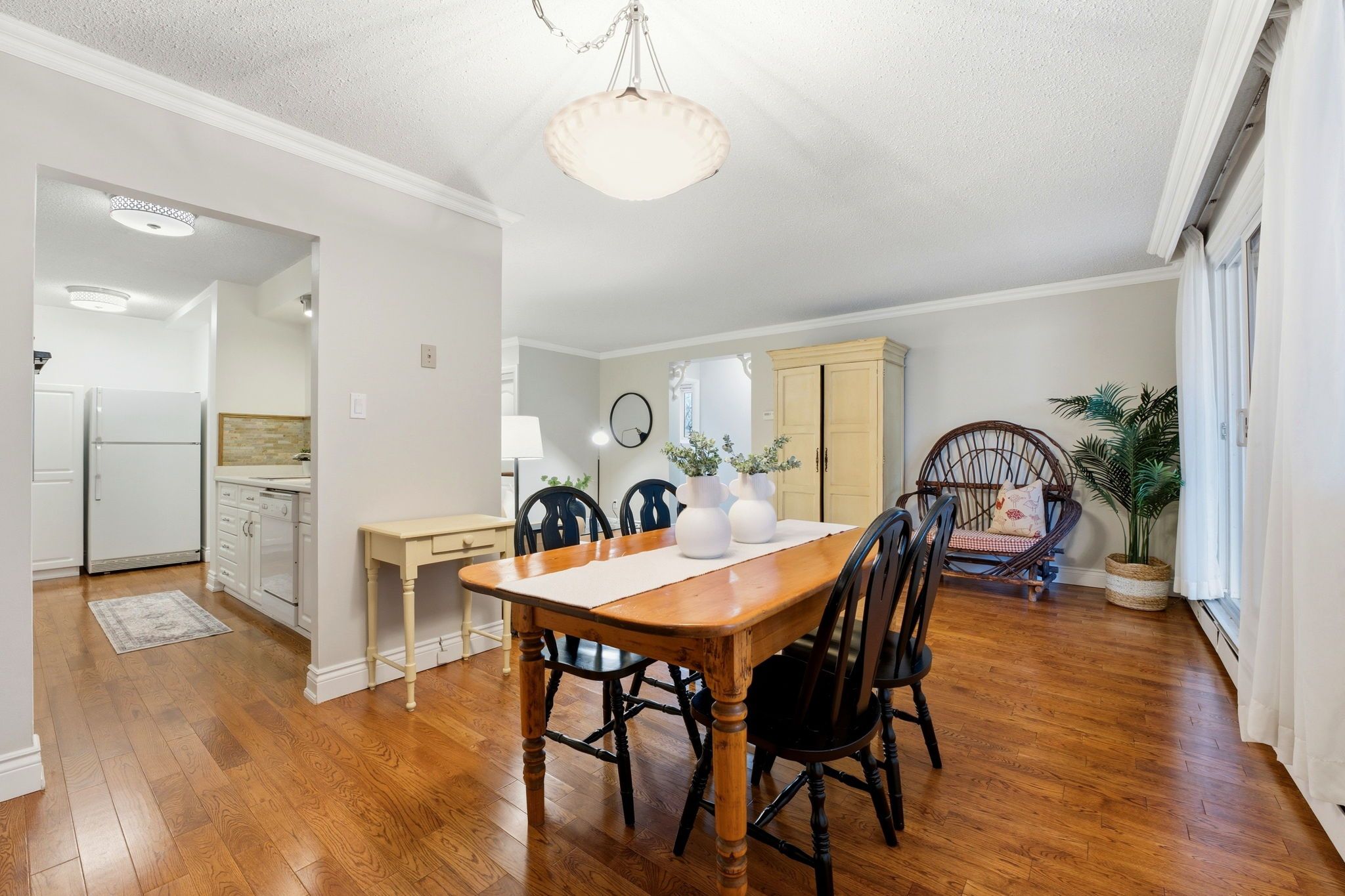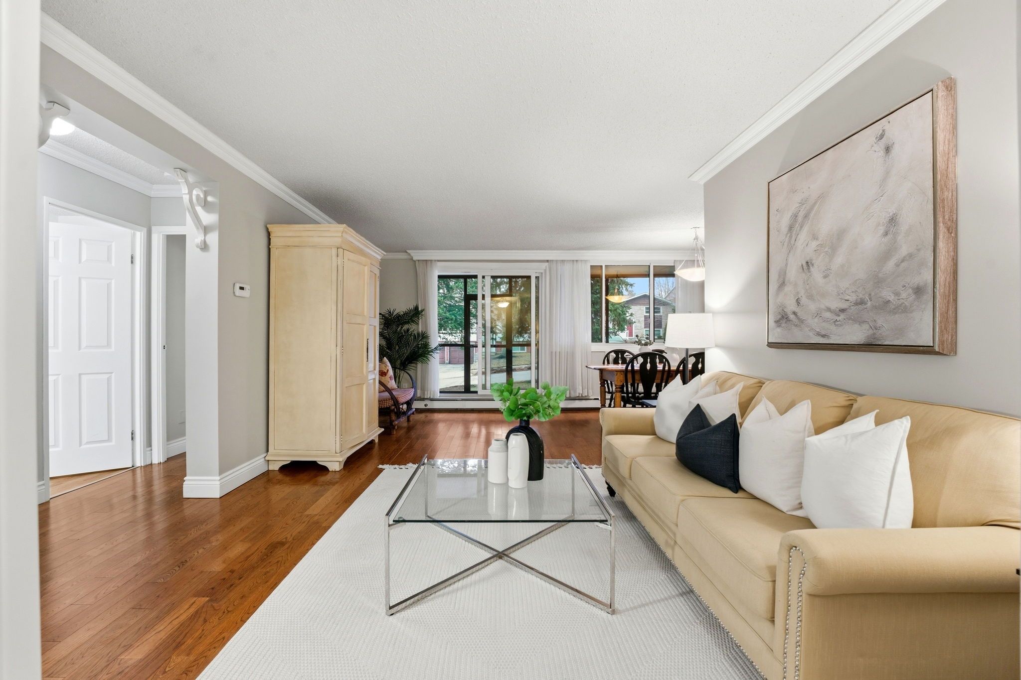 Welcome to this bright and well-maintained ground floor 2-bedroom apartment offering comfortable living in a convenient location. The unit features a functional galley-style kitchen with crisp white cabinetry, ample counter space, and a stylish tile backsplash. Hardwood flooring flows through the living areas and bedrooms, creating a warm and inviting atmosphere. Both bedrooms are generously sized with large windows that allow for plenty of natural light. The enclosed porch provides additional living space - perfect for a cozy sitting area, home office, or sunroom to enjoy year-round. Residents will appreciate the secure building entrance and clean, welcoming lobby. This unit offers practical living with a thoughtful layout and plenty of storage. Ideally located close to amenities, transit, and green space, this apartment is perfect for first-time buyers, downsizers, or investors looking for a low-maintenance property.