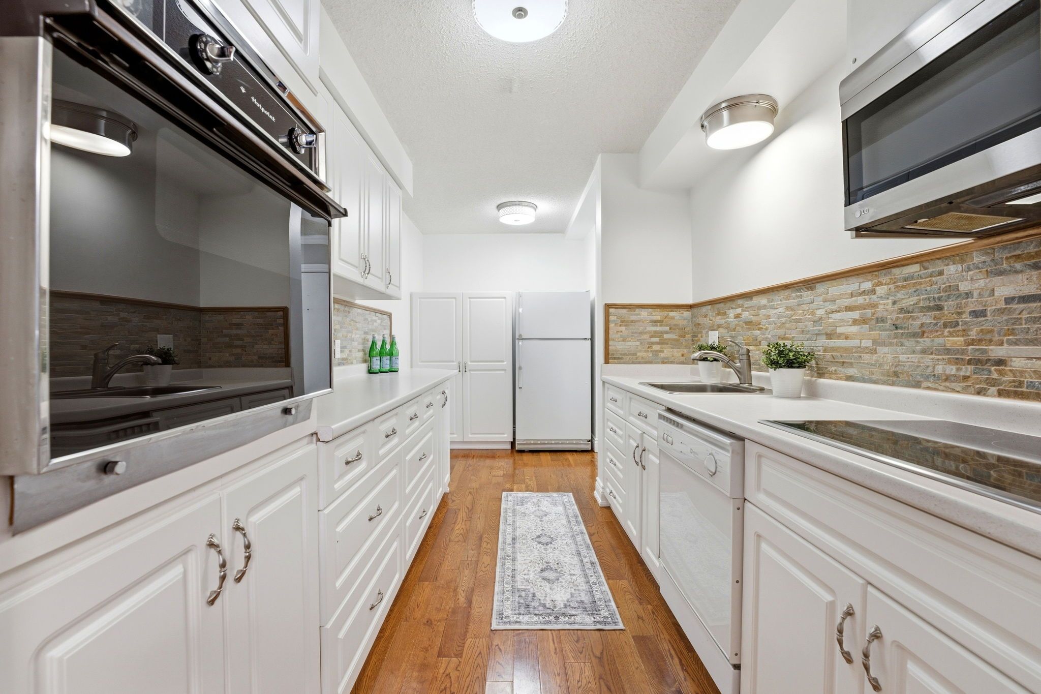• Functional galley kitchen with ample counter space and stylish backsplash.