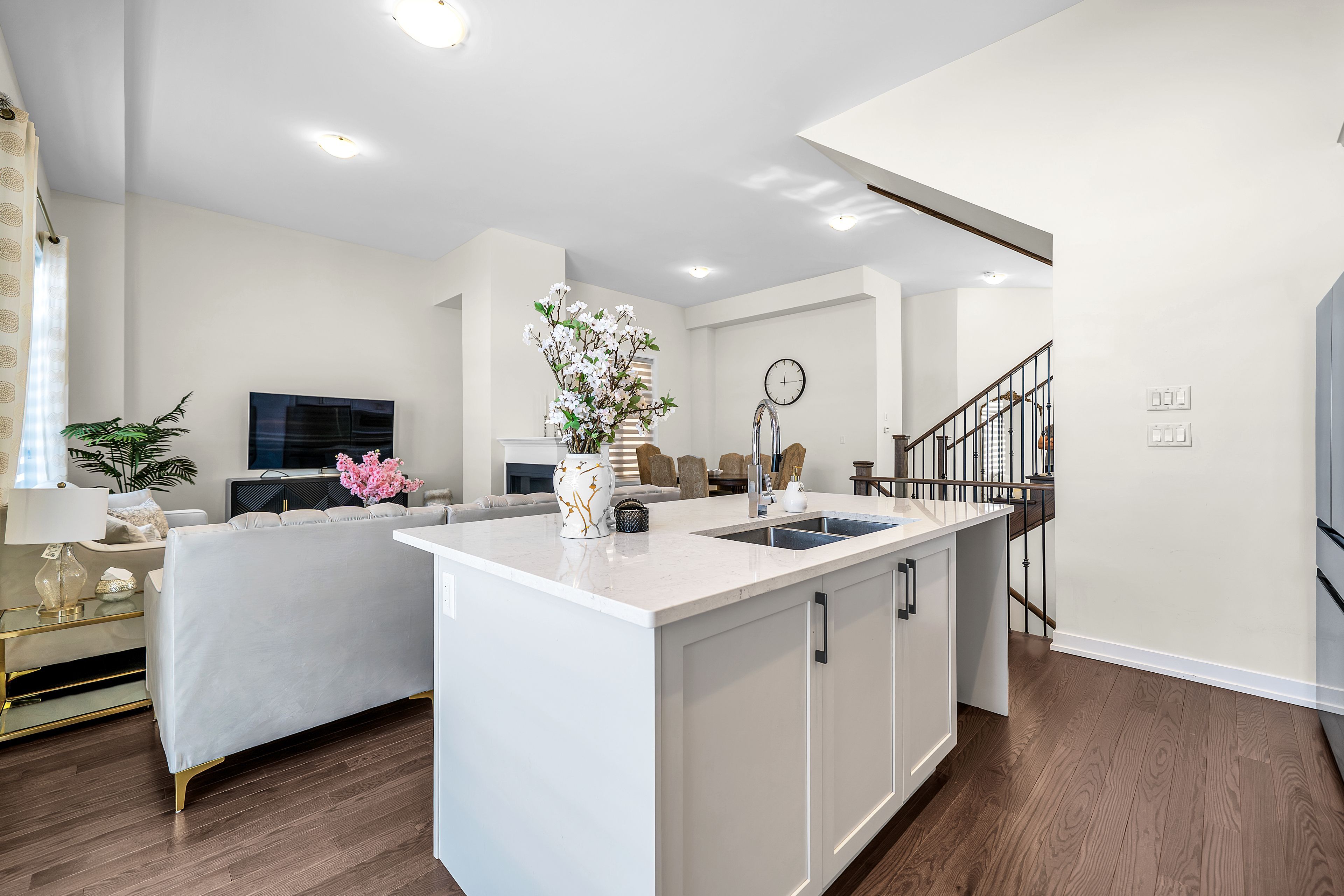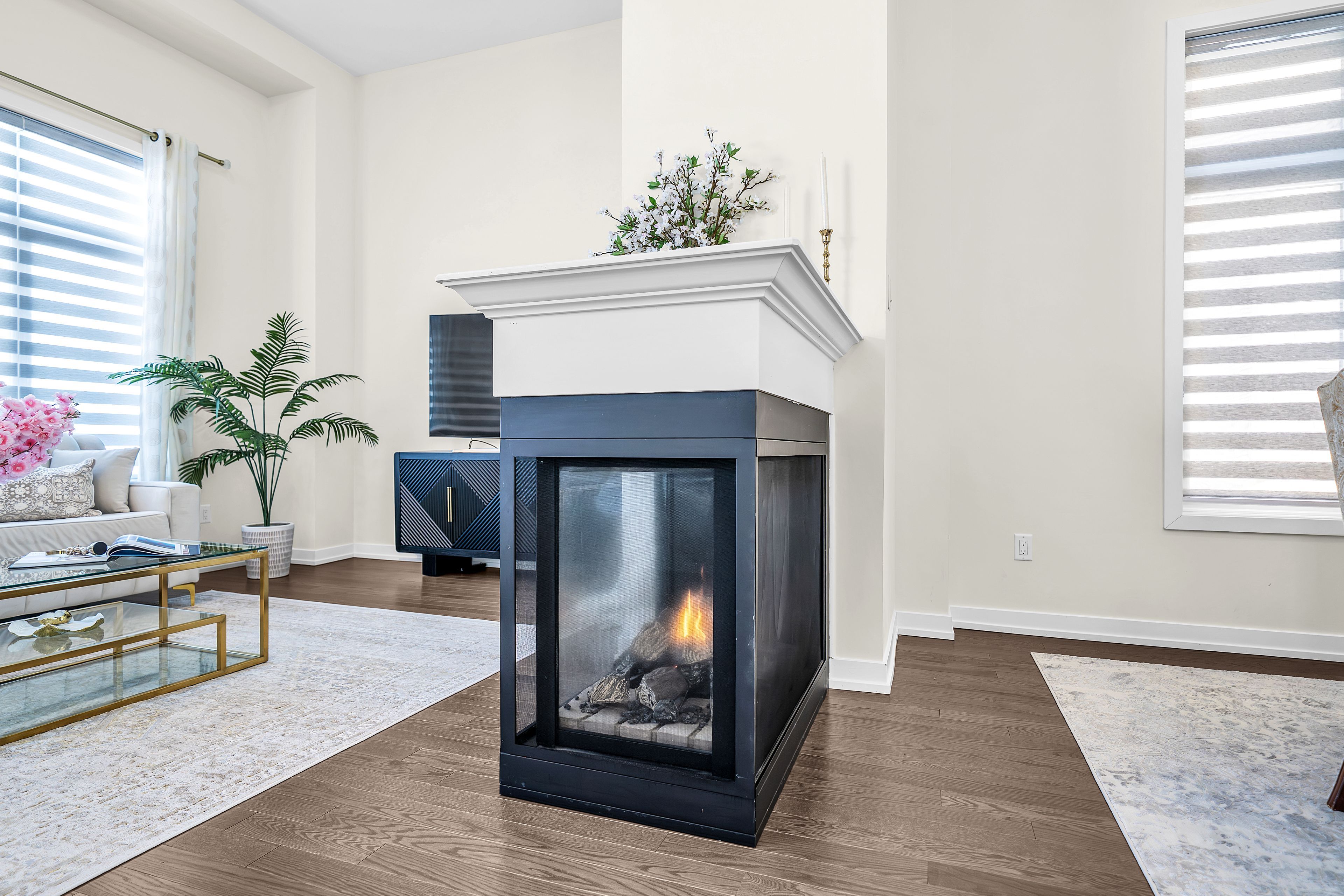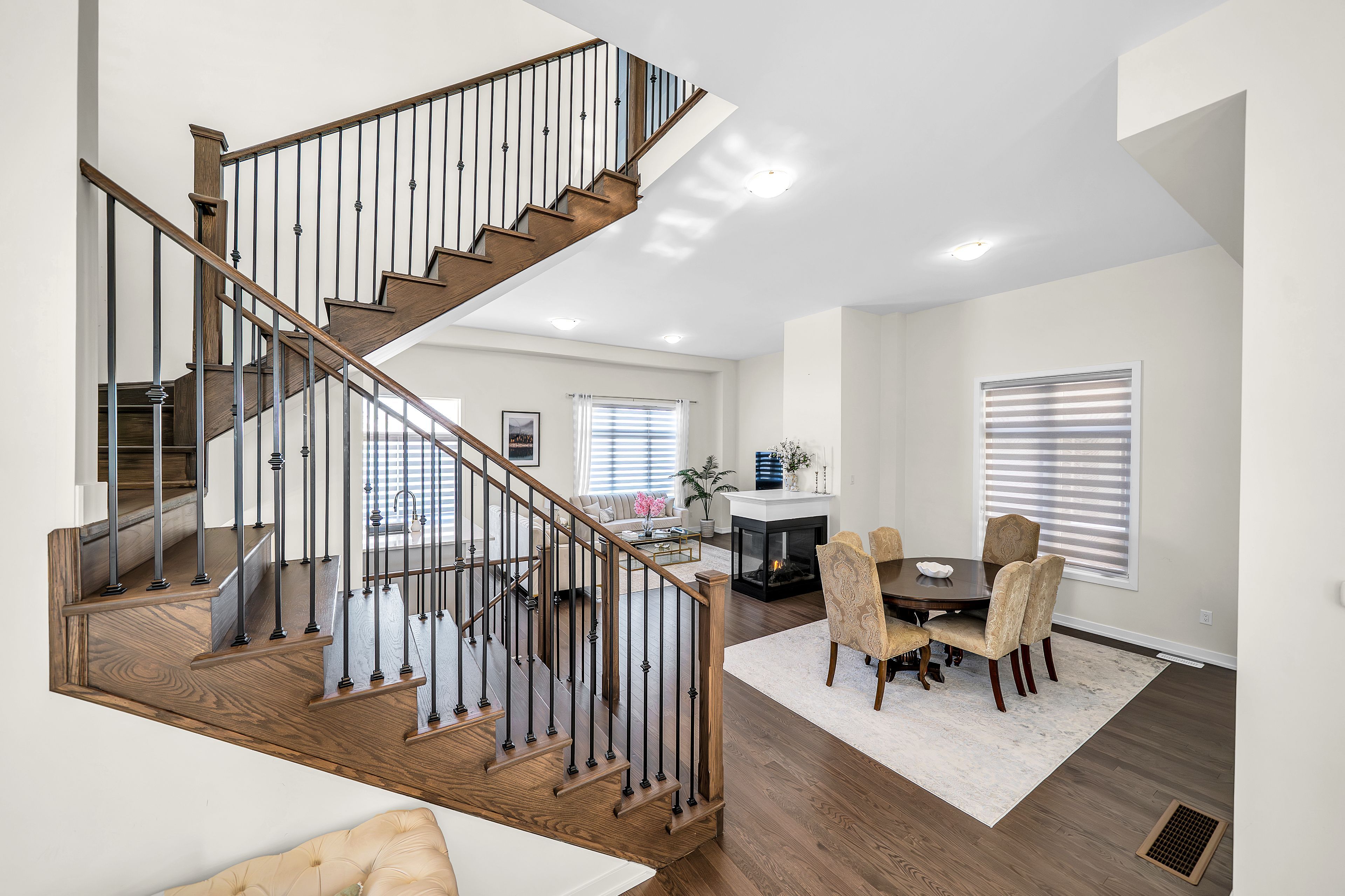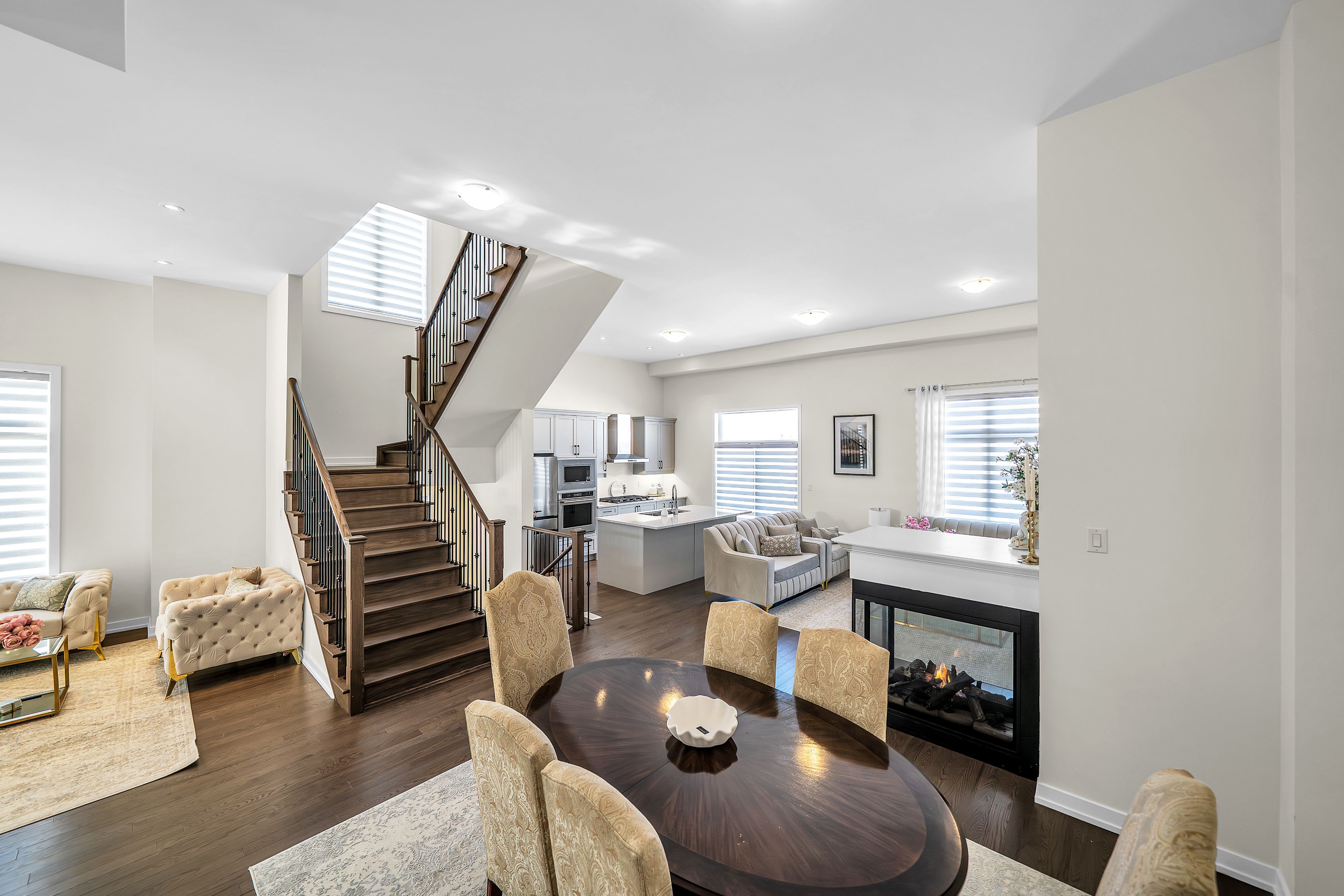 • Bright, open-concept main floor with hardwood flooring and gas fireplace.