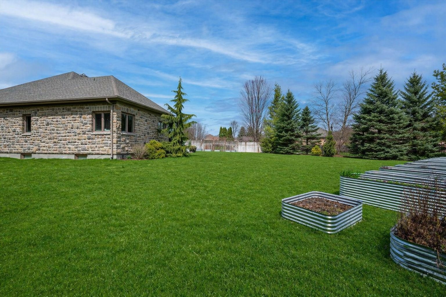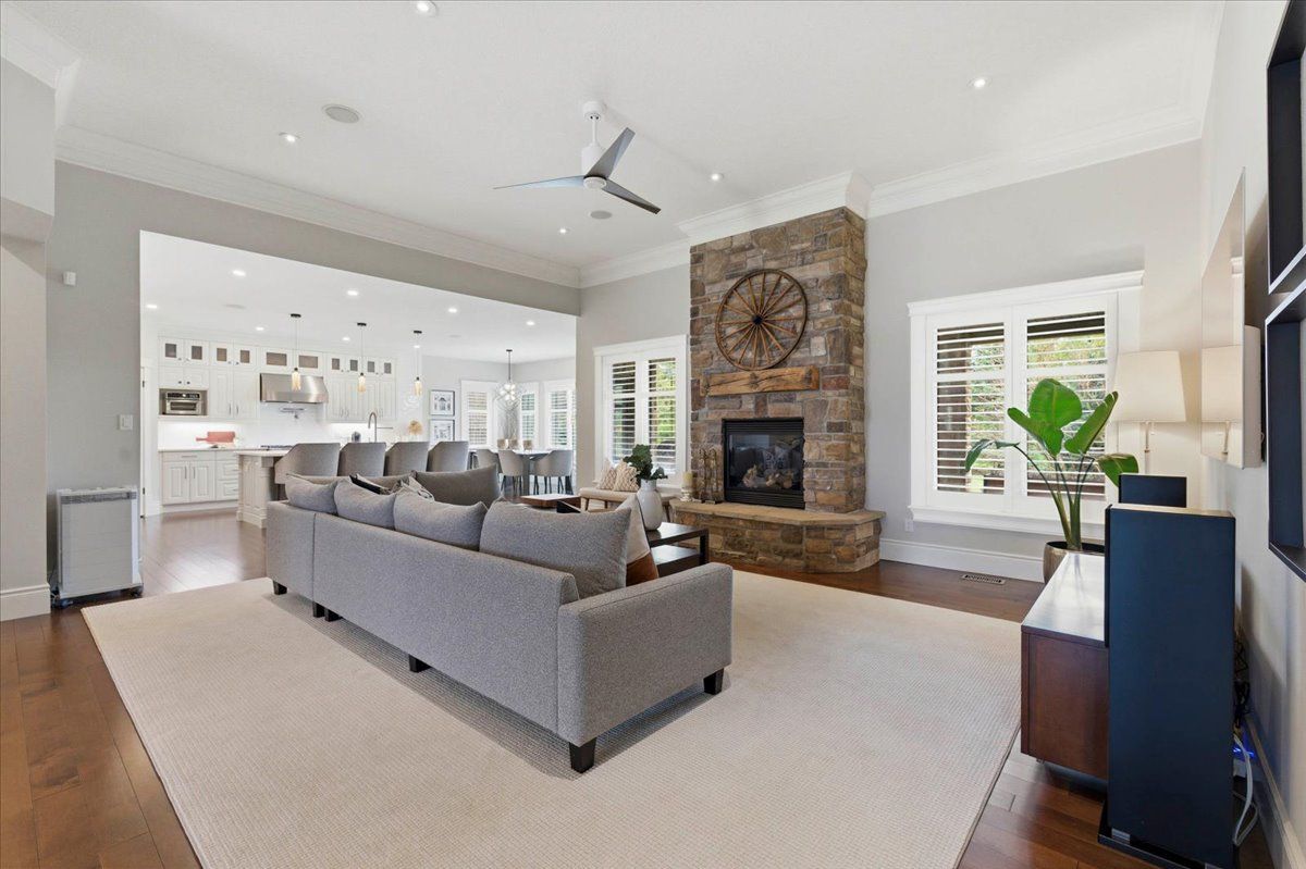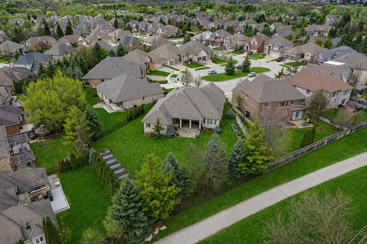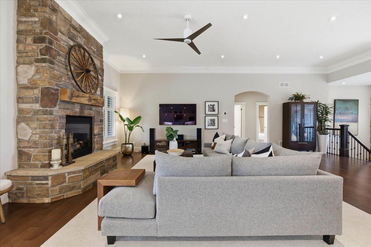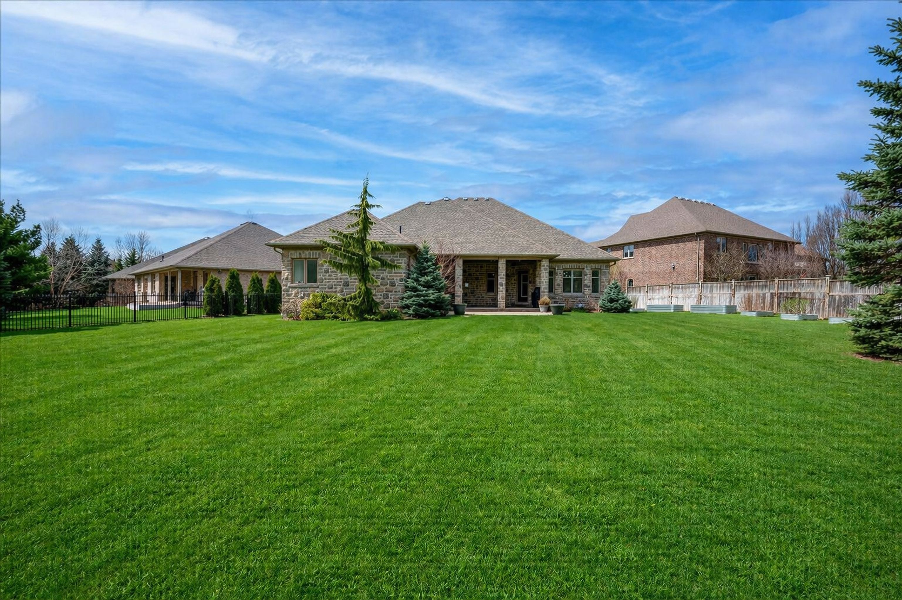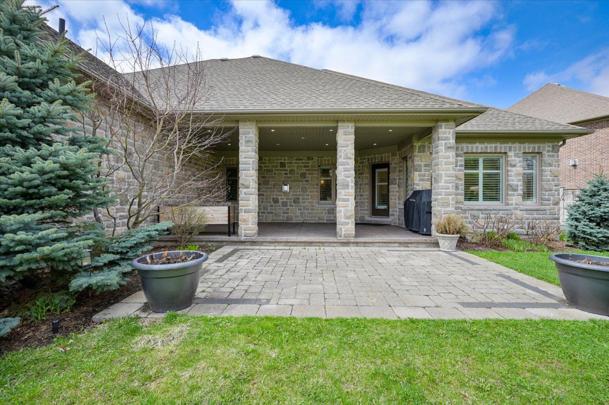 Set on a quiet cul de sac in deer ridge estates, 945 riverstone drive sits on an expansive pie-shaped lot of a third of an acre, where lots of this size, privacy, and no rear neighbours are rarely found in deer ridge estates. Built entirely in stone, this bungalow offers over 5,200 sq ft of fully finished living space and presents with quiet confidence from the street, surrounded by mature landscaping. Inside, the home opens with 10 foot ceilings and a layout that flows naturally from one space to the next. The kitchen is the focal point of the main living area. A full 9 foot quartz island anchors the space, paired with custom cabinetry, a sub zero fridge, and a viking six burner gas range. It connects directly to the dining area and main living space, where a stone fireplace and large windows overlook the backyard. The main level offers three well proportioned bedrooms, including a primary suite set apart with dual walk-in closets and a spacious ensuite with heated floors, double vanity, and soaker tub. The lower level is fully finished and thoughtfully designed as a natural extension of the home, with a large recreation area, guest suite, full bathroom, and wet bar. A covered stone porch extends the living space outdoors, designed for both dining and lounging, and opens to a fully fenced backyard enclosed with iron rod fencing, making full use of the third of an acre lot, framed by mature evergreens and complemented by raised garden beds. Steps to the walter bean grand river trail, minutes from deer ridge golf club, and with easy access to highways, restaurants, entertainment, and shopping, this is a one-of-a-kind offering in one of kitchener's most established neighbourhoods.