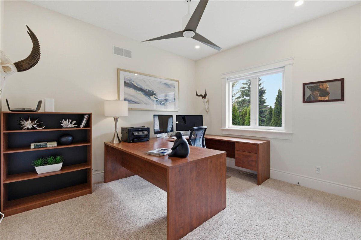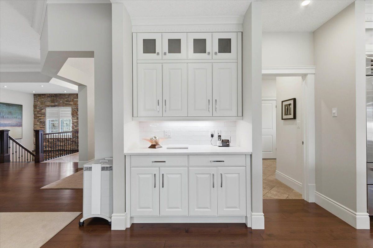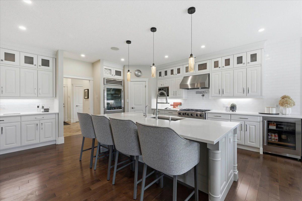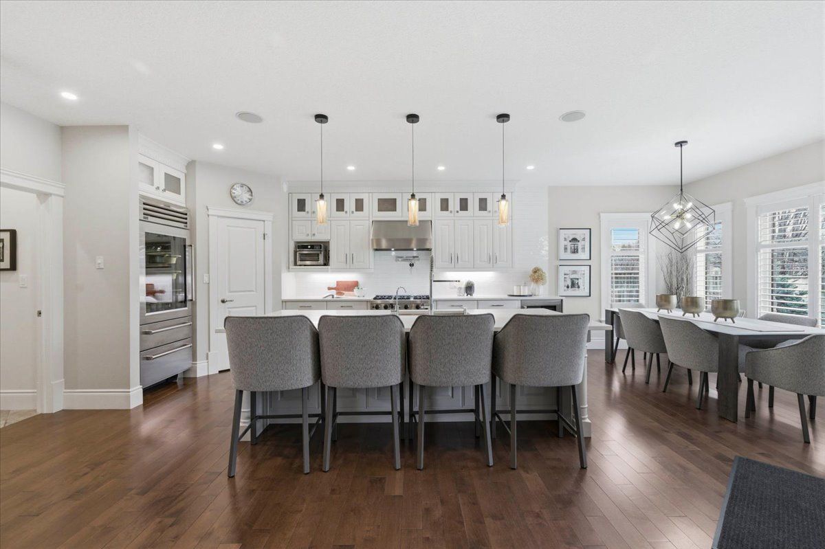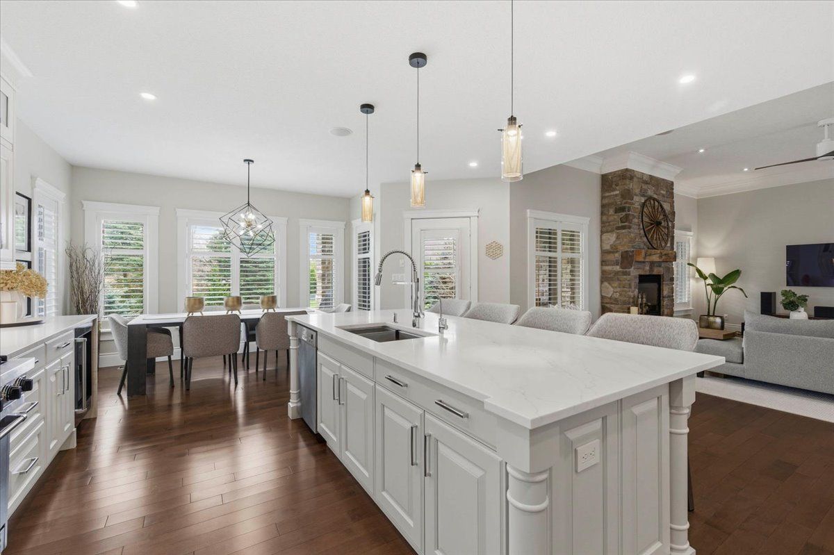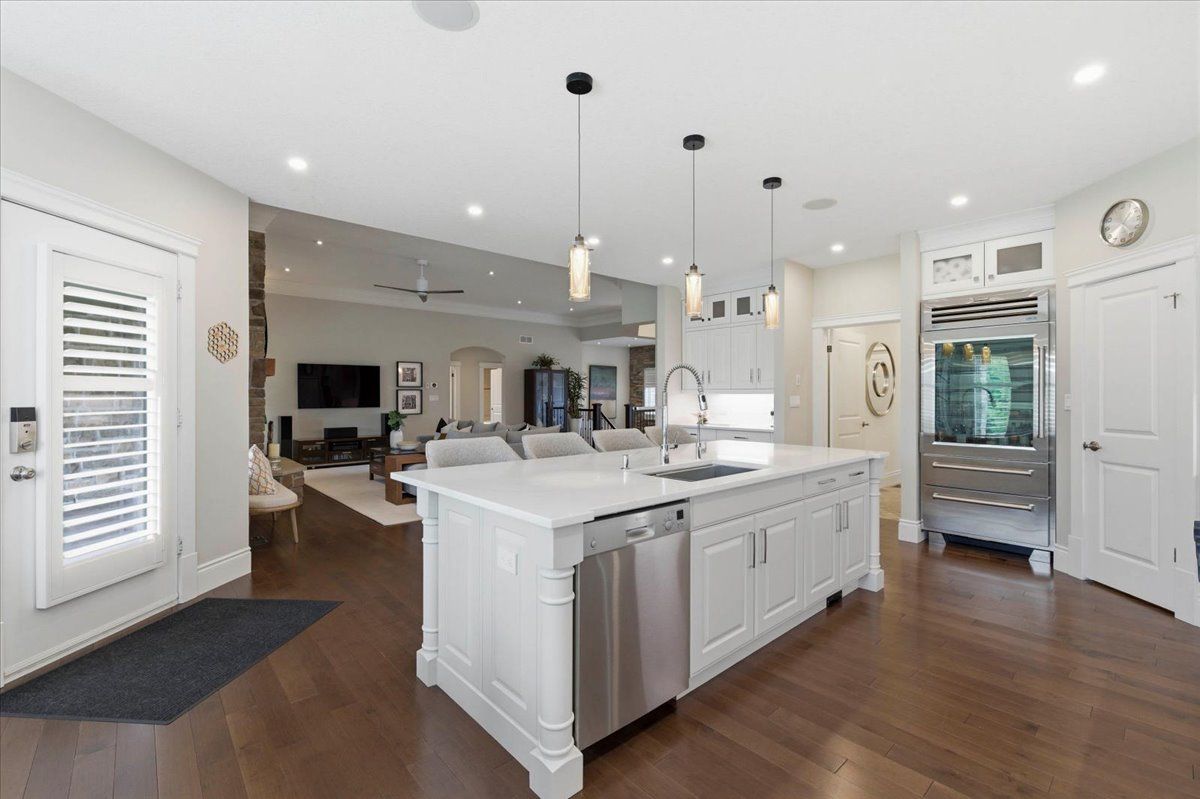 Set on a quiet cul de sac in deer ridge estates, 945 riverstone drive sits on an expansive pie-shaped lot of a third of an acre, where lots of this size, privacy, and no rear neighbours are rarely found in deer ridge estates. Built entirely in stone, this bungalow offers over 5,200 sq ft of fully finished living space and presents with quiet confidence from the street, surrounded by mature landscaping. Inside, the home opens with 10 foot ceilings and a layout that flows naturally from one space to the next. The kitchen is the focal point of the main living area. A full 9 foot quartz island anchors the space, paired with custom cabinetry, a sub zero fridge, and a viking six burner gas range. It connects directly to the dining area and main living space, where a stone fireplace and large windows overlook the backyard. The main level offers three well proportioned bedrooms, including a primary suite set apart with dual walk-in closets and a spacious ensuite with heated floors, double vanity, and soaker tub. The lower level is fully finished and thoughtfully designed as a natural extension of the home, with a large recreation area, guest suite, full bathroom, and wet bar. A covered stone porch extends the living space outdoors, designed for both dining and lounging, and opens to a fully fenced backyard enclosed with iron rod fencing, making full use of the third of an acre lot, framed by mature evergreens and complemented by raised garden beds. Steps to the walter bean grand river trail, minutes from deer ridge golf club, and with easy access to highways, restaurants, entertainment, and shopping, this is a one-of-a-kind offering in one of kitchener's most established neighbourhoods.