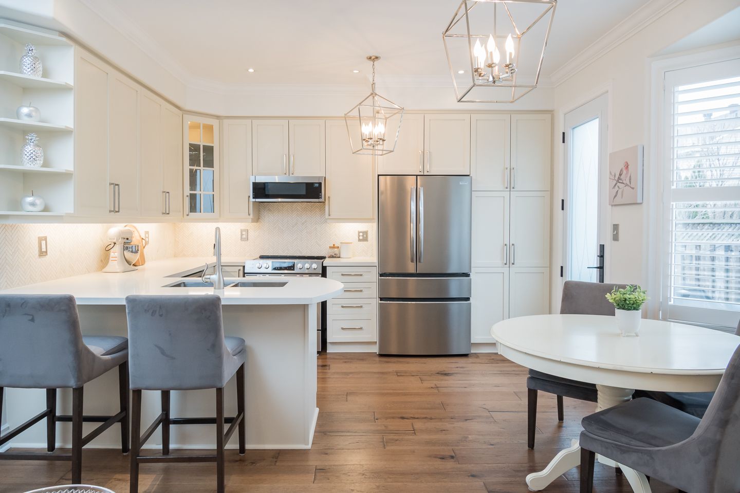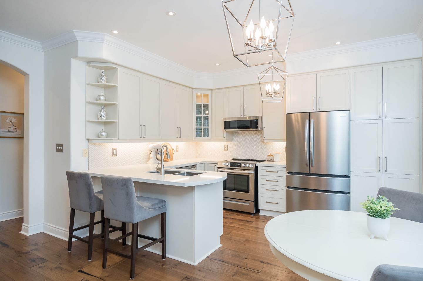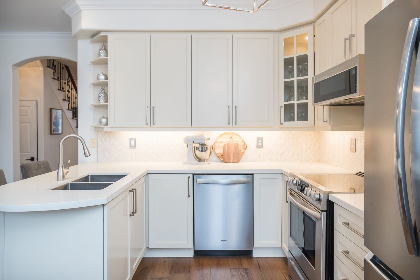 • Modern eat-in kitchen with quartz counters and stainless steel appliances.