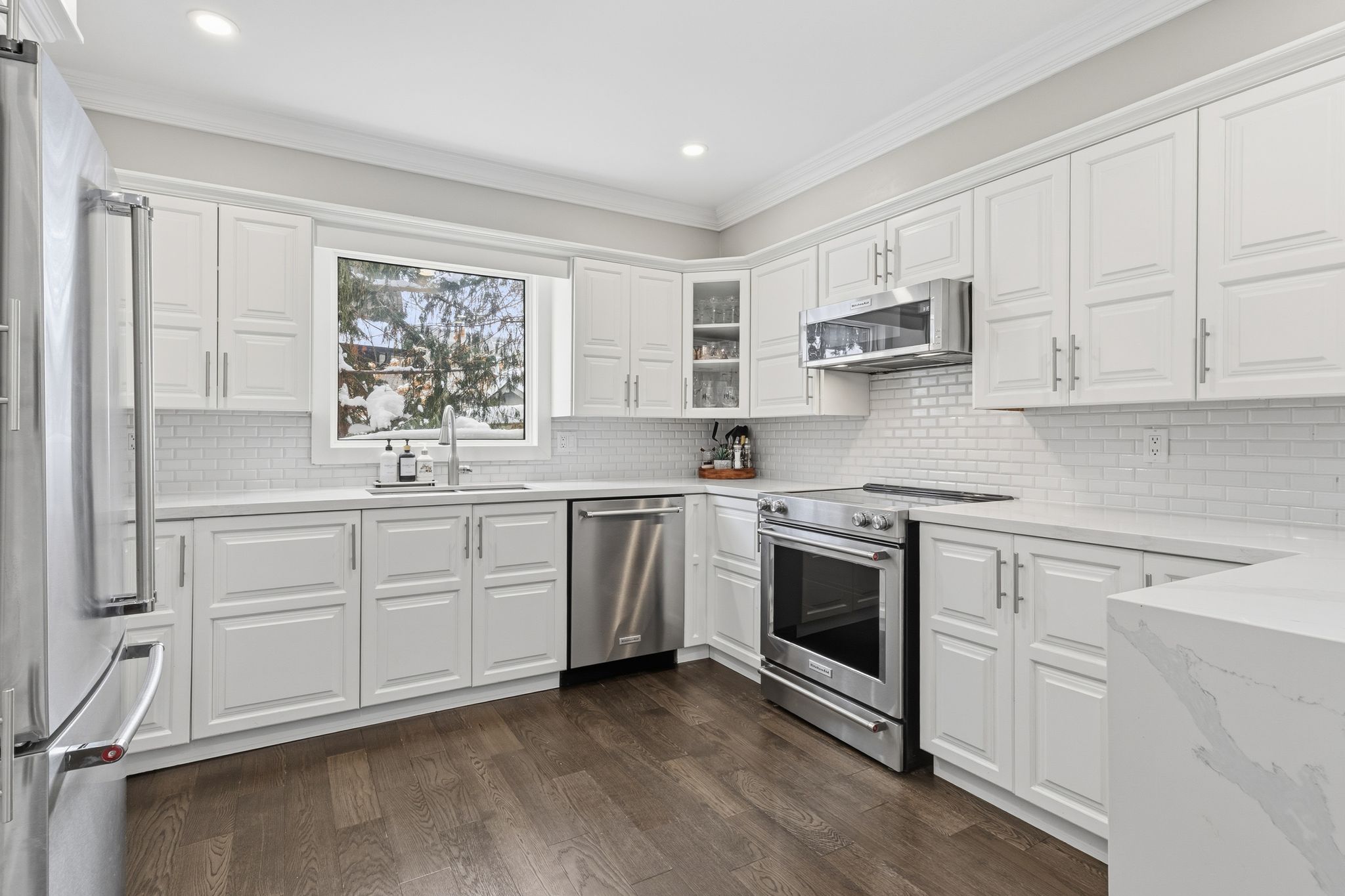 • Chef-inspired kitchen with quartz countertops and stainless steel appliances.