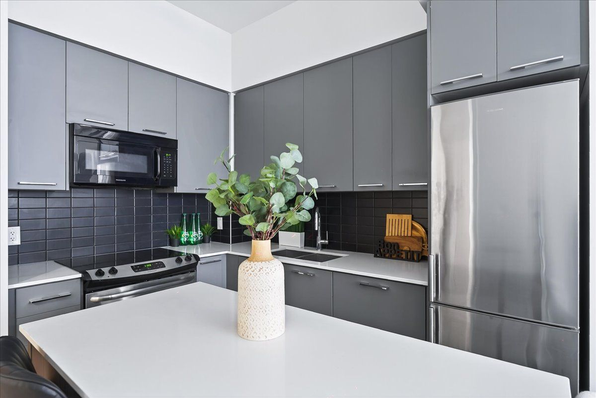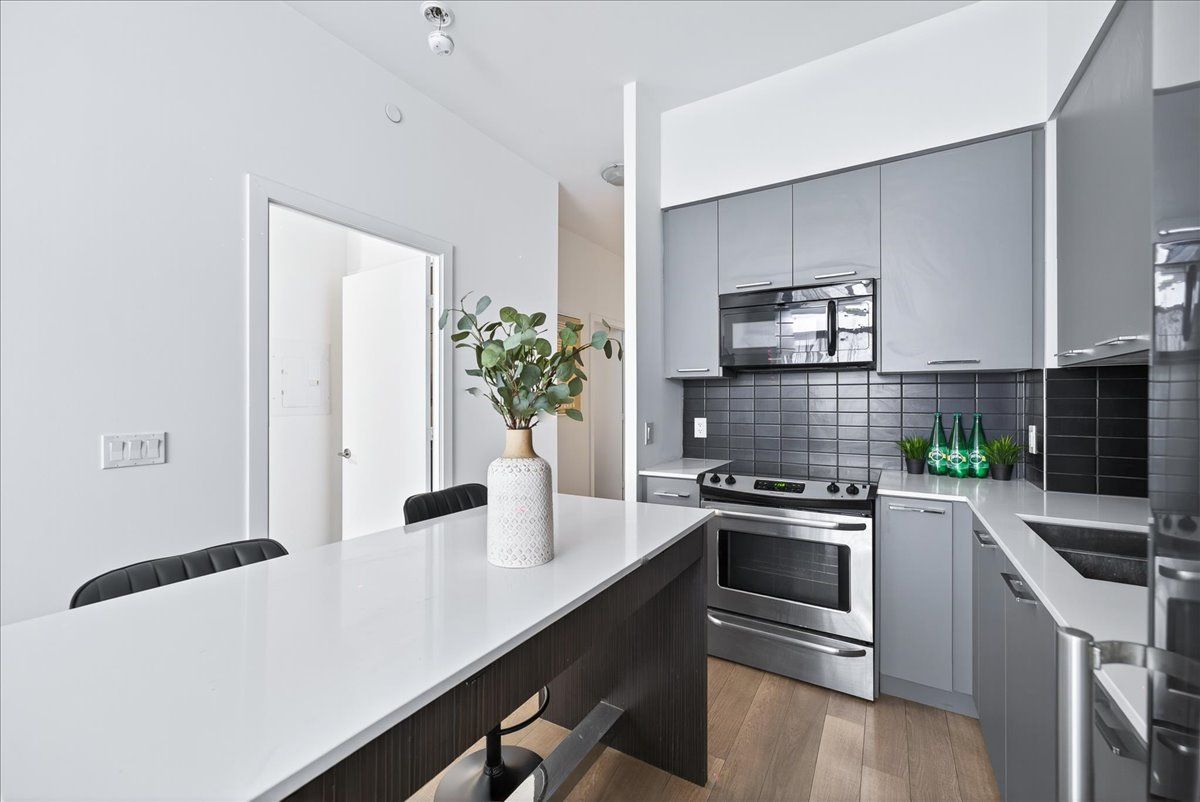• Contemporary kitchen with quartz countertops and large breakfast bar.