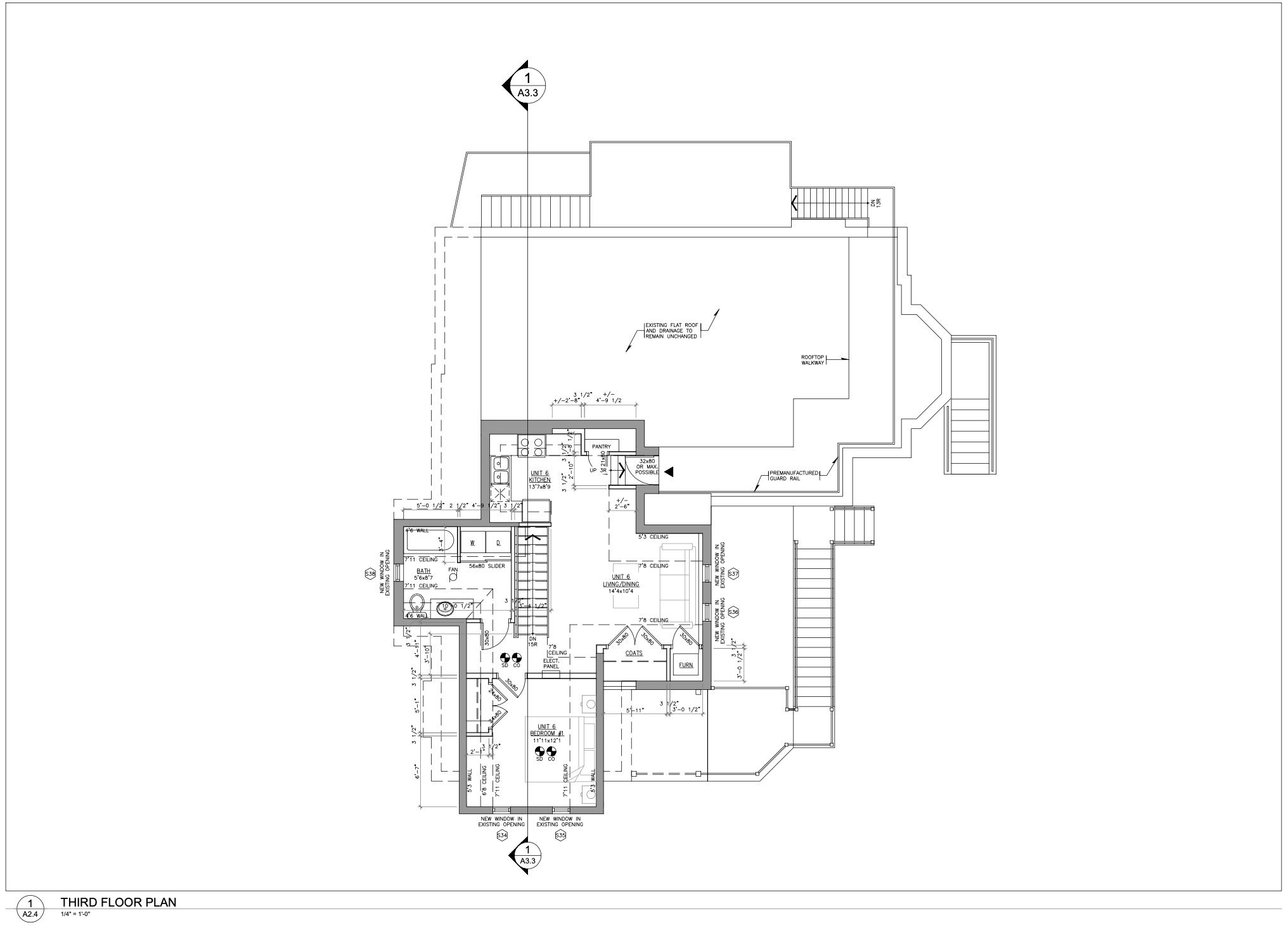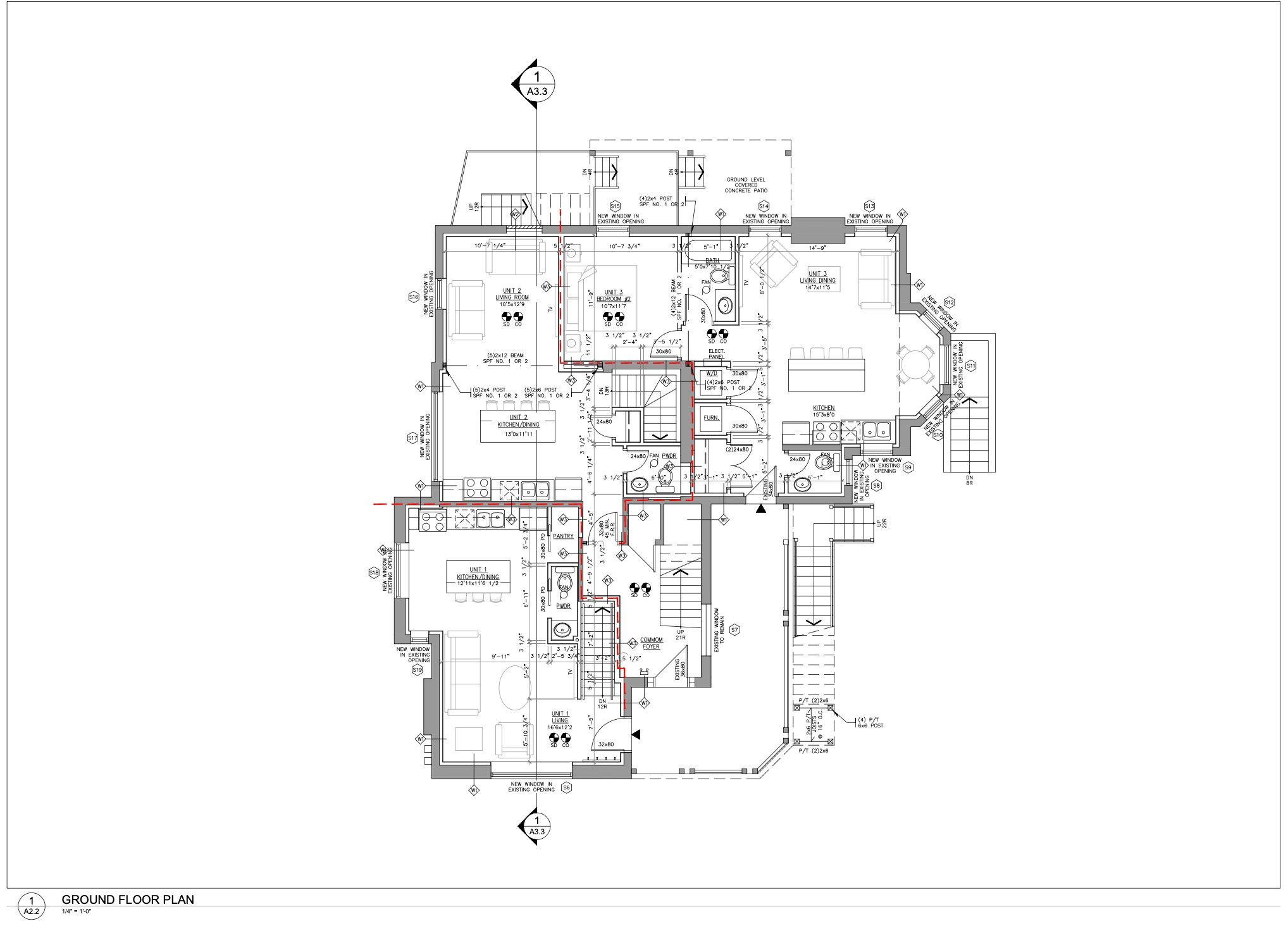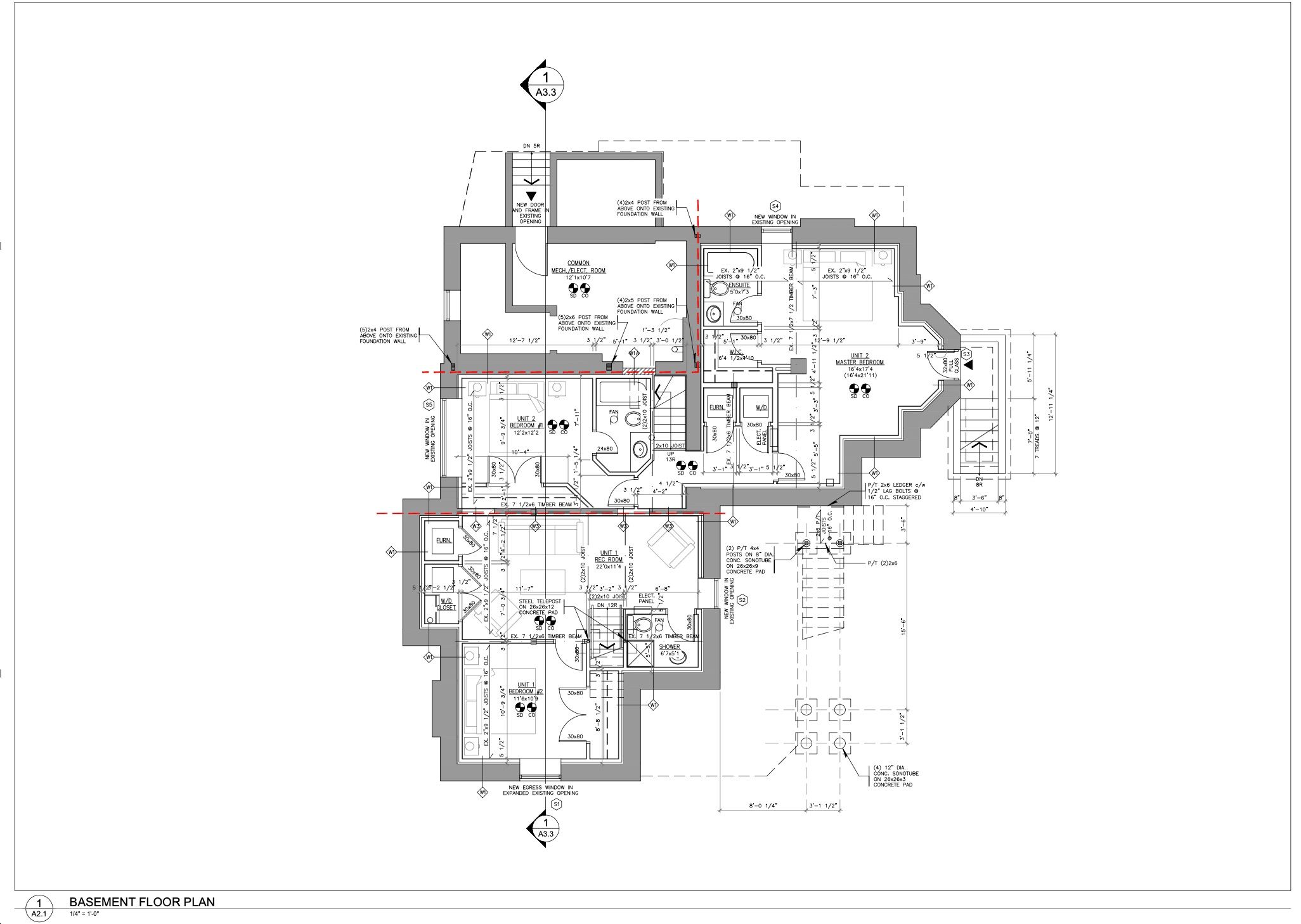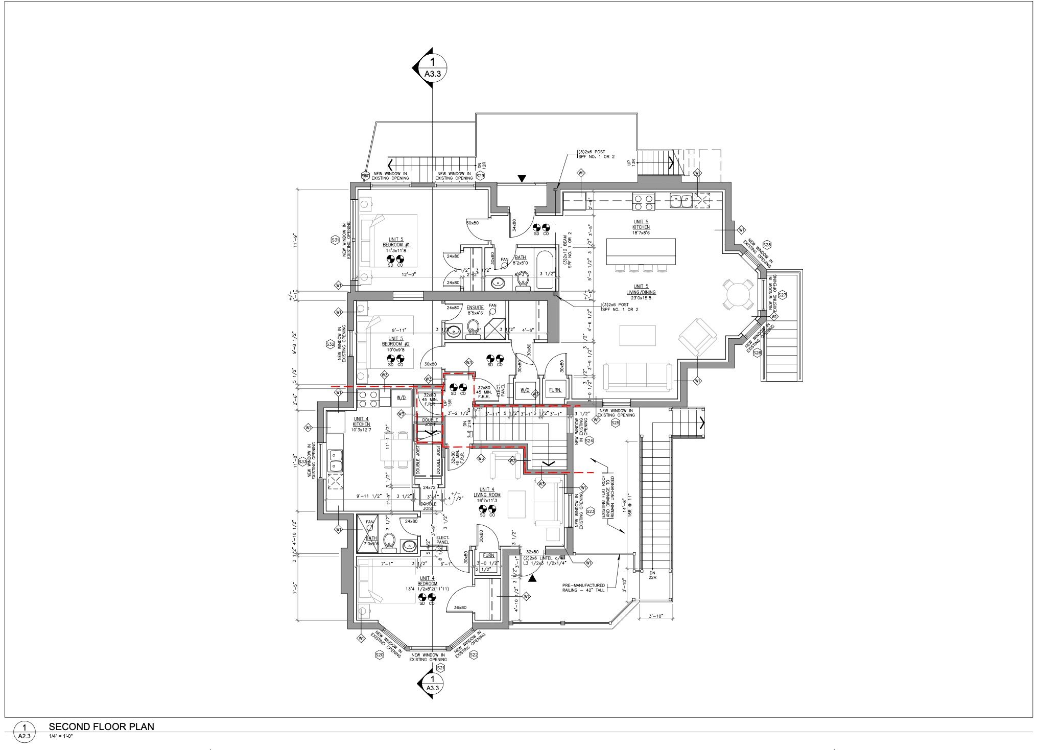 • Proposed layout for 4 one-bedroom and 2 two-bedroom apartments.