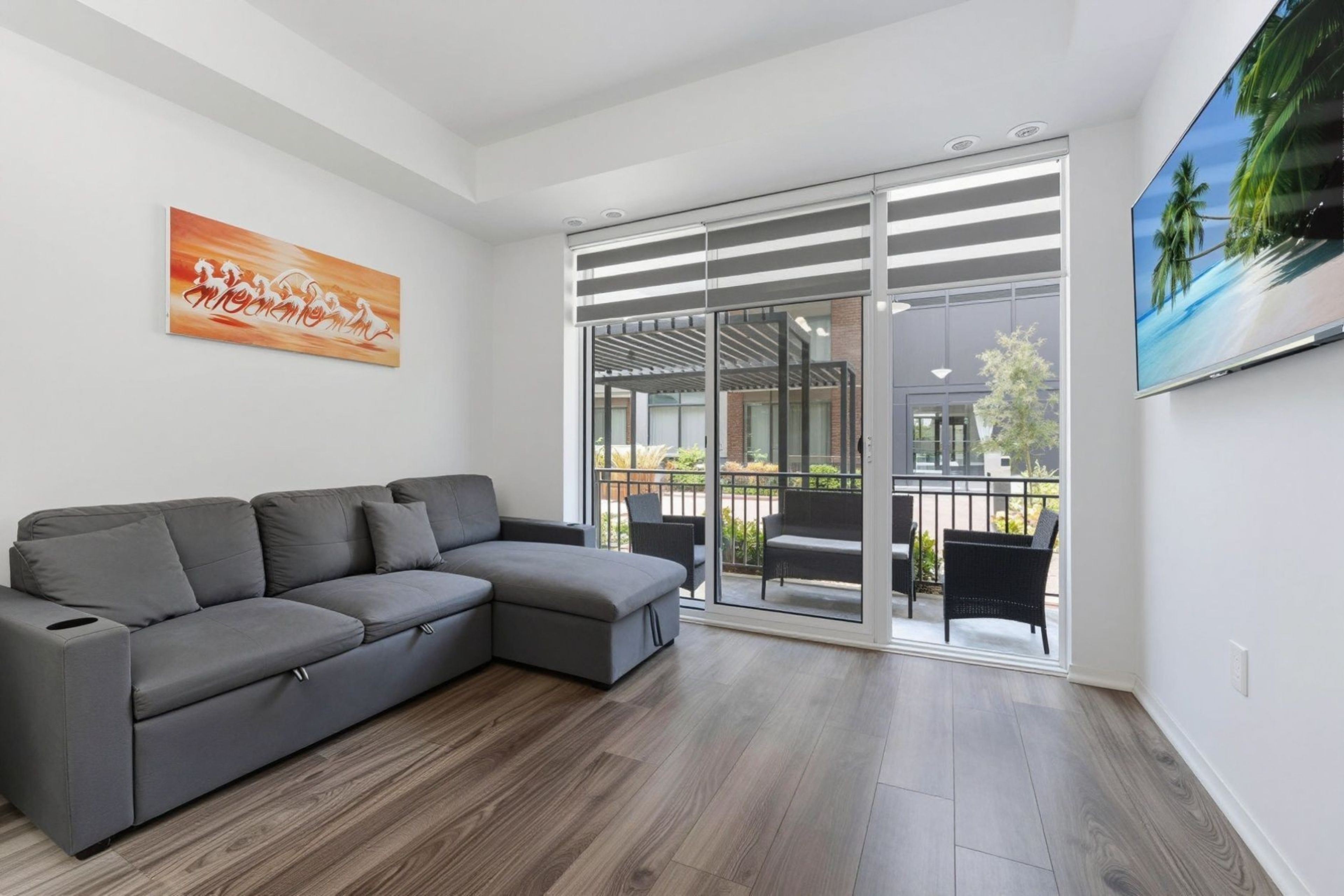 • Bright open-concept layout with high ceilings and modern laminate flooring.
