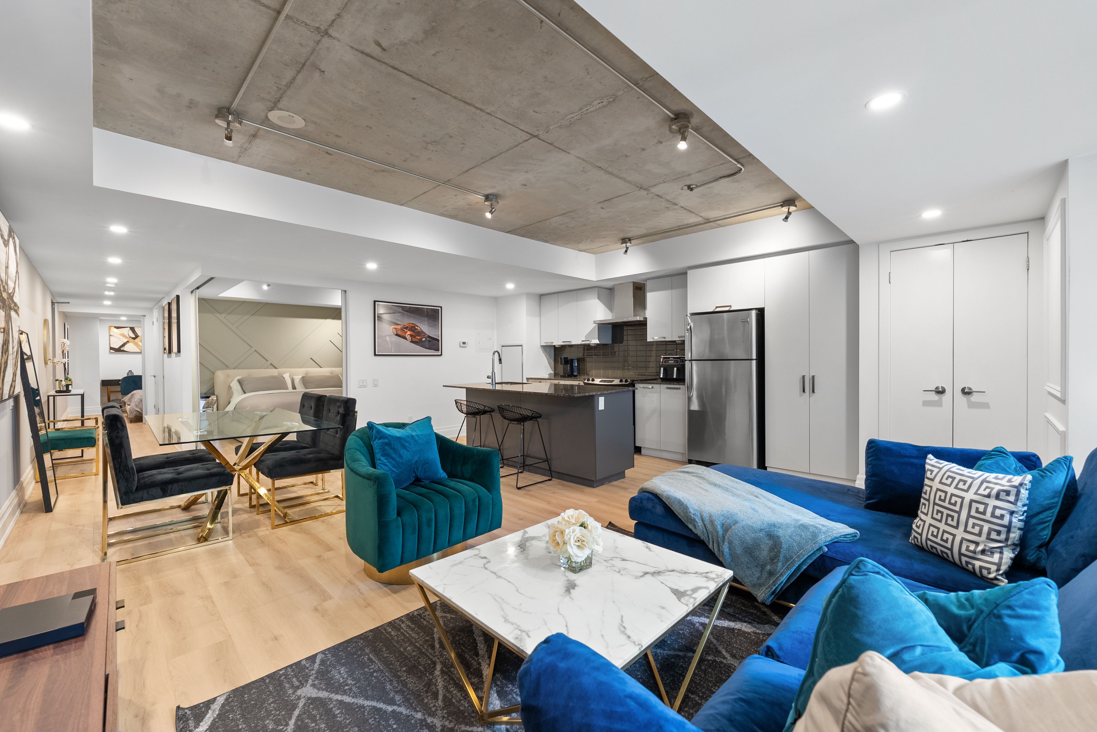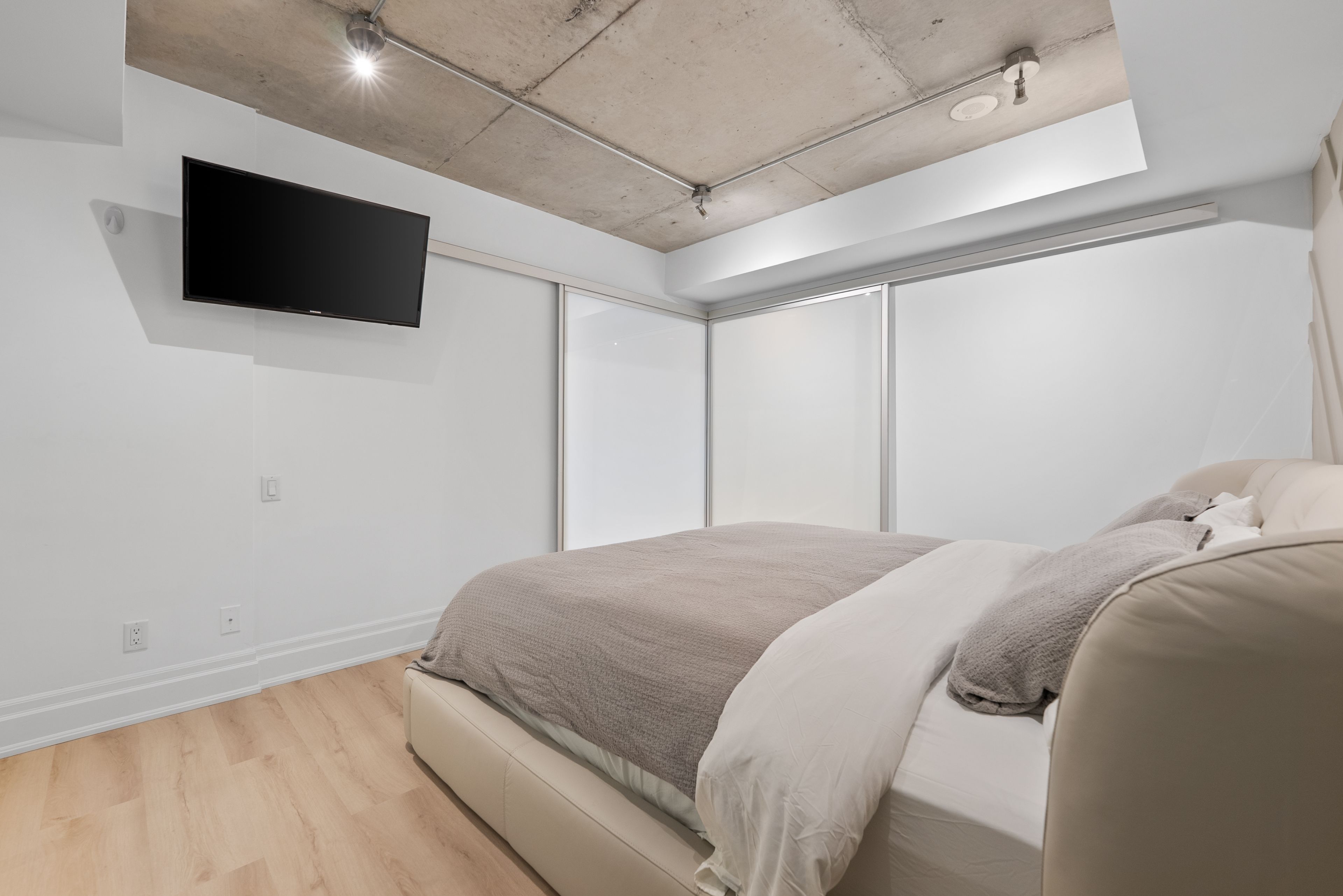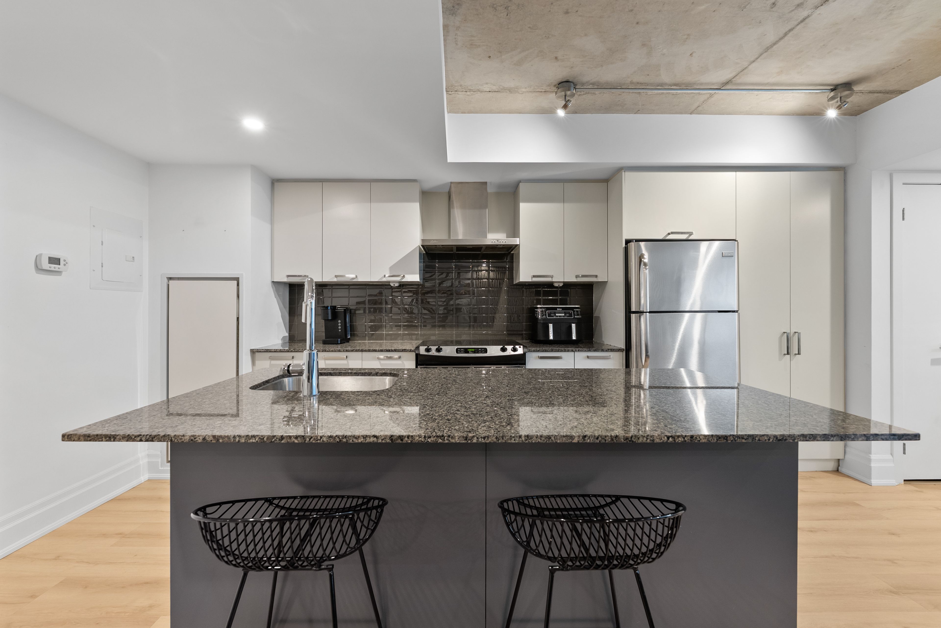 • Stylish exposed concrete ceilings and hardwood floors throughout.