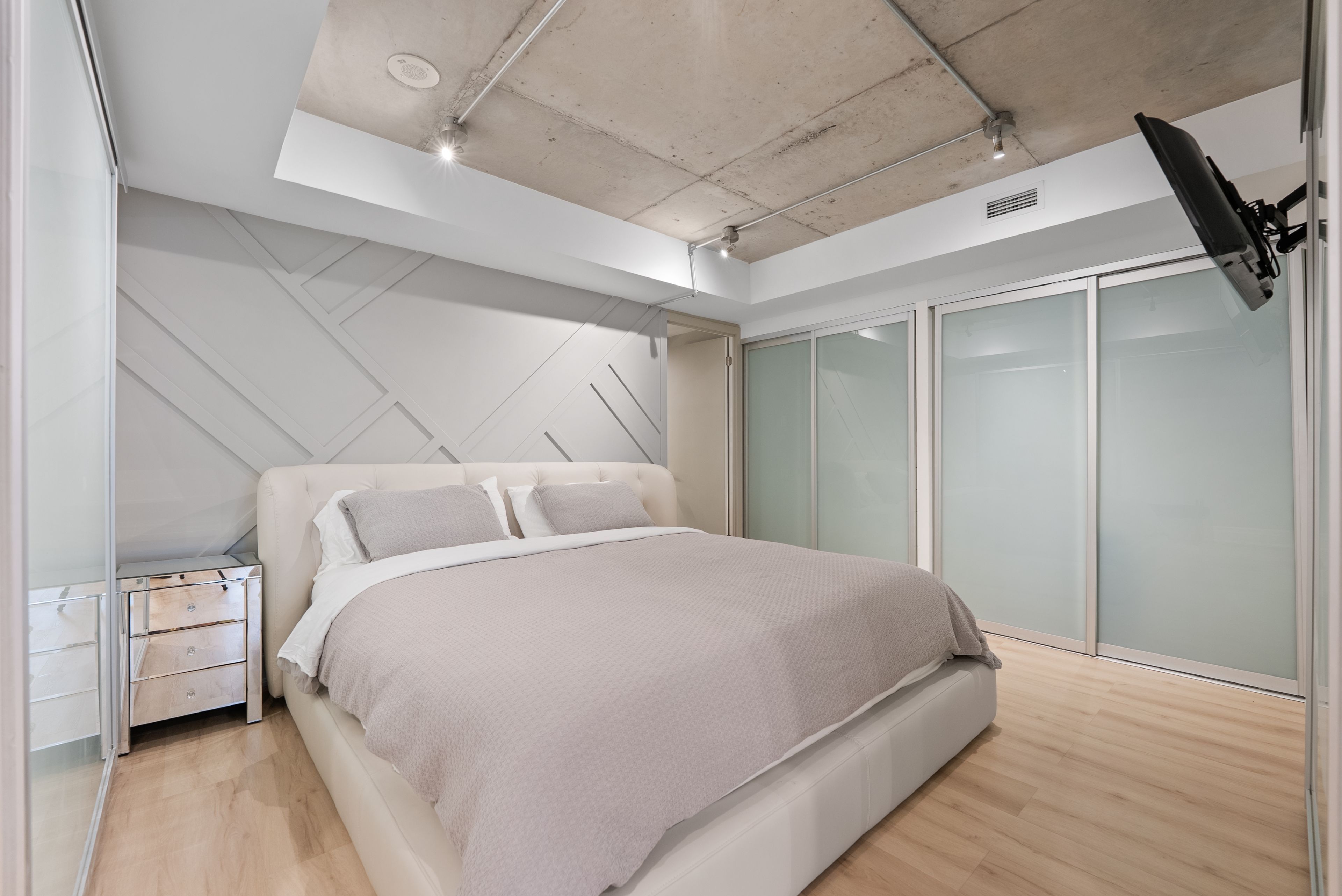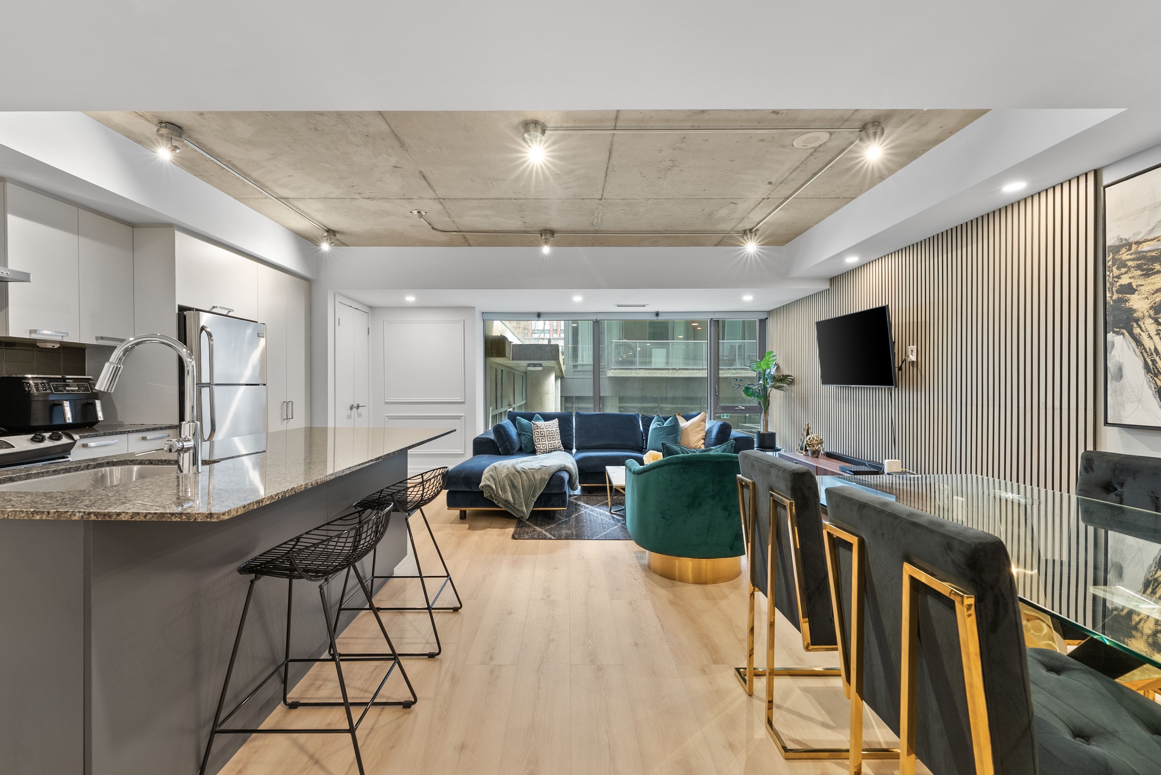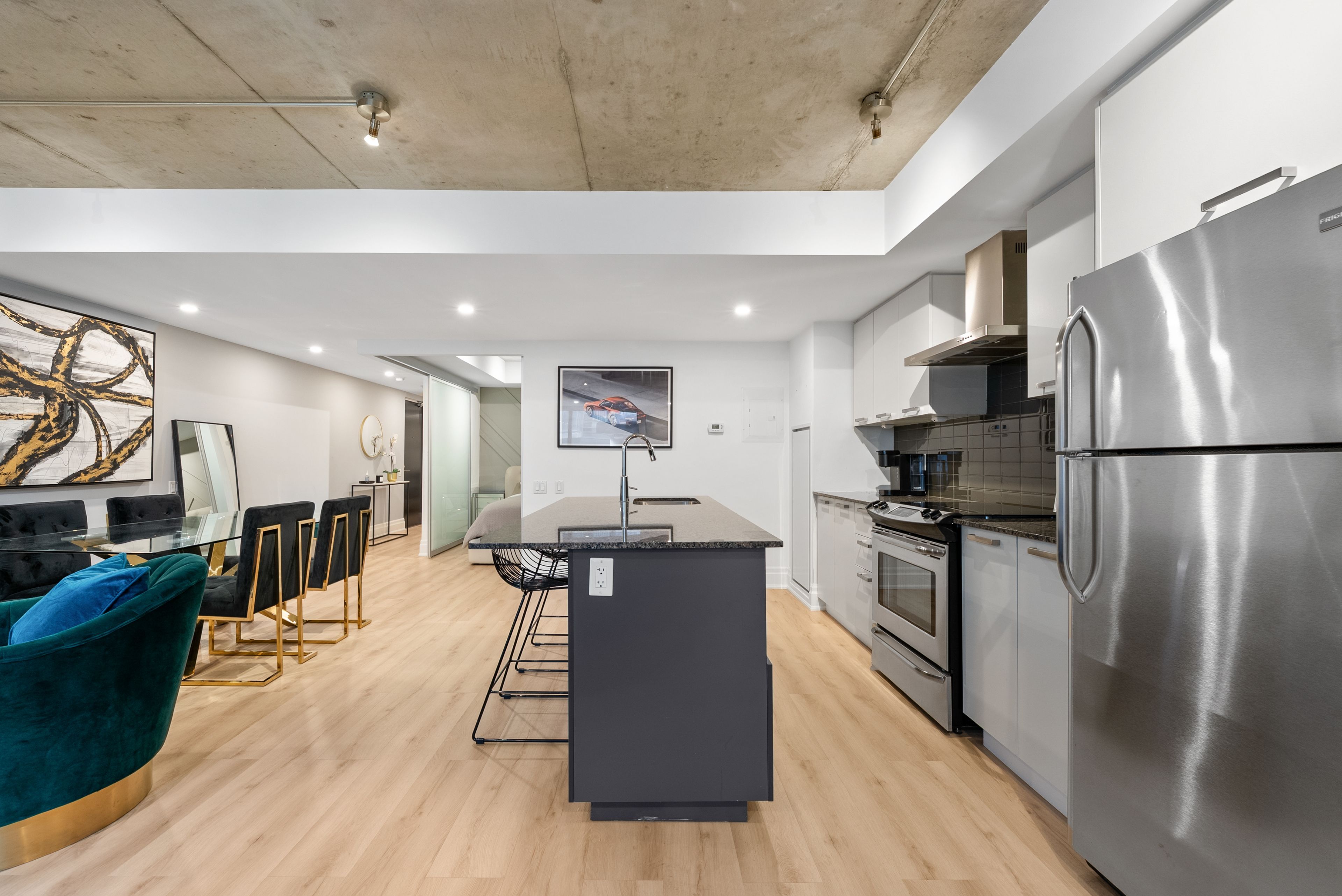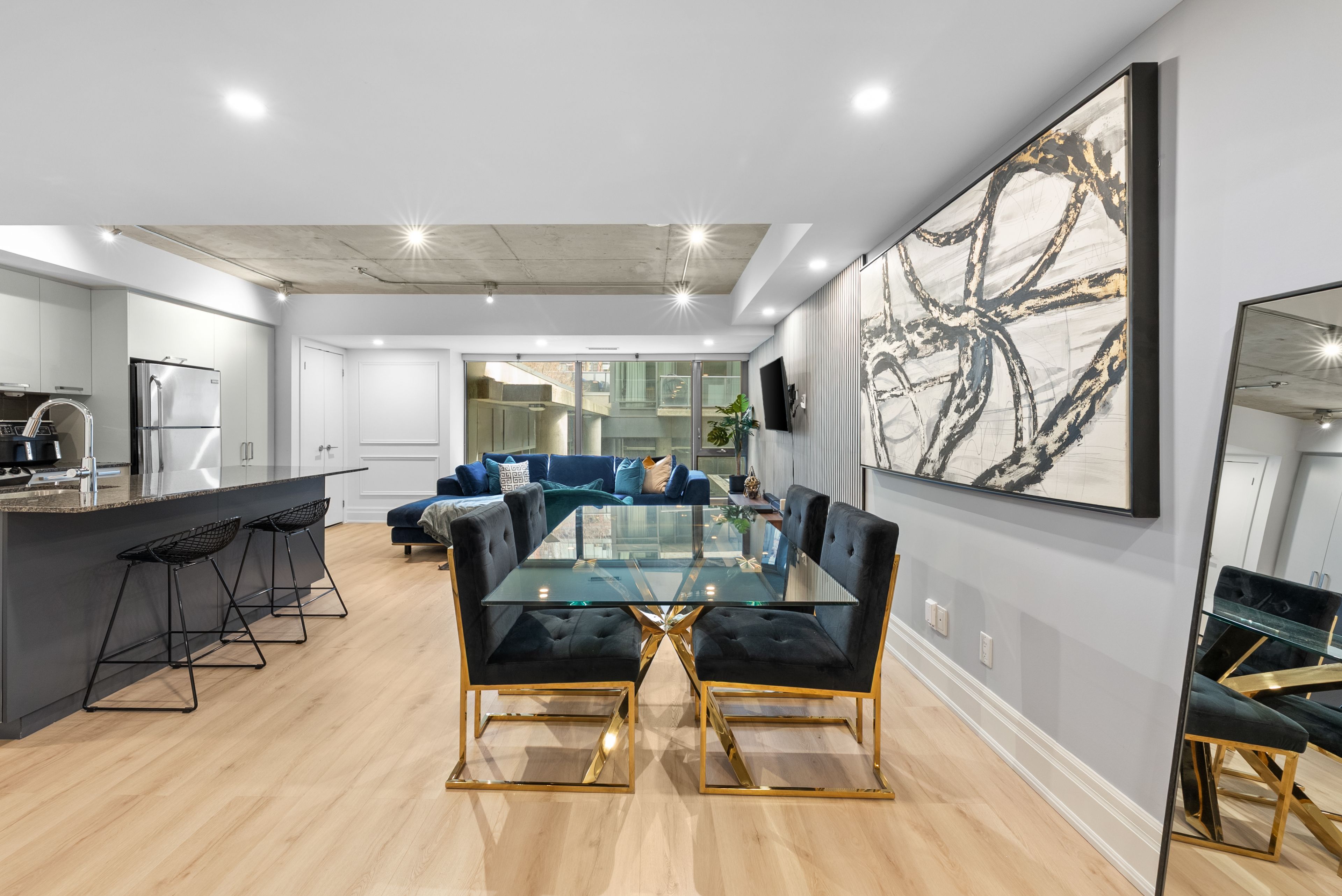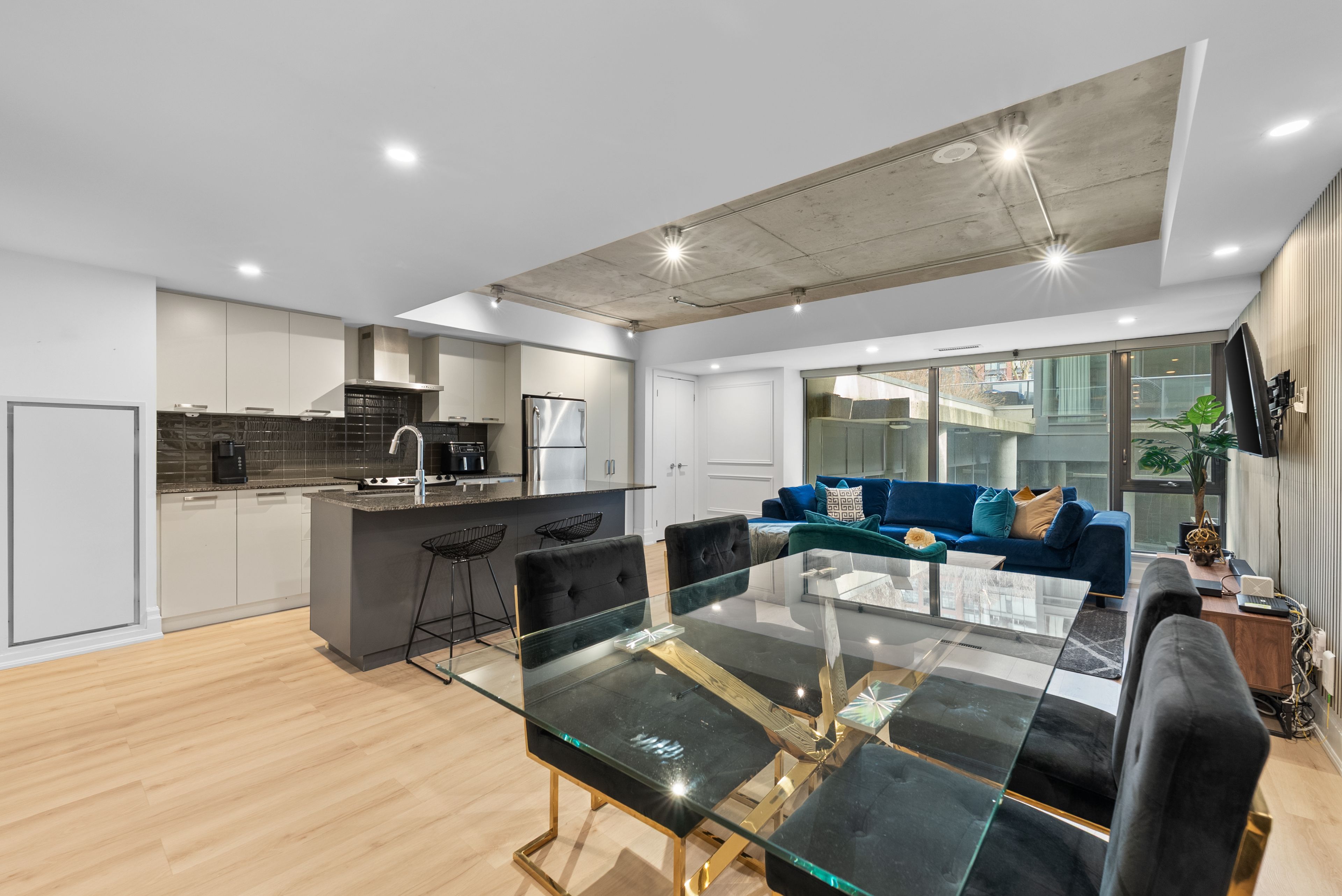 Move in tomorrow. This stunning two-bedroom, two-bathroom loft at 95 bathurst arrives fully furnished and styled - nothing to do but enjoy it. Soaring 9-foot exposed concrete ceilings, hardwood floors, stone countertops, and sleek modern cabinetry create a space that feels as vibrant as the fashion district it calls home. Generous closets, two full bathrooms, and an open-concept layout make it as liveable as it is beautiful. Steps to the city's best restaurants, cafés, nightlife, and the ttc. Fully furnished. Move-in ready.